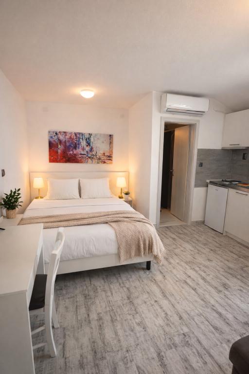 Villa Dalmacija znajduje się w Makarskiej, zaledwie 2 minuty spacerem od plaży i dysponuje bezpłatnym miejscem parkingowym. Wszystkie studia i apartamenty wyposażone są w klimatyzację, małą kuchnię z kuchenką i podstawowym wyposażeniem, małą lodówkę, łazienkę i telewizję satelitarną. Studio 2+1: jedno studio z łóżkiem francuskim i rozkładaną sofą dla 1 osoby, balkon (studio na pierwszym piętrze nie posiada balkonu). Studio 3+1: jedna sypialnia z łóżkiem francuskim i rozkładaną sofą dla 1 do 2 osób, zamknięty poddasze, wysoki parter. Apartament 2+2: sypialnia z łóżkiem małżeńskim i pokój dzienny z rozkładaną sofą dla 2 osób, taras. Apartamenty znajdują się na górnym parterze, na 2. lub 3. piętrze. Wi-Fi i parking są bezpłatne.