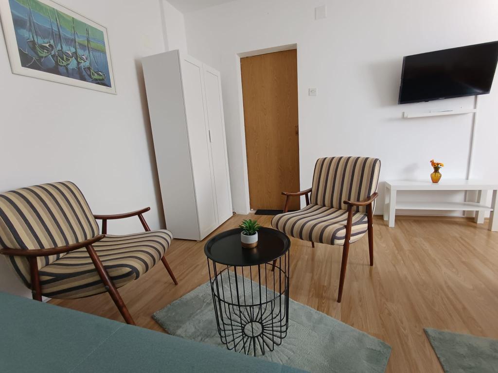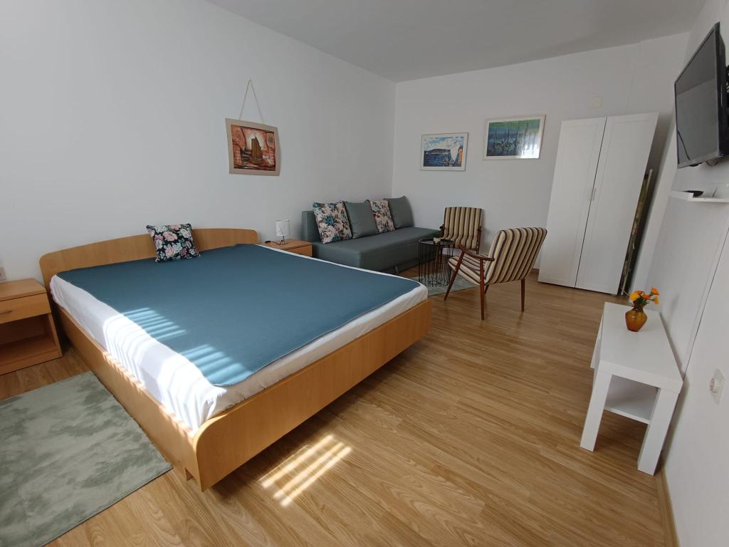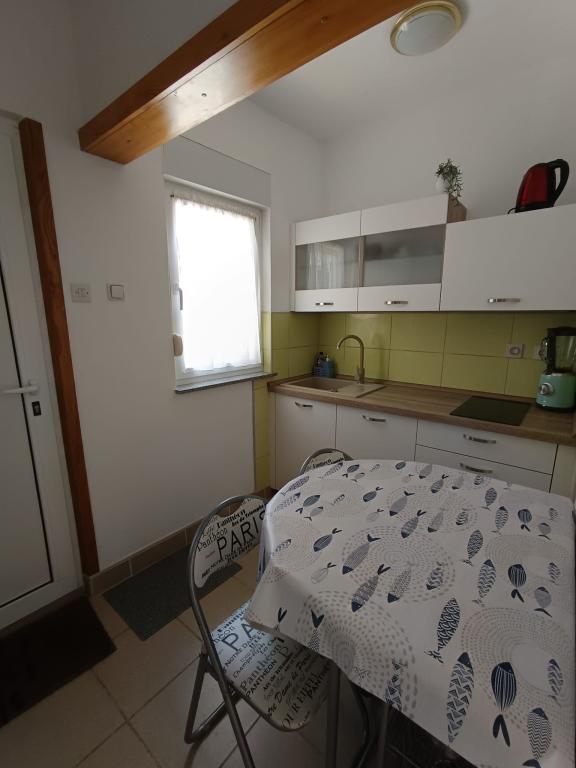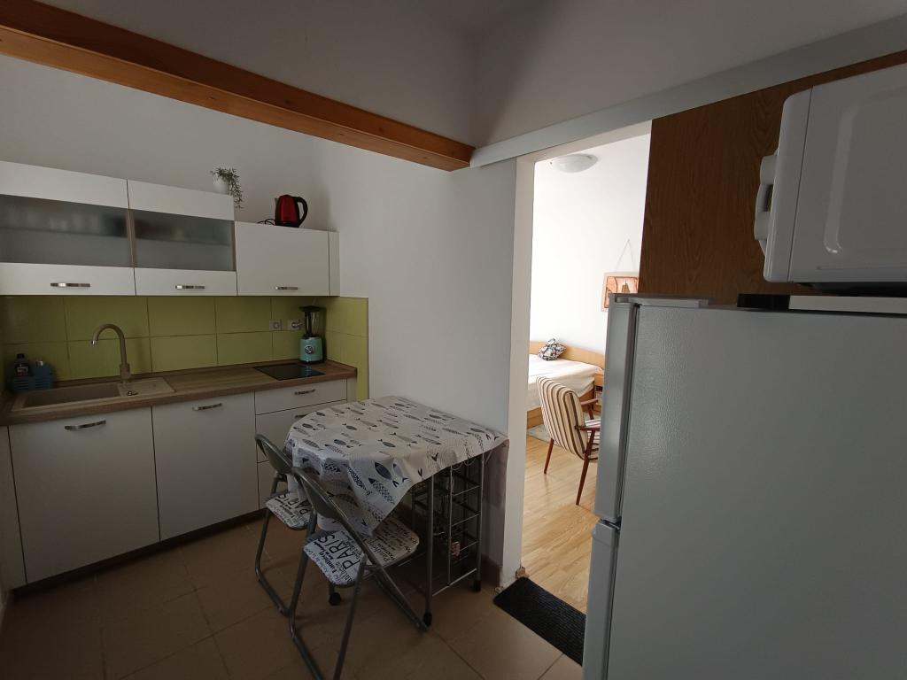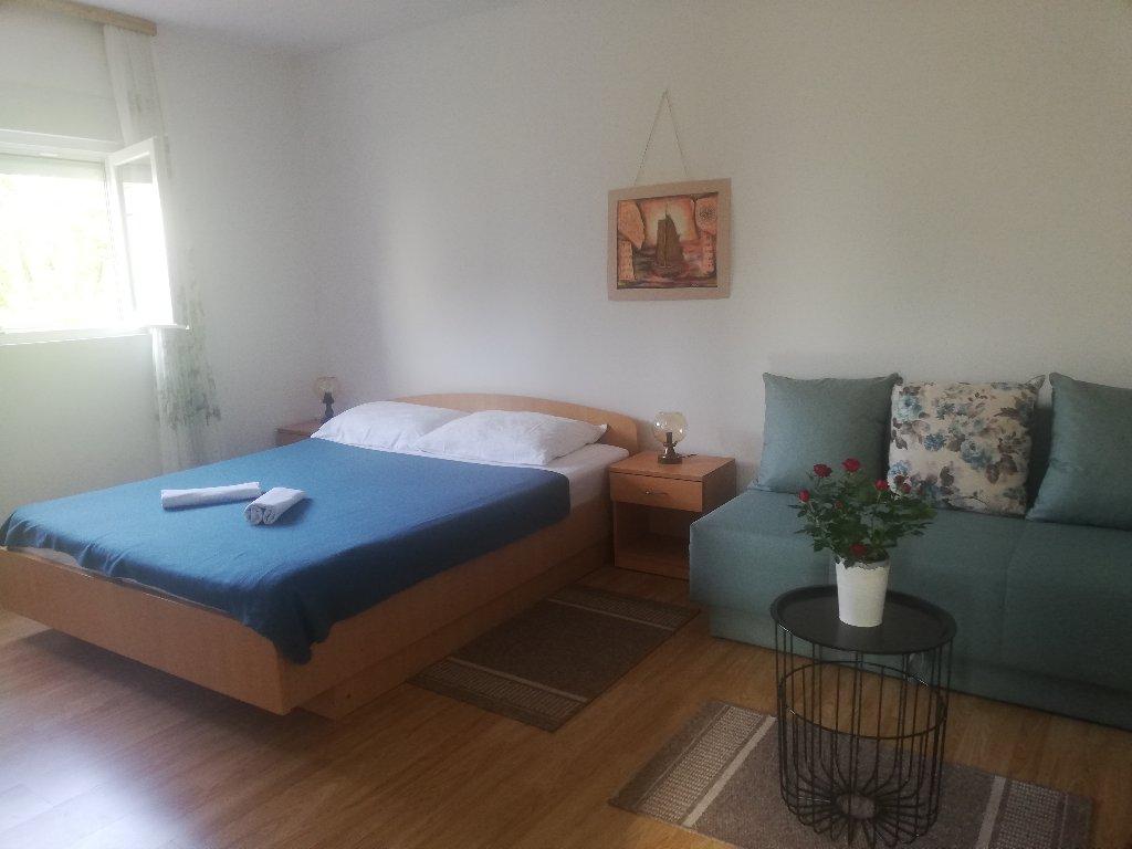 Kawalerka dla maksymalnie 3 osób, składa się z pokoju z łóżkiem małżeńskim i dostawką, kuchni, łazienki oraz tarasu. Parking dla samochodu znajduje się na podwórku domu. Mieszkanie jest w pełni umeblowane. Spacer do najbliższej plaży zajmuje 5-8 minut, aw pobliżu znajdują się sklepy, targ, centrum, restauracje, dworzec autobusowy... Plaże są głównie żwirowe i betonowe. Cicha lokalizacja.