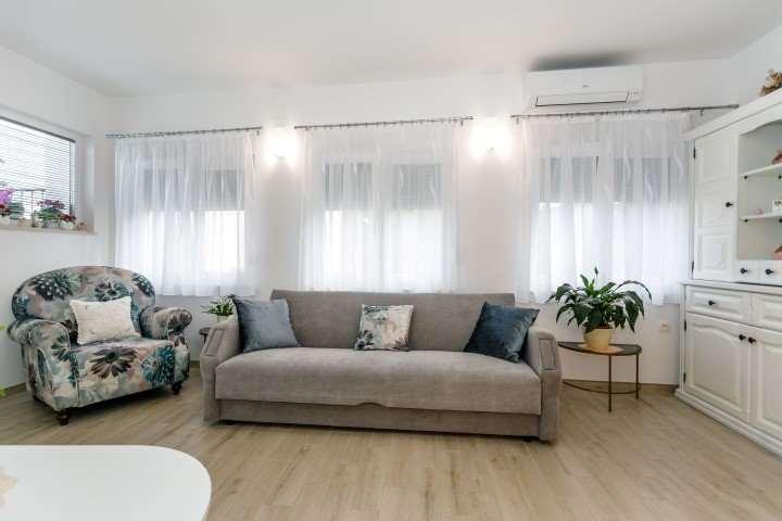 Apartamenty zlokalizowane są w krótkiej uliczce, która 50 metrów od samego początku oddziela się od głównej ulicy prowadzącej do hotelu Malim. Dom ma jedno piętro, w którym mieszkamy z mężem, a na parterze znajdują się 2 apartamenty, każdy z osobnym wejściem z przestronnymi tarasami. Apartamenty posiadają 1 dwuosobową sypialnię oraz sofę w salonie, którą w razie potrzeby można rozłożyć jako dodatkowe łóżko, co oprócz wszystkiego innego widać na zdjęciach. W apartamentach znajduje się żelazko z deską do prasowania oraz suszarka do włosów. Ulica pod nami nazywa się Obala i jest to wybrzeże z plażami rozciągającymi się od hotelu aż do centrum miasta.