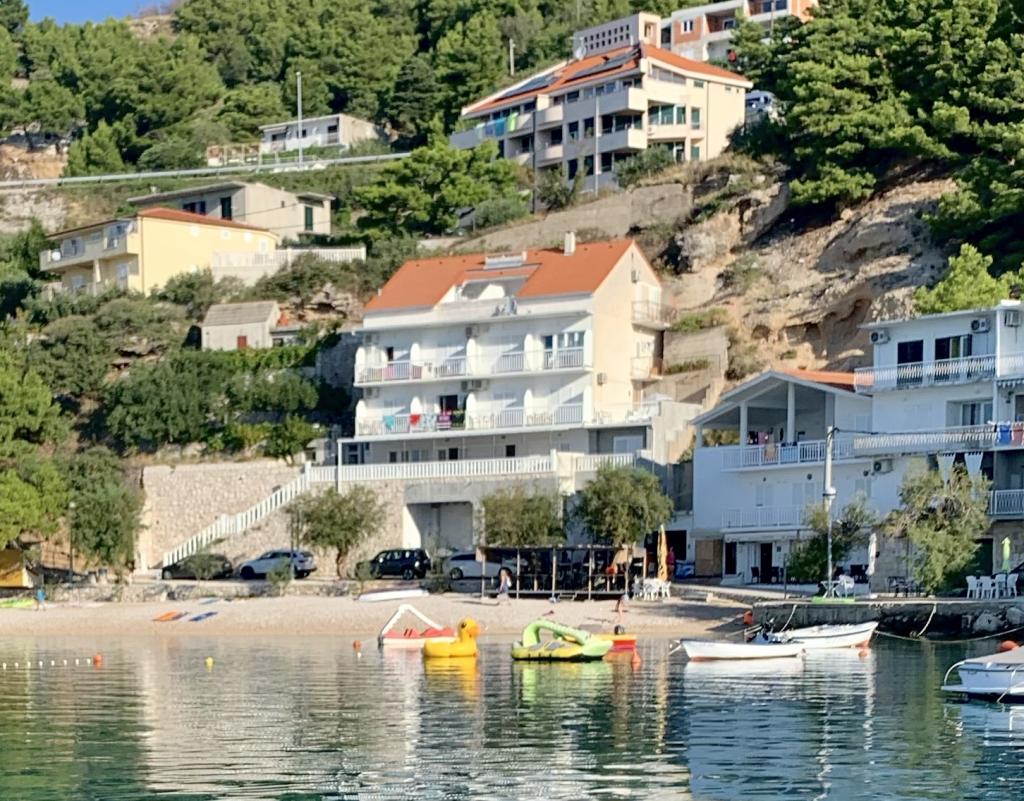 Spiro Apartamenty znajdują się w Mimice, małym miasteczku na wybrzeżu Adriatyku, w odległości 35 km od Splitu. Zbudowany na kaskadowe tereny z widokiem na plażę w zatoce juto, położony tuż nad brzegiem morza, które zapewni Ci wyjątkową okazję spędzenia wakacji w pokoju lub apartamentu na plaży w idyllicznej miejscowości Dalmacji, która jest dobrze podłączony do ośrodków turystycznych w Splicie (35 km), Omis (14 km ), Makarska (25 km), a nie na wycieczkę do Dubrownika (180 km) lub statkiem do Brac nie jest wykonalne.
