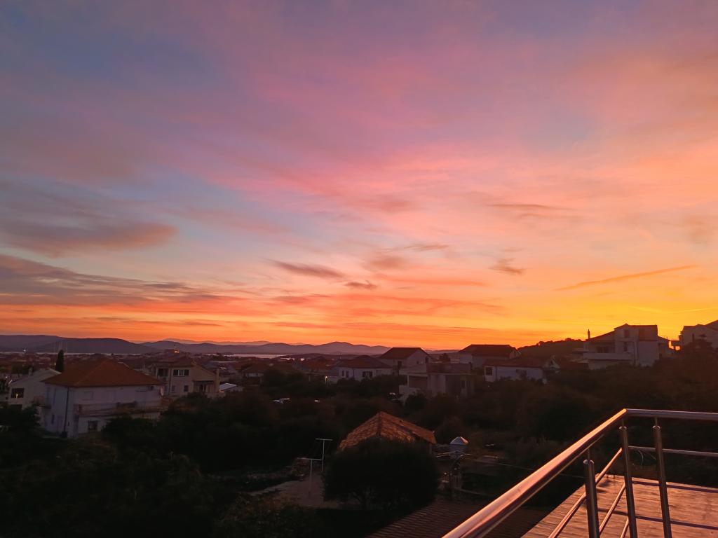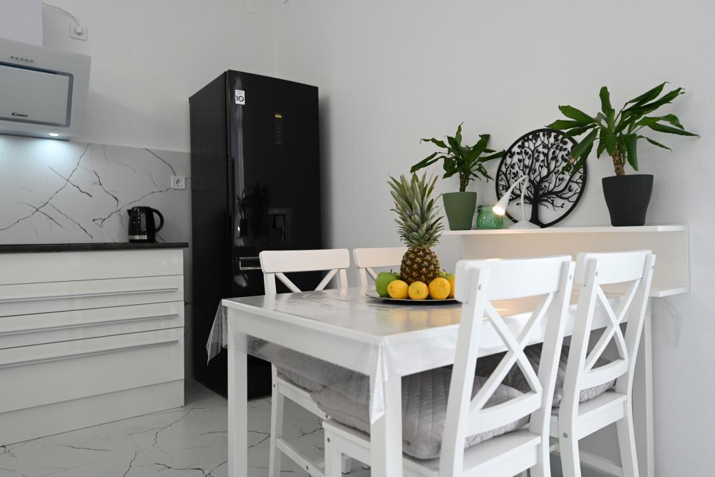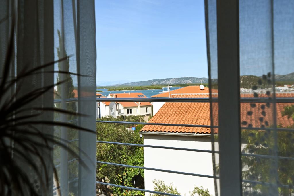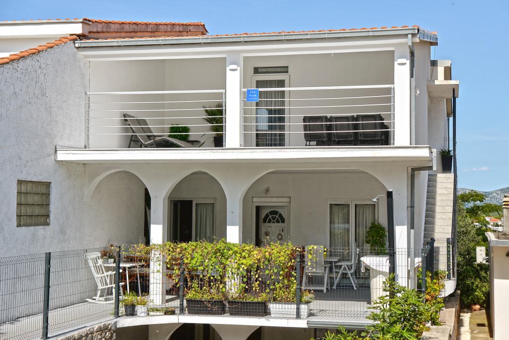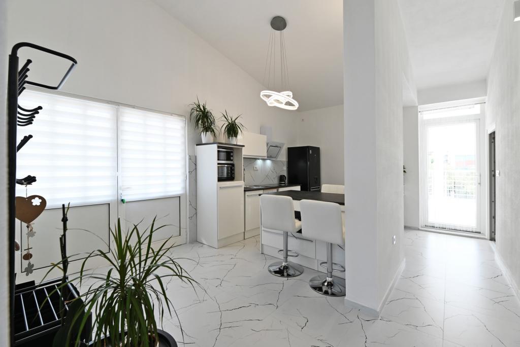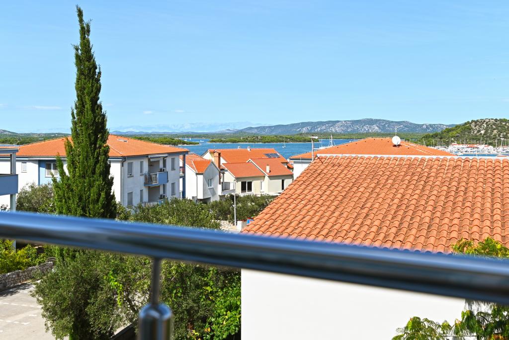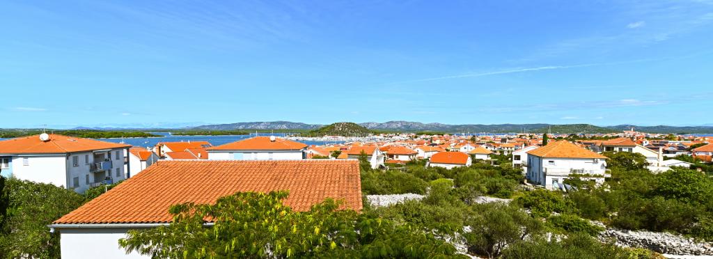 Nowocześnie urządzony i nowocześnie wyposażony apartament o powierzchni 70 m² na pierwszym piętrze domu rodzinnego. Apartament posiada osobne wejście i widok na morze z małego tarasu, który łączy się z salonem dużą, przeszkloną ścianą, rozciągającą się niemal na całą jego długość. Z apartamentu można podziwiać wyspy Murter i morze, panoramę miasta, a w oddali Velebit, Betinę i morze wokół Betiny, popijając poranną kawę w swojej oazie spokoju, ponieważ całe piętro jest wyłącznie do Państwa dyspozycji. Z jadalni mają Państwo dostęp do dużego, 30-metrowego tarasu, na którym przy dużym, szklanym stole ogrodowym mogą Państwo delektować się śniadaniem, obiadem lub kolacją. Oferujemy przenośny grill elektryczny, dzięki któremu mogą Państwo przyrządzać na tarasie dania, na przykład owoce morza, które można codziennie kupić na kutrze lub na targu rybnym w centrum Murter. Łazienka jest duża, z wejściem od wejścia. Cały apartament ma wysokość galerii. Bezpłatny parking znajduje się przed domem. Dostępny jest również bezpłatny dostęp do Wi-Fi.