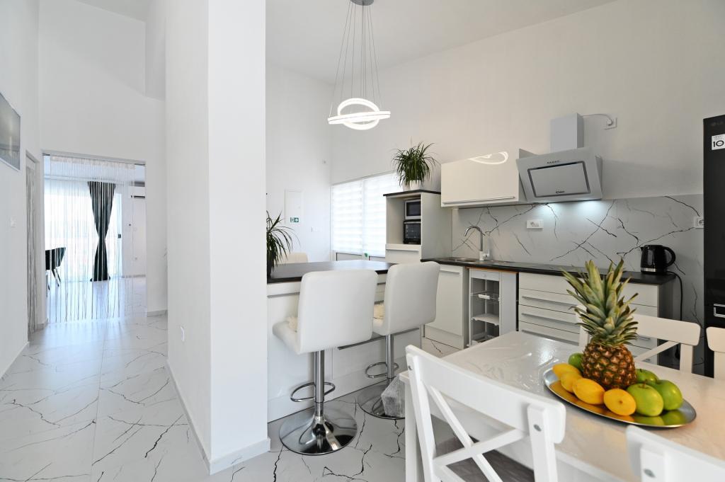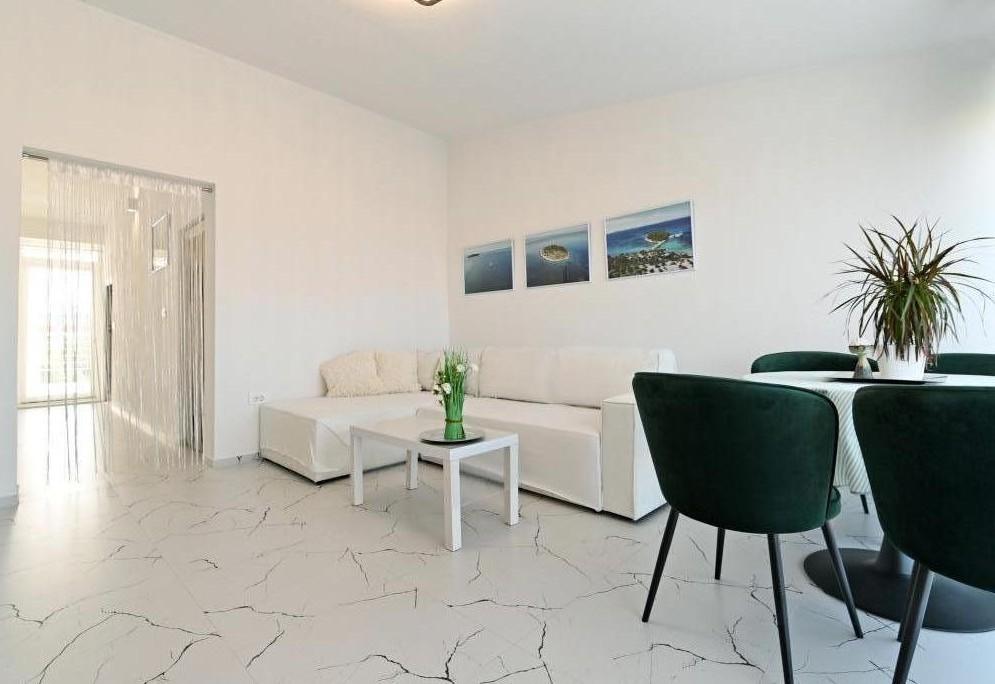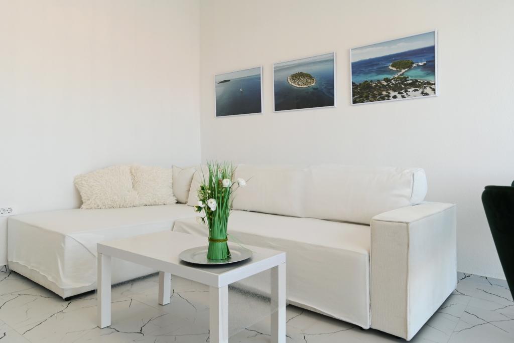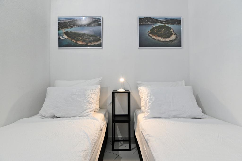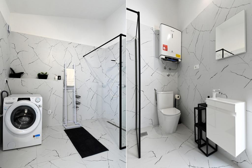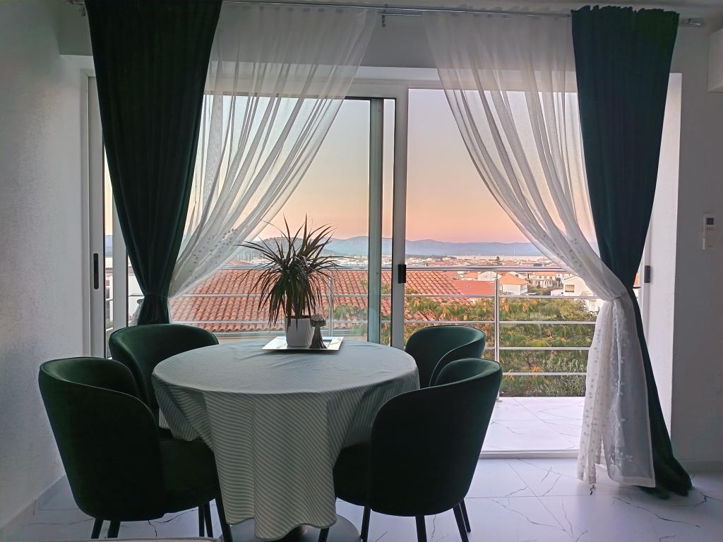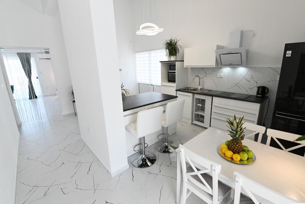 Nowocześnie urządzony i nowocześnie wyposażony apartament o powierzchni 70 m² na pierwszym piętrze domu rodzinnego. Apartament posiada osobne wejście i widok na morze z małego tarasu, który łączy się z salonem dużą, przeszkloną ścianą, rozciągającą się niemal na całą jego długość. Z apartamentu można podziwiać wyspy Murter i morze, panoramę miasta, a w oddali Velebit, Betinę i morze wokół Betiny, popijając poranną kawę w swojej oazie spokoju, ponieważ całe piętro jest wyłącznie do Państwa dyspozycji. Z jadalni mają Państwo dostęp do dużego, 30-metrowego tarasu, na którym przy dużym, szklanym stole ogrodowym mogą Państwo delektować się śniadaniem, obiadem lub kolacją. Oferujemy przenośny grill elektryczny, dzięki któremu mogą Państwo przyrządzać na tarasie dania, na przykład owoce morza, które można codziennie kupić na kutrze lub na targu rybnym w centrum Murter. Łazienka jest duża, z wejściem od wejścia. Cały apartament ma wysokość galerii. Bezpłatny parking znajduje się przed domem. Dostępny jest również bezpłatny dostęp do Wi-Fi.