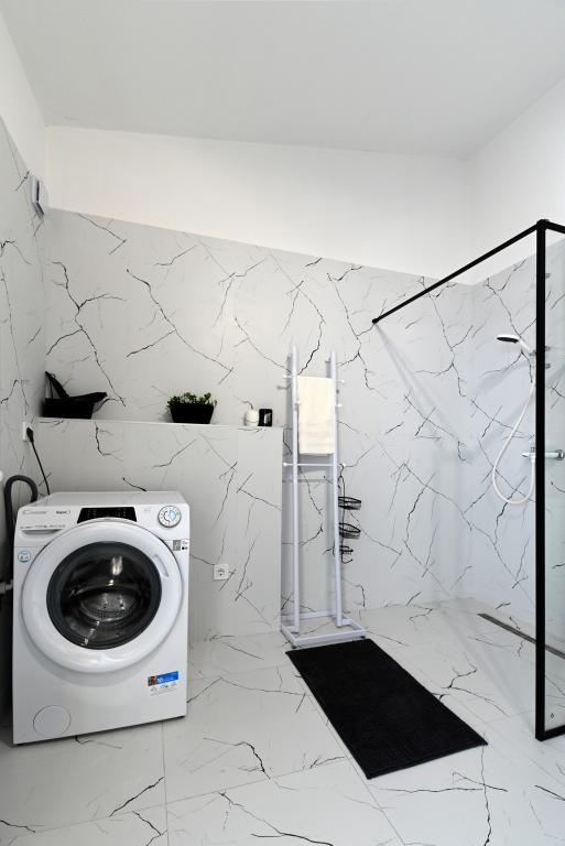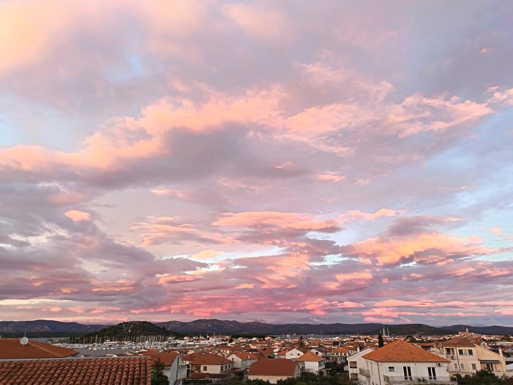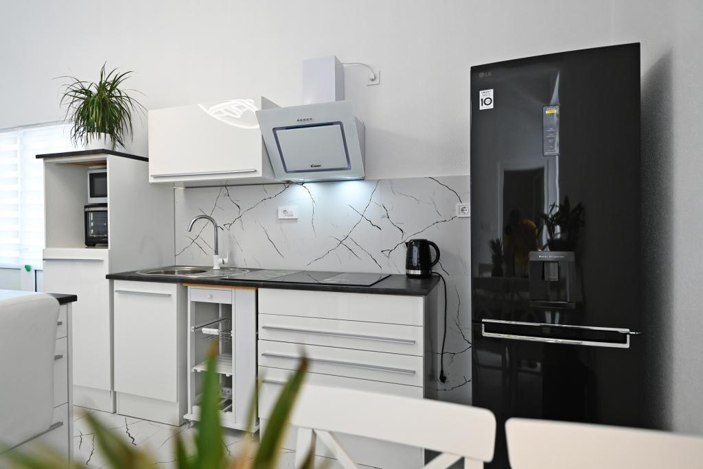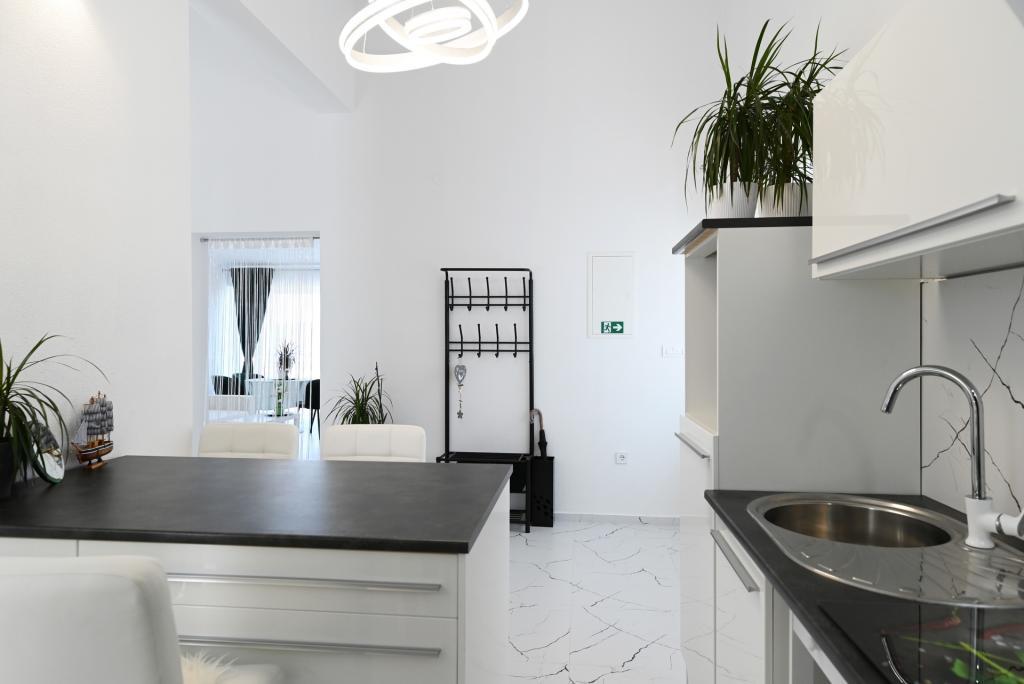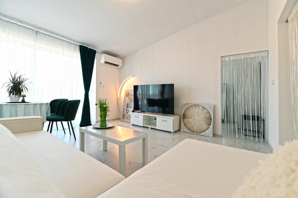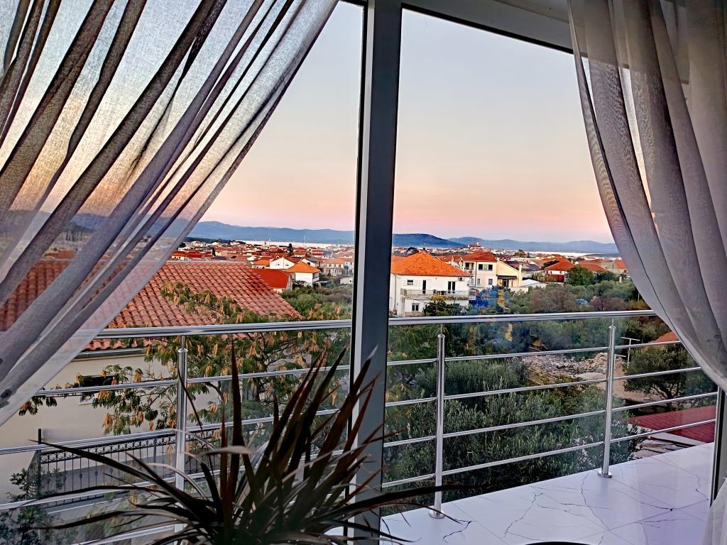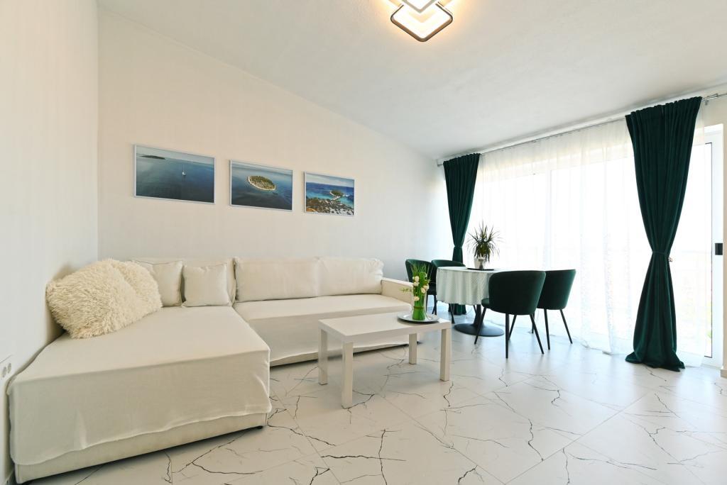 Nowocześnie urządzony i nowocześnie wyposażony apartament o powierzchni 70 m² na pierwszym piętrze domu rodzinnego. Apartament posiada osobne wejście i widok na morze z małego tarasu, który łączy się z salonem dużą, przeszkloną ścianą, rozciągającą się niemal na całą jego długość. Z apartamentu można podziwiać wyspy Murter i morze, panoramę miasta, a w oddali Velebit, Betinę i morze wokół Betiny, popijając poranną kawę w swojej oazie spokoju, ponieważ całe piętro jest wyłącznie do Państwa dyspozycji. Z jadalni mają Państwo dostęp do dużego, 30-metrowego tarasu, na którym przy dużym, szklanym stole ogrodowym mogą Państwo delektować się śniadaniem, obiadem lub kolacją. Oferujemy przenośny grill elektryczny, dzięki któremu mogą Państwo przyrządzać na tarasie dania, na przykład owoce morza, które można codziennie kupić na kutrze lub na targu rybnym w centrum Murter. Łazienka jest duża, z wejściem od wejścia. Cały apartament ma wysokość galerii. Bezpłatny parking znajduje się przed domem. Dostępny jest również bezpłatny dostęp do Wi-Fi.