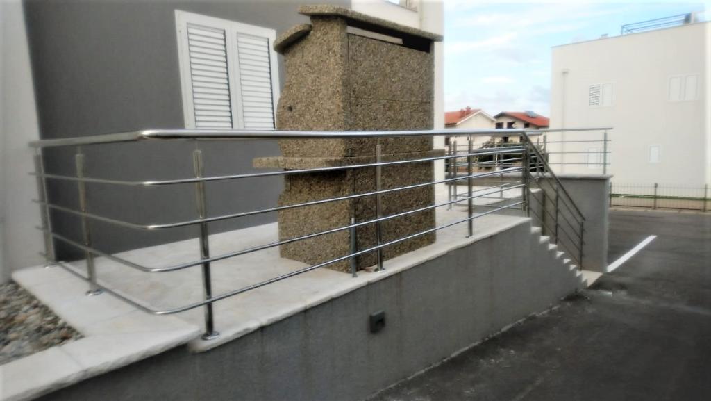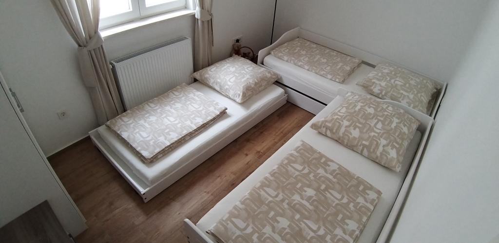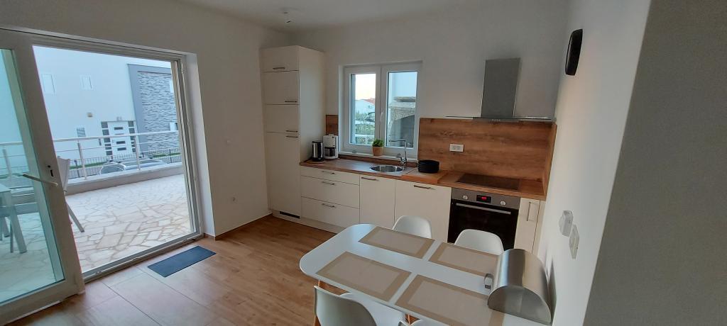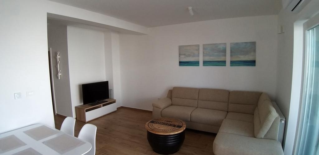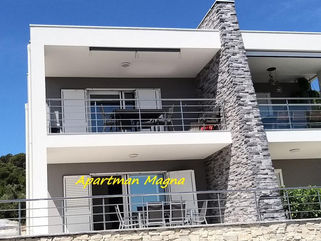 Apartament "MAGNA" położony jest w bezpośrednim sąsiedztwie plaży miejskiej, 1000 m od centrum miejscowości i oferuje piękny widok na morze. Mieszkanie ma powierzchnię 60 m2, posiada dwie sypialnie, w których może nocować do 5 osób dorosłych. Mieszkanie znajduje się na parterze (widocznym na zdjęciu) i goście mają dostęp do tarasu z grillem. Parking znajduje się przed domem i jest wliczony w cenę. Zwierzęta nie są akceptowane.