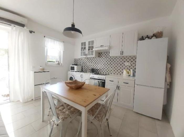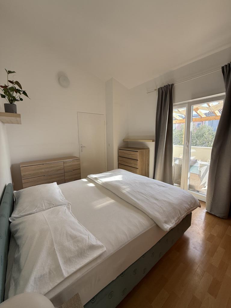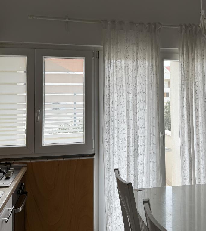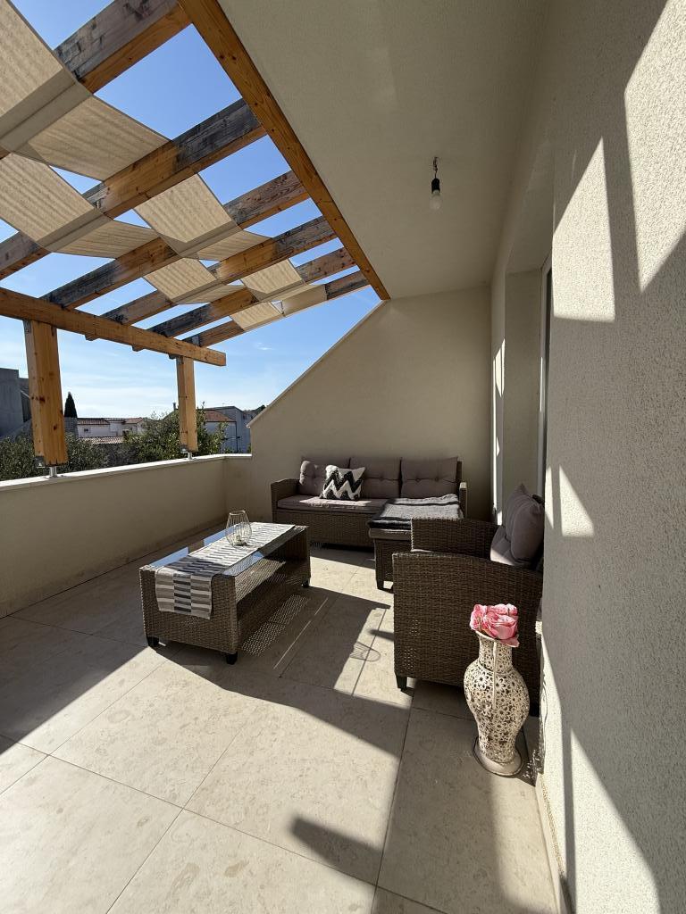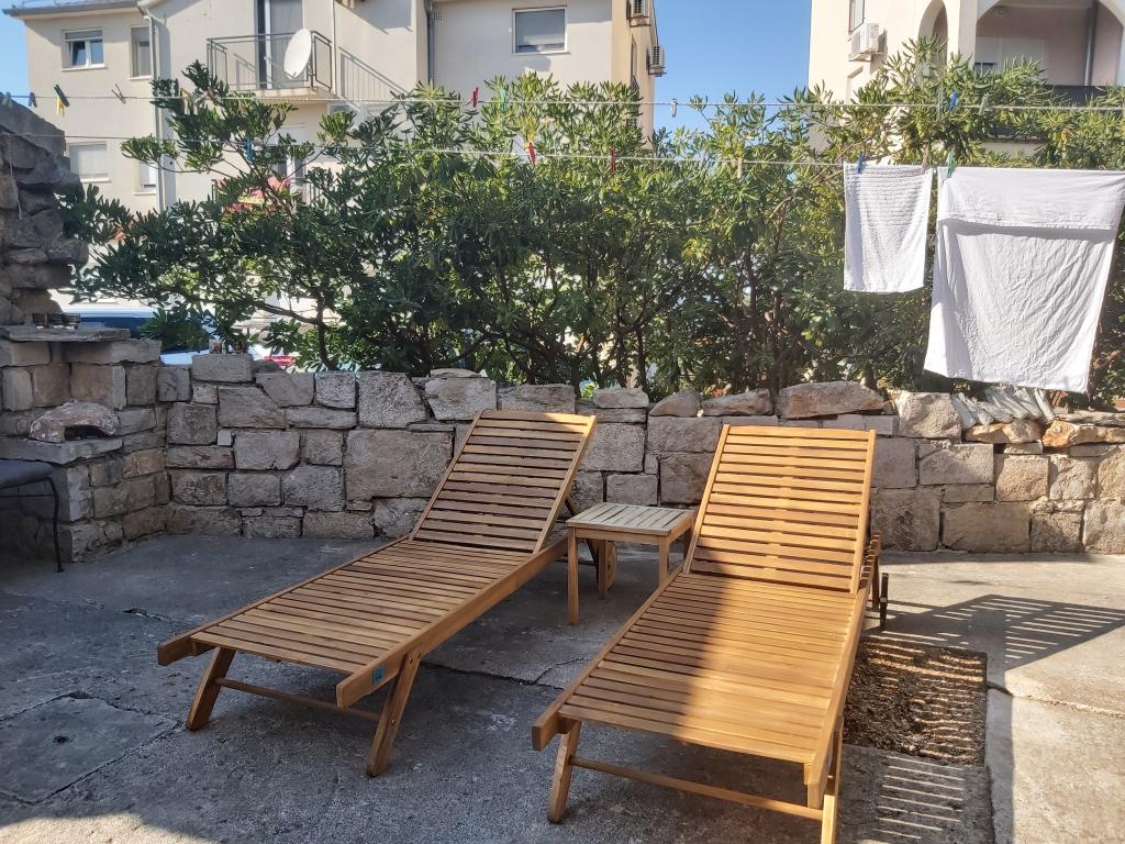Apartament typu studio z tarasem o powierzchni 12 m². Apartament przeznaczony dla 2 osób. Duże łóżko podwójne, w pełni wyposażona kuchnia, stół jadalny, łazienka. Taras i stół jadalny. Zabezpieczone miejsce parkingowe przed apartamentem na jeden samochód. Blisko plaży. Apartament znajduje się 5 minut spacerem od plaży Slanica i 7 minut spacerem od centrum Murteru.