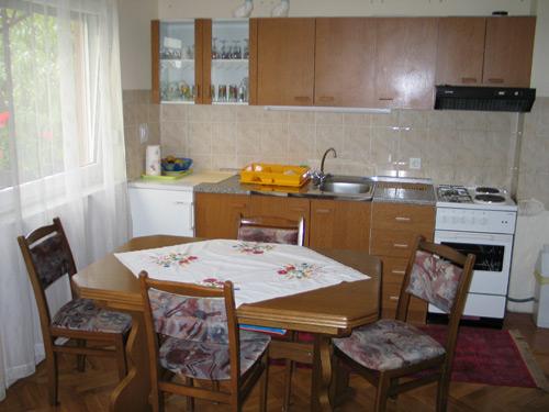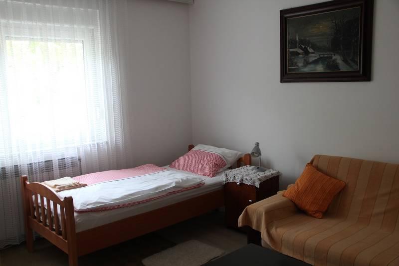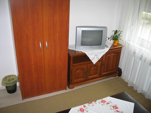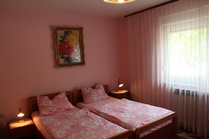 Powierzchnia 66m2 znajduje się na 1 piętrze domu jednorodzinnego, posiada dwie sypialnie z 2 łóżkami w każdej oraz pokój dzienny z dwoma dostawkami. Łazienka wyposażona jest w wannę, suszarkę do włosów, bidet i umywalkę. Kuchnia standardowo wyposażona w naczynia do przygotowywania i serwowania posiłków i napojów oraz sztućce w odpowiednich ilościach, lodówka, zamrażarka 10 l. Wszystkie pokoje w apartamencie posiadają ogrzewanie, w obu pokojach TV Sat. Parking jest zapewniony.