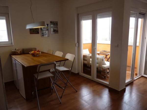 Nowo wybudowany apartament w spokojnej okolicy, w pełni wyposażony z widokiem na morze. Piaszczysta plaża idealna dla dzieci, tylko 50 m od apartamentu i 15 minut spacerem od centrum Nin. Strzeżone miejsce parkingowe na ogrodzonym podwórzu. Mieszkanie składa się z jednej sypialni, pokoju dziennego z możliwością dostawki dla dwóch osób, kuchni z jadalnią, łazienki oraz balkonu. Do dyspozycji Gości jest także zadaszony grill z drewnianymi ławkami i stołem.