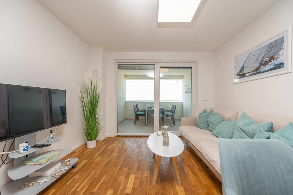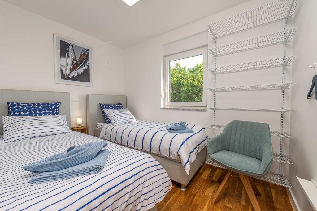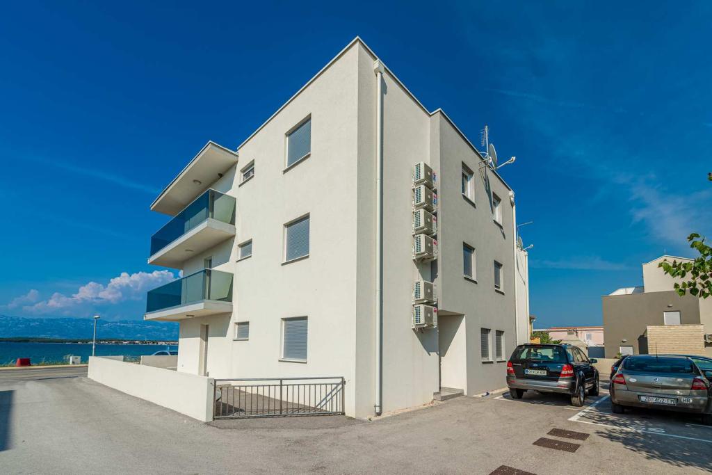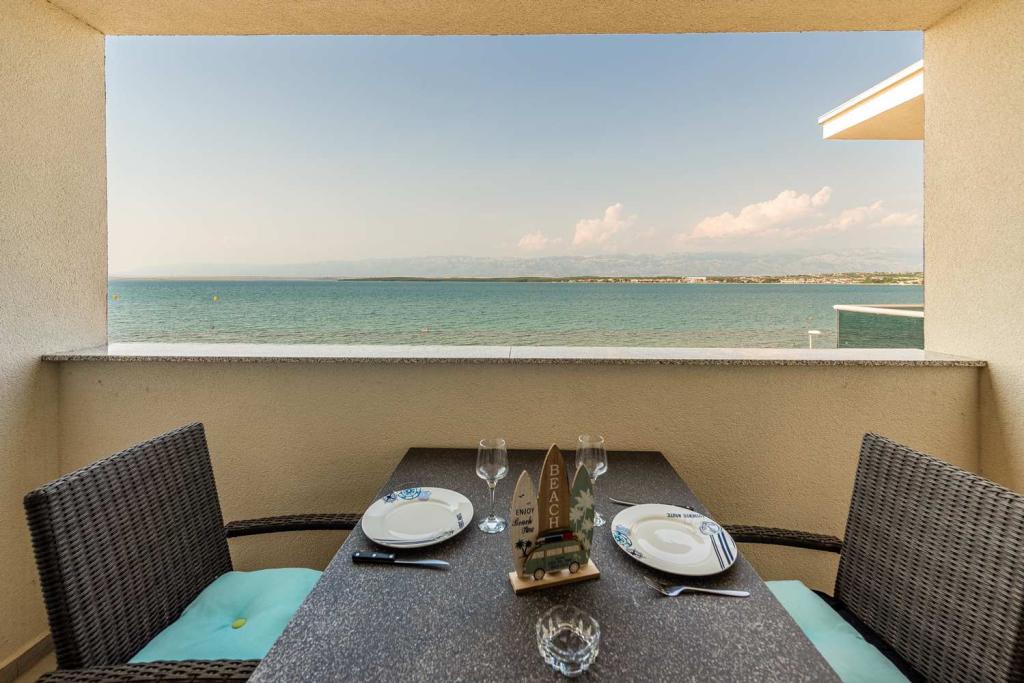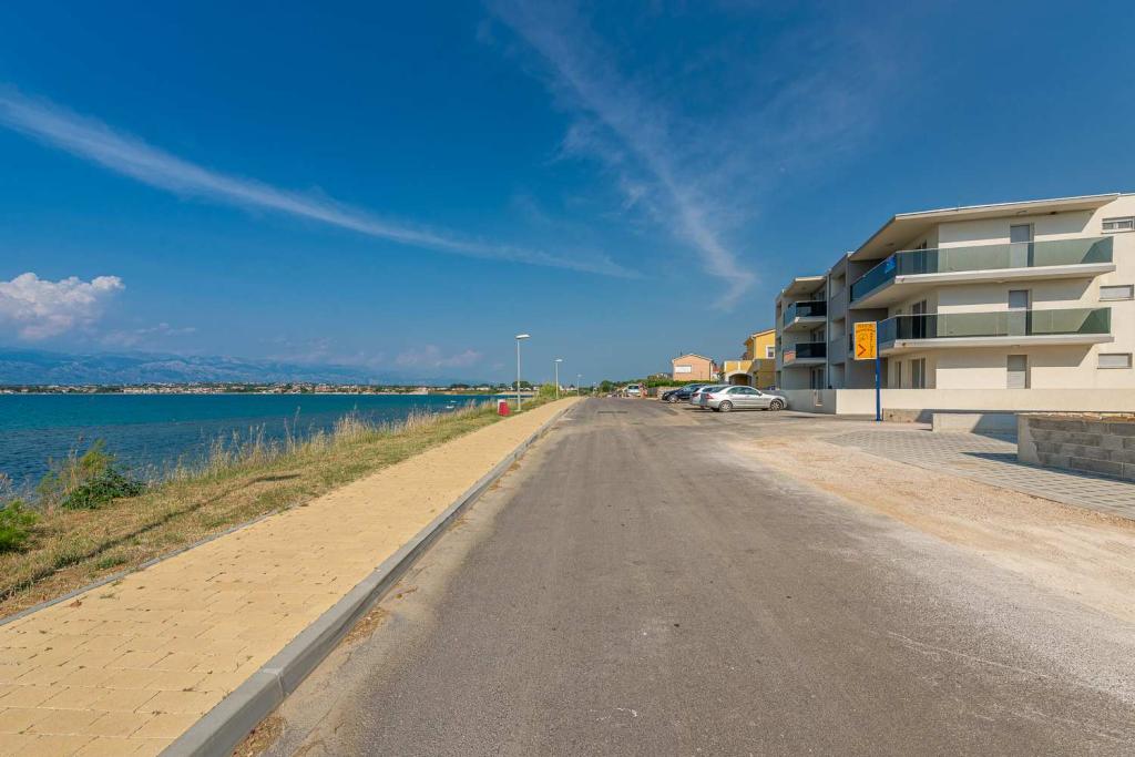 PIERWSZY RZĄD od morza! 10 metrów od plaży dla pieszych. 5 minut od Starego Miasta w Nin. Nowoczesny apartament, ładnie urządzony, bardzo dobrze wyposażona kuchnia (zmywarka, toster, czajnik, ekspres do kawy, kuchenka mikrofalowa, lodówka z zamrażarką, piekarnik, 4 płyty indukcyjne). 1 sypialnia z łóżkiem małżeńskim + 1 sypialnia z 2 łóżkami. Prysznic i pralka. Fantastyczny widok na morze z tarasu.