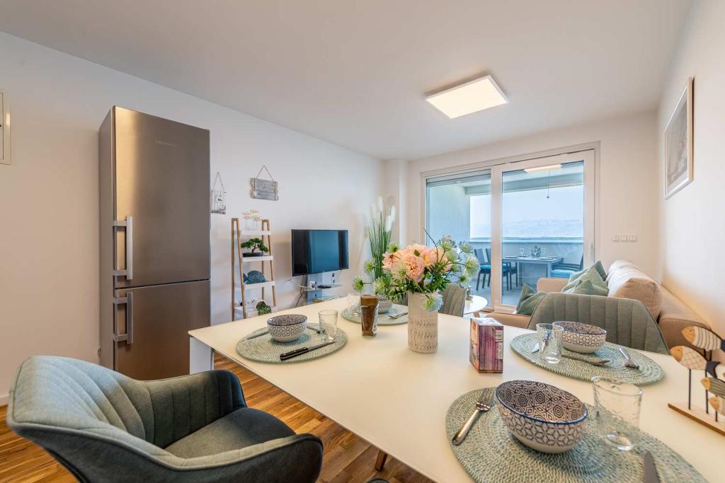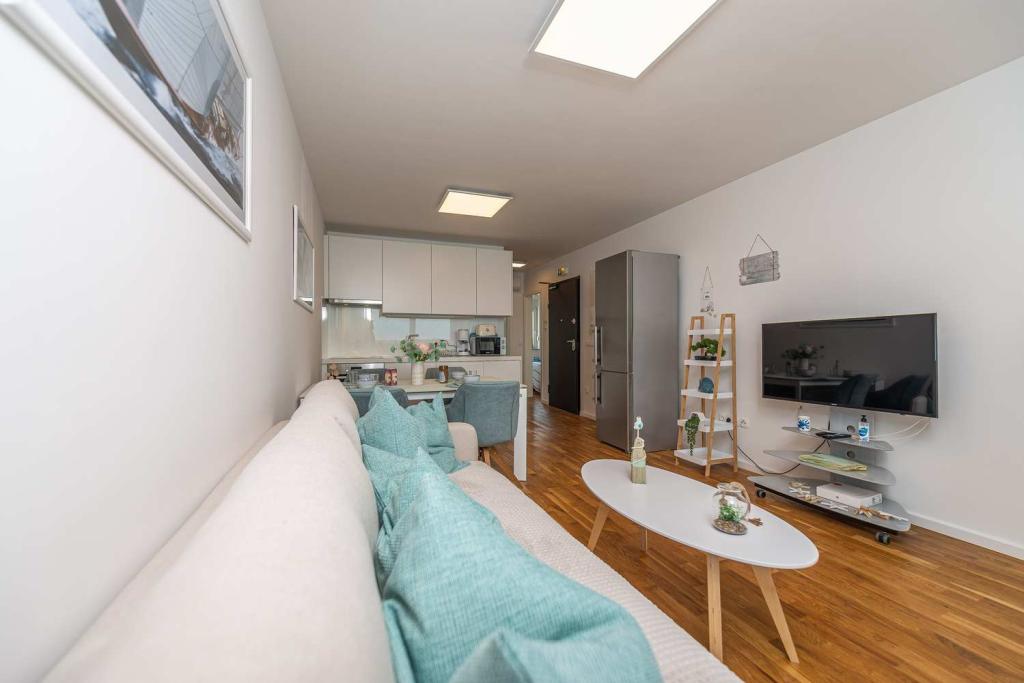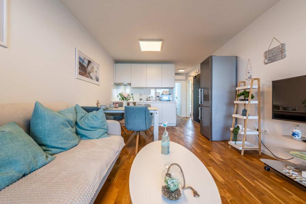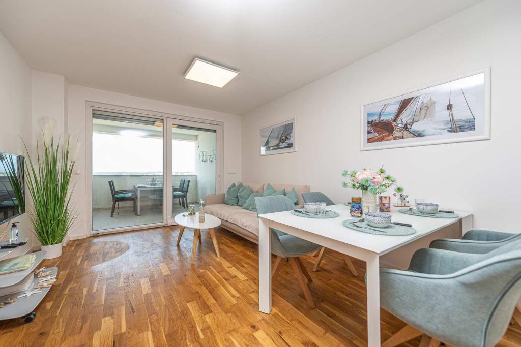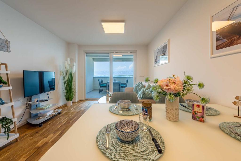 PIERWSZY RZĄD od morza! 10 metrów od plaży dla pieszych. 5 minut od Starego Miasta w Nin. Nowoczesny apartament, ładnie urządzony, bardzo dobrze wyposażona kuchnia (zmywarka, toster, czajnik, ekspres do kawy, kuchenka mikrofalowa, lodówka z zamrażarką, piekarnik, 4 płyty indukcyjne). 1 sypialnia z łóżkiem małżeńskim + 1 sypialnia z 2 łóżkami. Prysznic i pralka. Fantastyczny widok na morze z tarasu.
