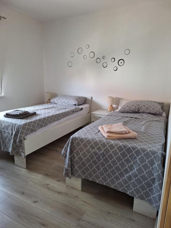 Apartamenty znajdują się w Nin - miejscowości Ždrijac, w spokojnej okolicy, 150 m od plaży (5 minut spacerem) i 400 m od miasta (10-15 minut spacerem ścieżką dla pieszych). Apartament 1... składa się z 3 pokoi, z których jeden wyposażony jest w telewizor, a jeden pokój (salon) wyposażony jest w telewizor i osobną toaletę (z pralką) oraz dodatkowe łóżko, kuchnia wyposażona w zmywarkę, lodówkę z zamrażarką, kuchenkę mikrofalową, czajnik, łazienka z kabiną prysznicową oraz korytarz i taras, a na podwórku znajduje się zarezerwowane miejsce parkingowe. Apartament jest zarejestrowany na 6 osób. Apartament 2... składa się z 2 pokoi, z których jeden wyposażony jest w telewizor i dodatkowe łóżko, oraz kuchni, łazienki i balkonu. Na podwórku znajduje się miejsce parkingowe. Apartament jest zarejestrowany na 4 osoby - apartamenty mają szybki internet i telewizję (Netflix...) Cena A 1 jest wyższa, jeśli jest więcej niż 4 osoby. Cena A 2 jest wyższa, jeśli jest 4 osoby.