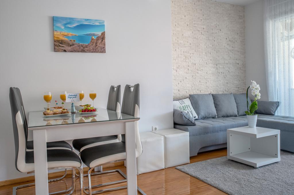 Jesteśmy w doskonałej lokalizacji w Novalji, przy ulicy Primorskiej, 150 m od piaszczystej plaży z krystalicznie czystym morzem, 15 minut łatwego spaceru wzdłuż morza promenadą do centrum Novalji/riva z licznymi barami i placami zabaw dla dzieci. 150 m do piaszczystej plaży Ploče, 8 minut spacerem do plaży Babe. Obie plaże są odpowiednie dla dzieci. Inne piękne plaże na wyspie znajdują się zaledwie kilka minut jazdy samochodem. Mieszkanie składa się z 2 sypialni, kuchni z jadalnią i salonem, łazienki, przedpokoju, dużego tarasu z widokiem na morze oraz miejsca parkingowego. Wszystkie trzy pokoje mają dostęp do tarasu. W pełni wyposażone dla komfortowego pobytu: 2 klimatyzatory, Wi-Fi, płyta szklano-ceramiczna, piekarnik, lodówka z zamrażarką, kuchenka mikrofalowa, zmywarka, pralka, 2 telewizory, pościel, ręczniki, ręczniki kuchenne, czajnik, grill elektryczny, toster , suszarka do włosów, 2 wygodne leżaki na tarasie, parasol plażowy... Mieszkanie nie jest przystosowane do pobytu ze zwierzętami. Powitanie!