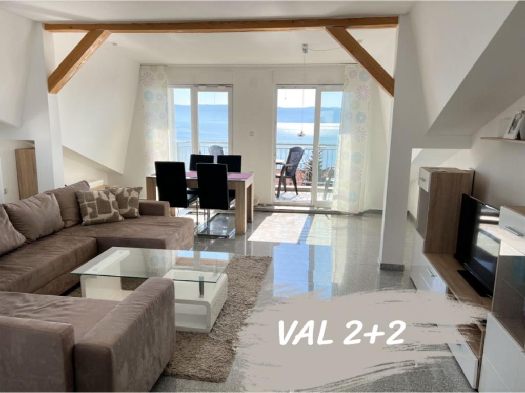 Apartament VAL 2+2 znajduje się na poddaszu domu rodzinnego. Z apartamentu roztacza się panoramiczny widok na morze i wyspę Krk. Plaża oddalona jest o 300 metrów. Parking znajduje się przed domem, na podwórku. Zwierzęta są mile widziane, a ich pobyt jest bezpłatny.