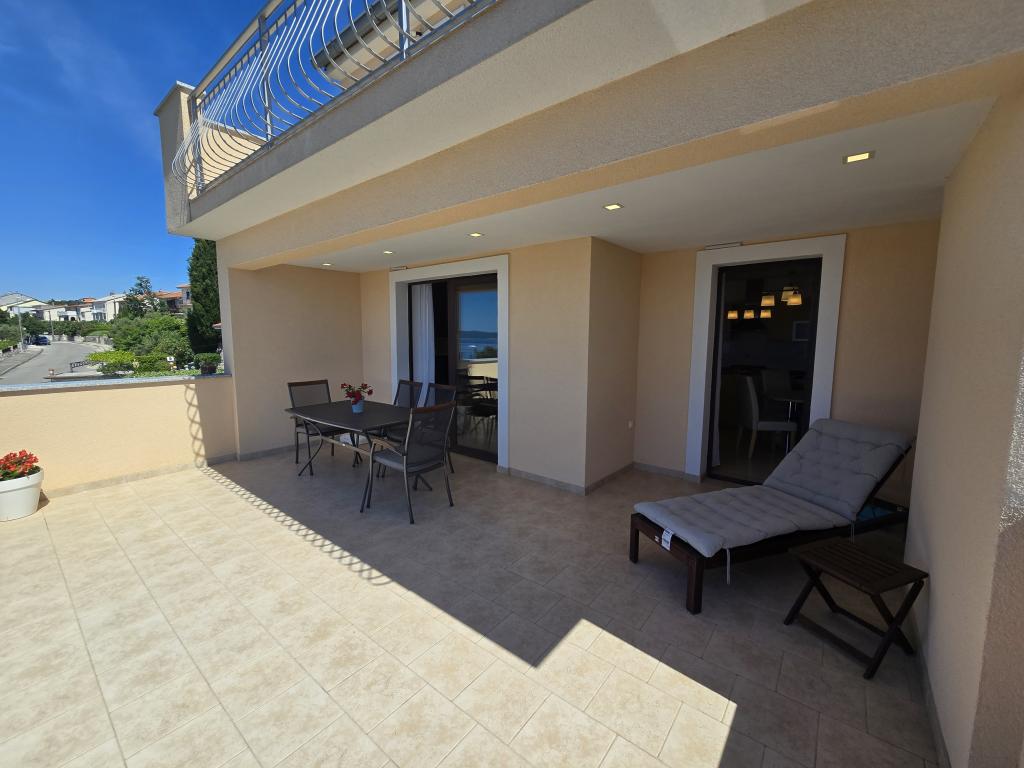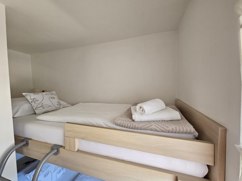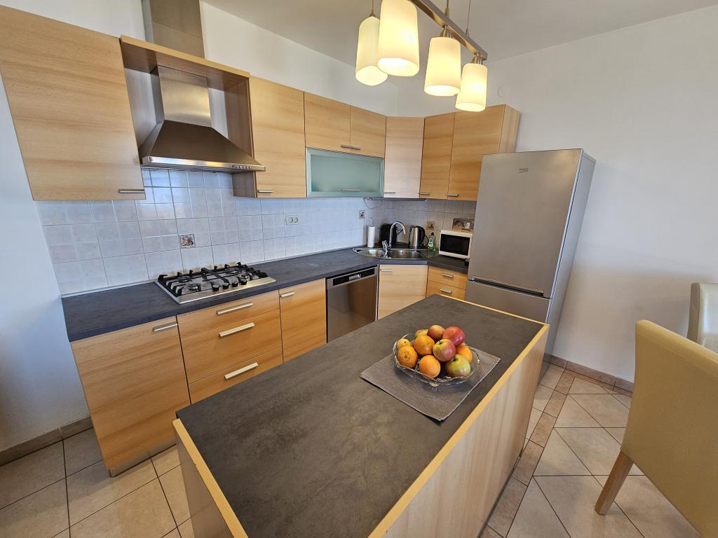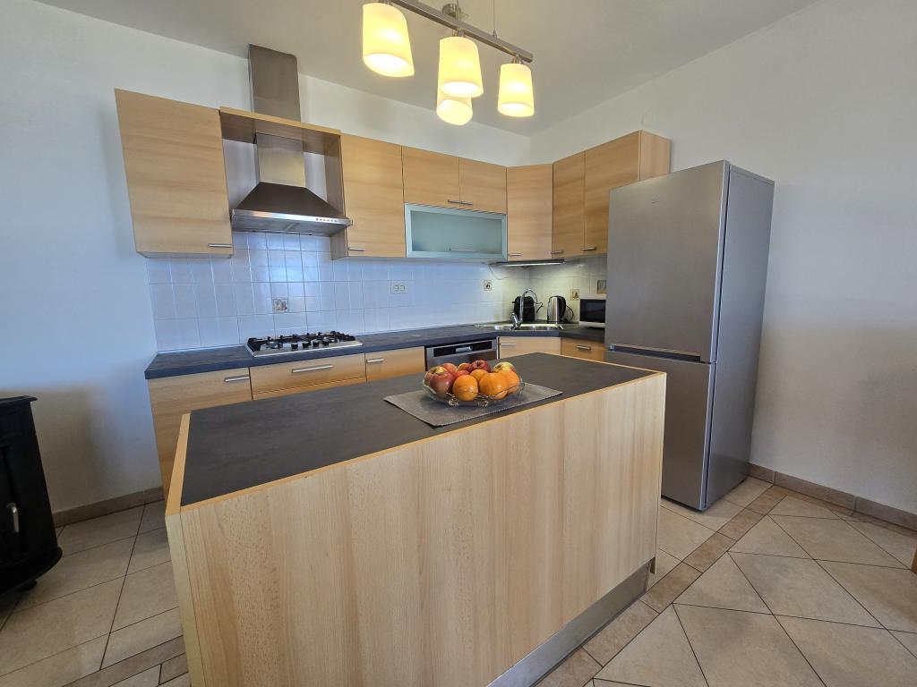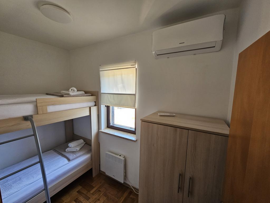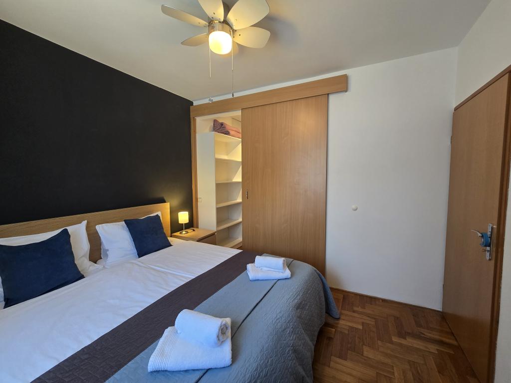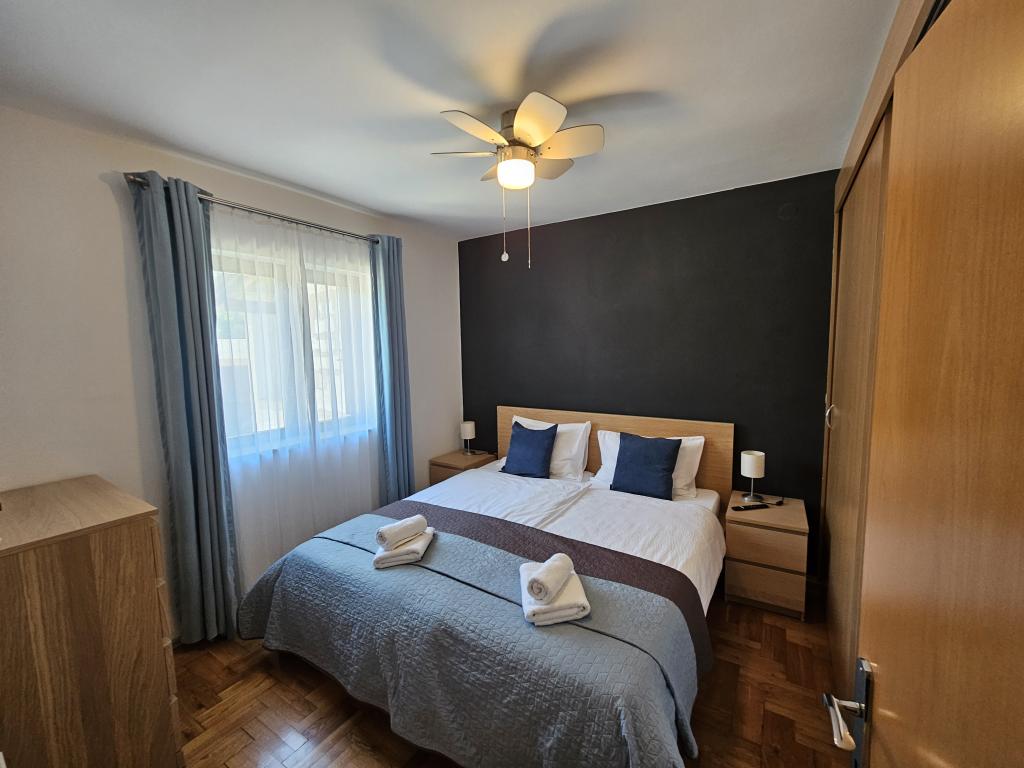 W pełni wyposażony apartament składający się z dwóch sypialni, łazienki, przedpokoju, kuchni, jadalni i salonu. Dostępne jest wysokie krzesełko. Powierzchnia tarasu 25m2. Dodatkowy odbiornik TV LCD znajduje się w sypialni. Sypialnia 1: duże łóżko dwuosobowe (200x180 cm). Sypialnia 2: łóżka piętrowe (200x180cm). Apartament położony jest w spokojnej uliczce, blisko wszystkich niezbędnych udogodnień. Znajduje się na pierwszym piętrze domu rodzinnego. Kuchnia jest w pełni wyposażona (zmywarka, kuchenka gazowa, piekarnik, lodówka z zamrażarką, ekspres przelewowy do kawy + Nespresso, toster, mikrofalówka, czajnik, urządzenie do przygotowywania koktajli...). Apartament jest w pełni klimatyzowany (salon + kuchnia i sypialnie). Nieruchomość jest oddzielona i ma własne bezpłatne miejsce parkingowe na podwórku.
