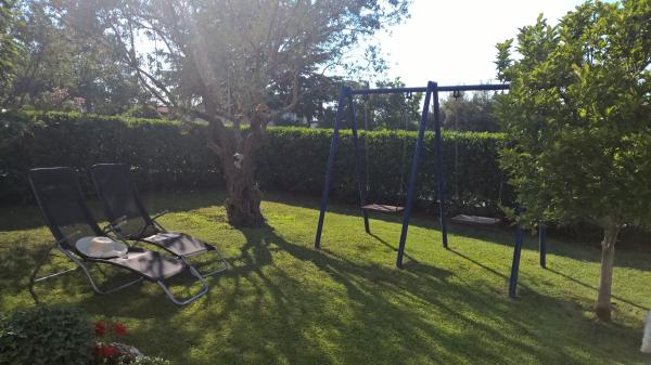 Apartament iz osobnym wejściem. W pełni wyposażone. Pościel, klimatyzację, telewizję satelitarną, bezprzewodowy dostęp do Internetu, parking, możliwość korzystania z grilla i prysznic na świeżym powietrzu. Otoczony parkiem. Huśtawki dla dzieci i leżaki. Znajdujemy się około 100 m od morza, na plaży można chodzić.