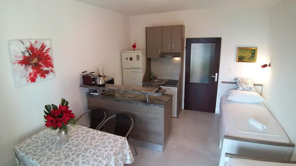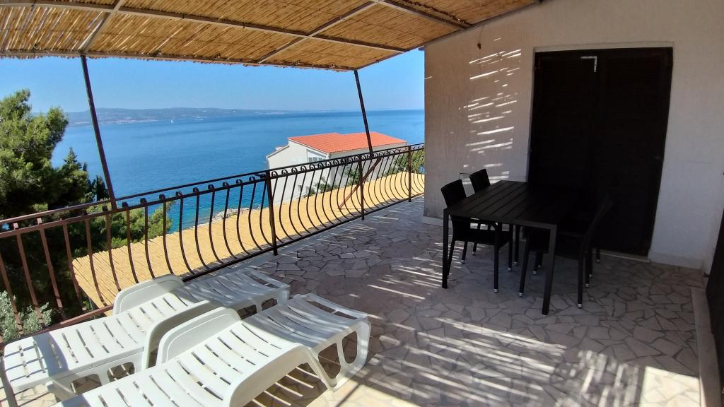 Drodzy Goście! Do dyspozycji mamy 1 apartament A4+2 (taras 68 m2 30 m2) i 2 apartamenty A2+2 (taras 32 m2 10 m2) dla łącznie 12 osób. Wszystkie apartamenty posiadają tarasy ze stołem i krzesłami oraz widokiem na morze. Dom położony jest 30 m od kamienistej plaży. Parking na 2 x 2 samochody znajduje się tuż za domem. Do dyspozycji Gości jest także grill. Piękna plaża żwirowa znajduje się 30 m od domu. Okolica jest cicha, a zachody słońca są piękne. W pobliżu znajdują się 3 restauracje, targ, bankomat i piekarnia. W pobliskim Omišu działają handlarze ryb i rzeźnicy oferujący świeże ryby i mięso. Od 1985 roku jesteśmy do Państwa dyspozycji w przypadku wszelkich pytań i porad.