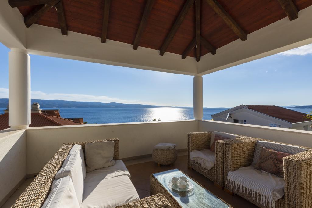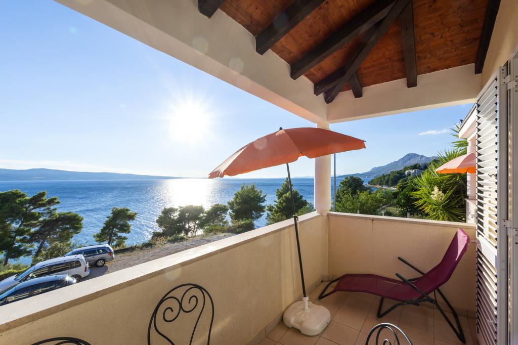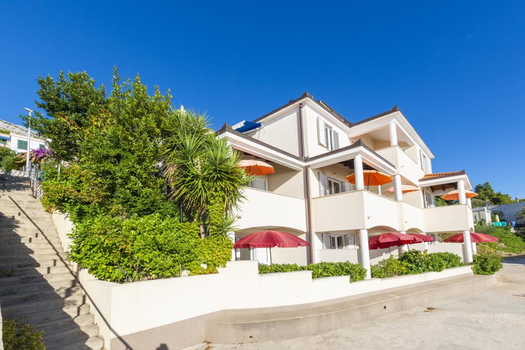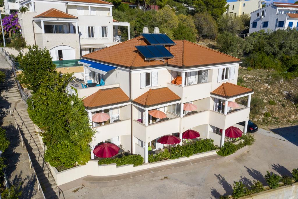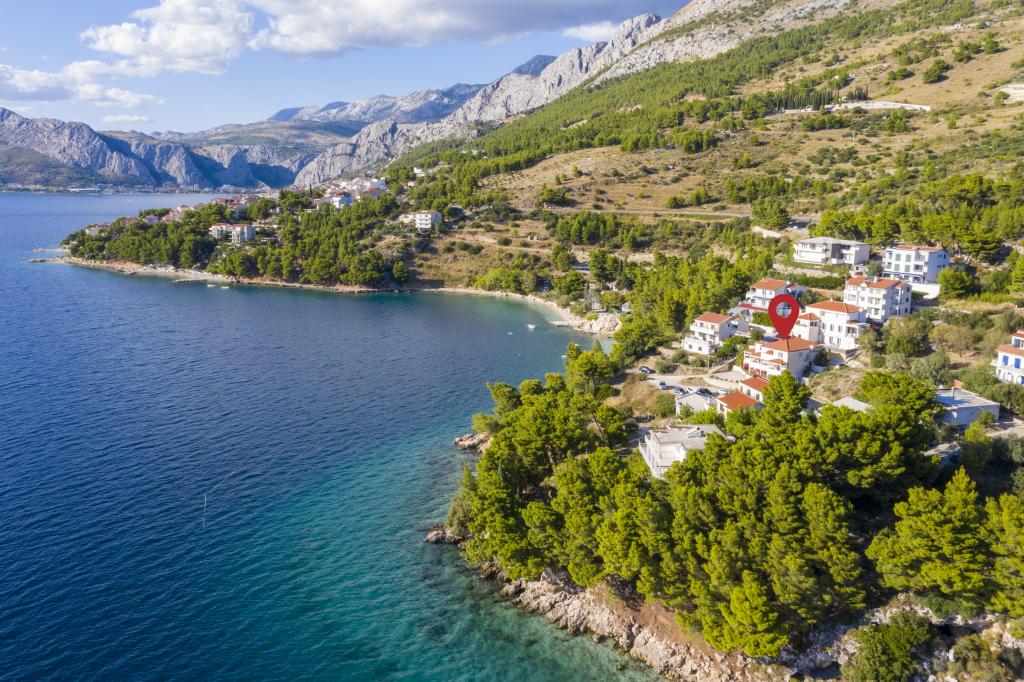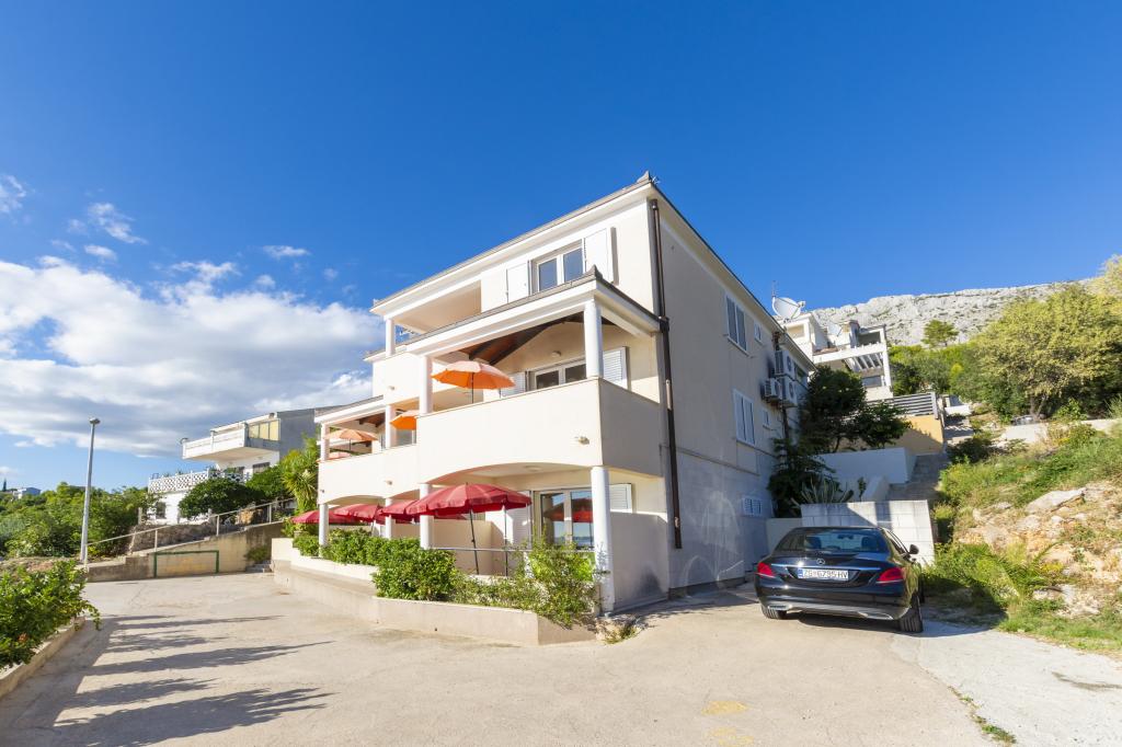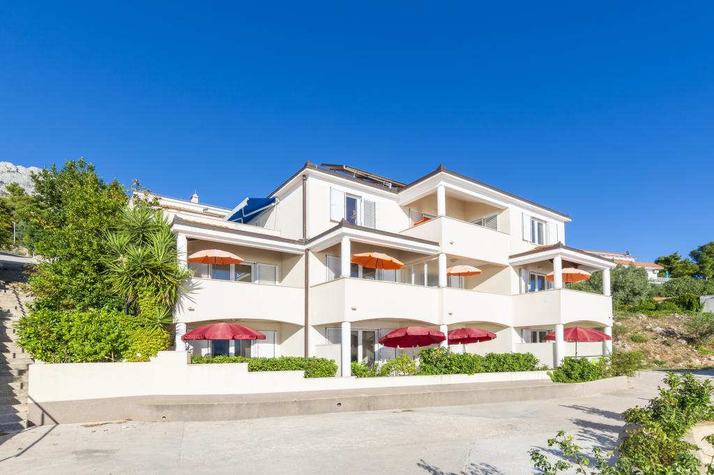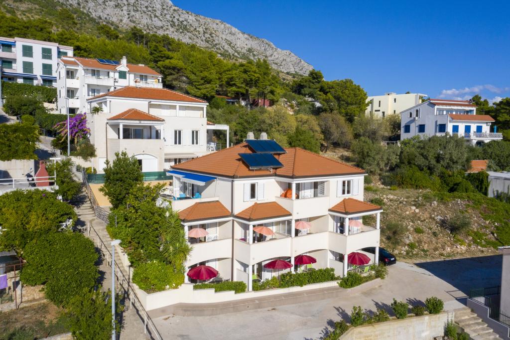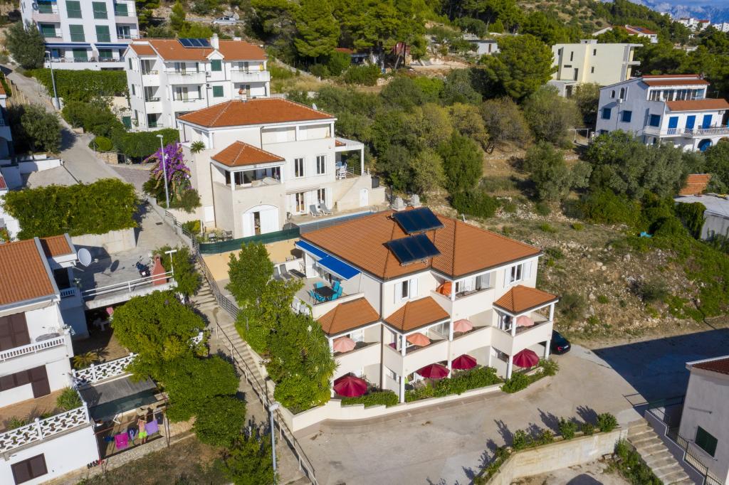 Zakwaterowanie w nowo wybudowanych, niezwykle komfortowych i doskonale wyposażonych apartamentach. Obiekt położony jest 3 km od centrum Omiša. W sumie osiem apartamentów, położonych w pierwszym rzędzie od morza. Wszystkie apartamenty posiadają duże tarasy z widokiem na morze i wyspę Brač. Miejsca parkingowe znajdują się tuż przy willi. Apartamenty znajdują się poniżej głównej drogi (300 metrów), tuż przy morzu i dużej, żwirowej plaży. Oferujemy cztery rodzaje apartamentów: typ 2+2 z oddzielną sypialnią dwuosobową i salonem z dwoma łóżkami, apartamenty typu 2+2 – duże studio, apartamenty typu lux, typ 4+2 z dwiema sypialniami dwuosobowymi i dużym salonem z dwoma rozkładanymi łóżkami oraz apartamenty typu de lux. Apartament typu 14+2 to w rzeczywistości willa na trzech piętrach o powierzchni 300 m², z basenem o wymiarach 9x4 metry z podgrzewaną wodą, siedmioma sypialniami dwuosobowymi, dwoma dużymi salonami z balkonami i tarasami, czterema łazienkami, osobną toaletą, grillem na świeżym powietrzu, sauną i siłownią itp. Basen jest dostępny wyłącznie dla apartamentu A 14+2. Pozostałe apartamenty nie.