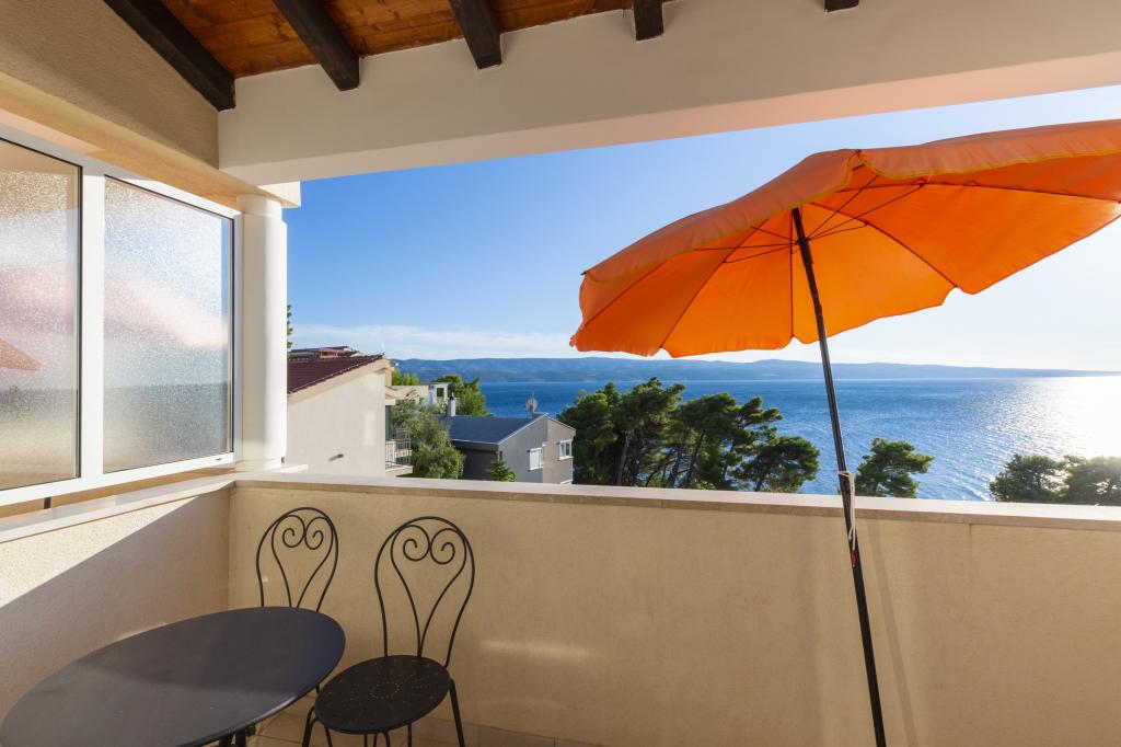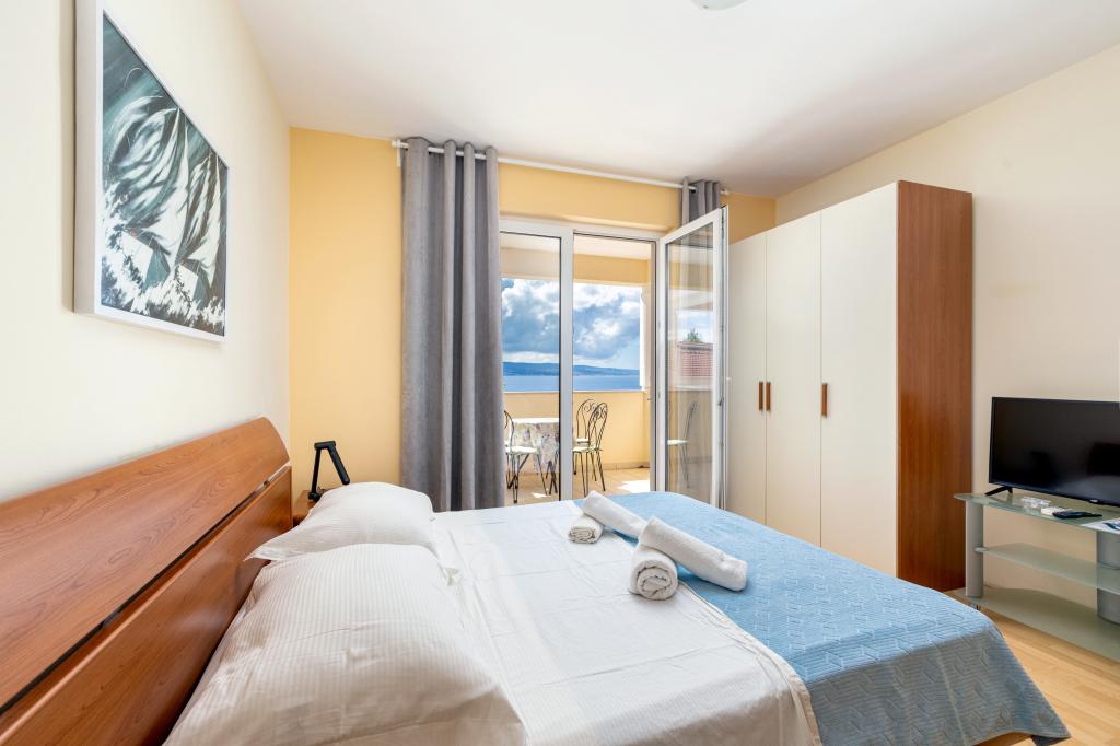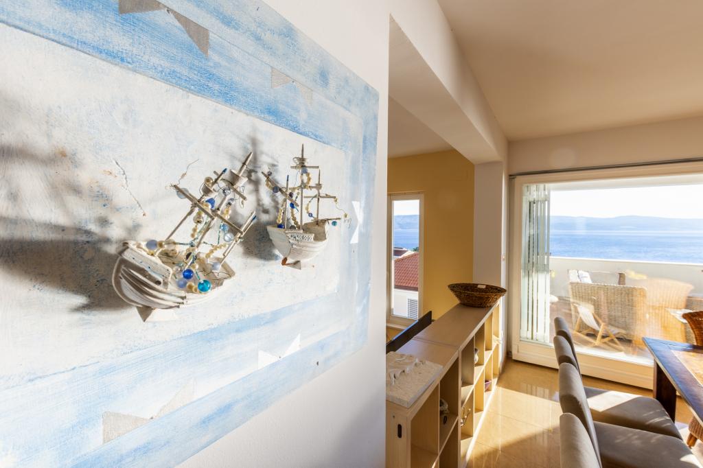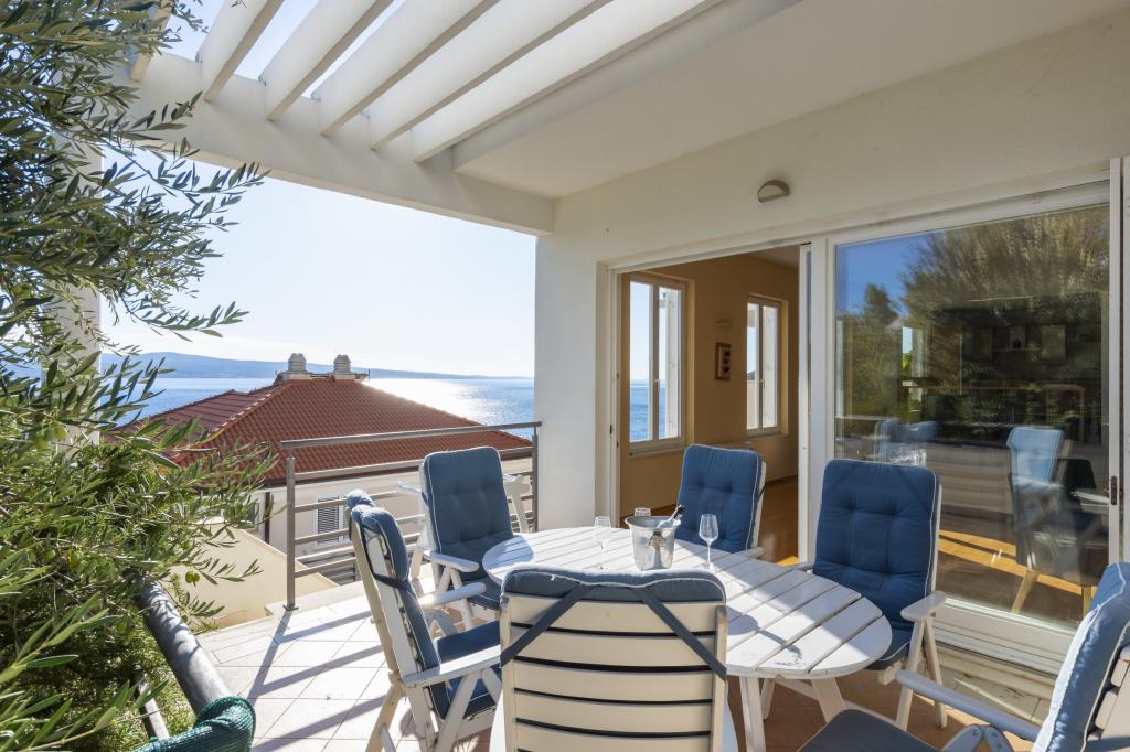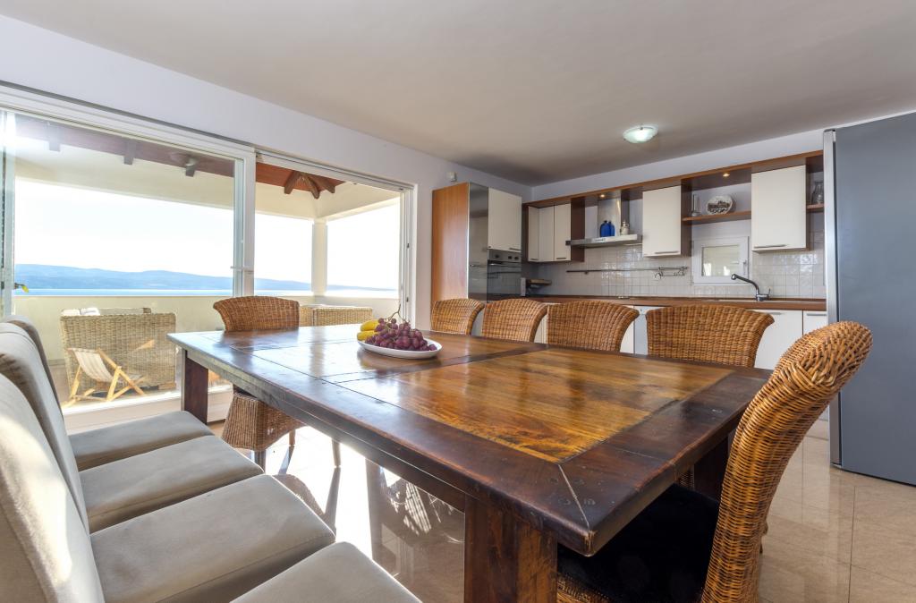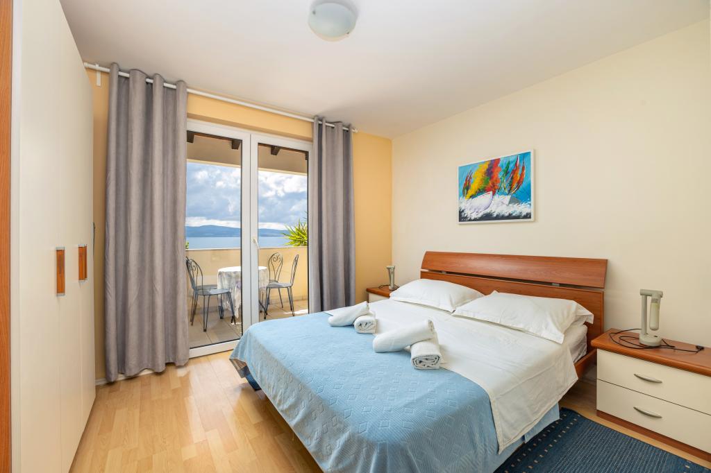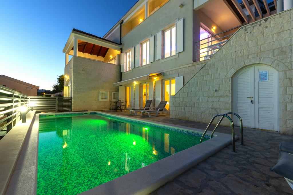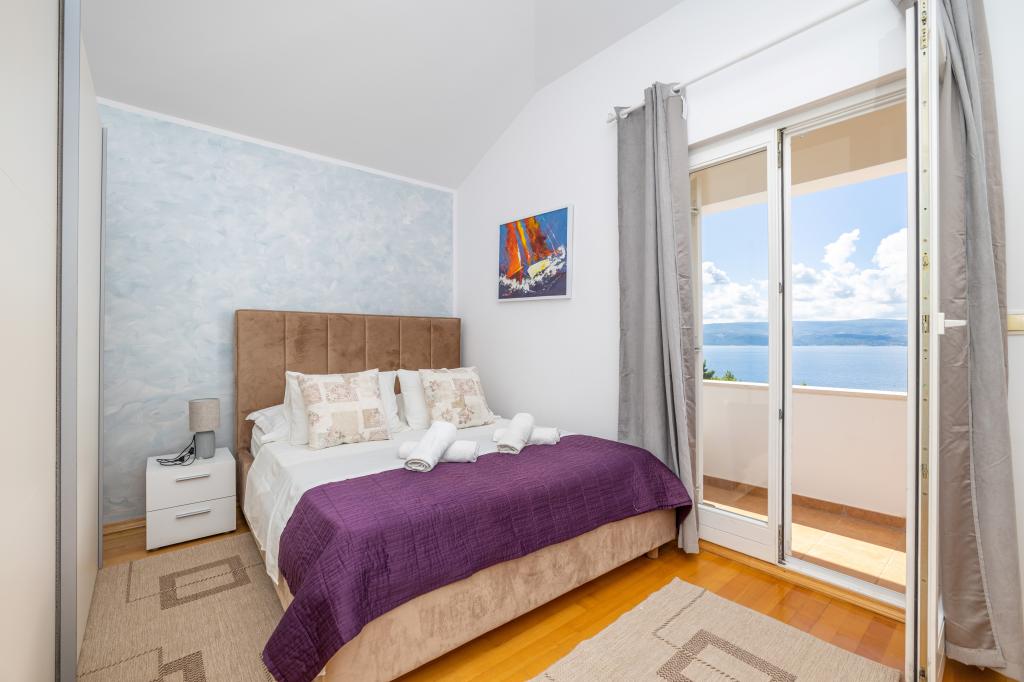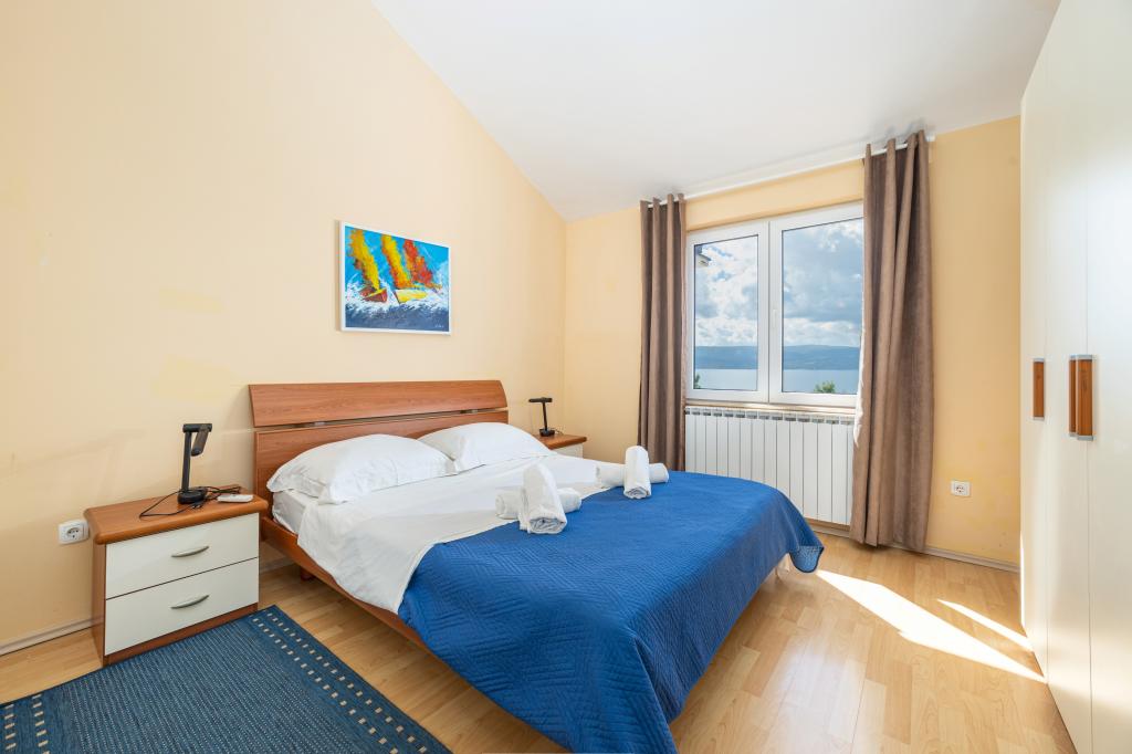 Zakwaterowanie w nowo wybudowanych, niezwykle komfortowych i doskonale wyposażonych apartamentach. Obiekt położony jest 3 km od centrum Omiša. W sumie osiem apartamentów, położonych w pierwszym rzędzie od morza. Wszystkie apartamenty posiadają duże tarasy z widokiem na morze i wyspę Brač. Miejsca parkingowe znajdują się tuż przy willi. Apartamenty znajdują się poniżej głównej drogi (300 metrów), tuż przy morzu i dużej, żwirowej plaży. Oferujemy cztery rodzaje apartamentów: typ 2+2 z oddzielną sypialnią dwuosobową i salonem z dwoma łóżkami, apartamenty typu 2+2 – duże studio, apartamenty typu lux, typ 4+2 z dwiema sypialniami dwuosobowymi i dużym salonem z dwoma rozkładanymi łóżkami oraz apartamenty typu de lux. Apartament typu 14+2 to w rzeczywistości willa na trzech piętrach o powierzchni 300 m², z basenem o wymiarach 9x4 metry z podgrzewaną wodą, siedmioma sypialniami dwuosobowymi, dwoma dużymi salonami z balkonami i tarasami, czterema łazienkami, osobną toaletą, grillem na świeżym powietrzu, sauną i siłownią itp. Basen jest dostępny wyłącznie dla apartamentu A 14+2. Pozostałe apartamenty nie.