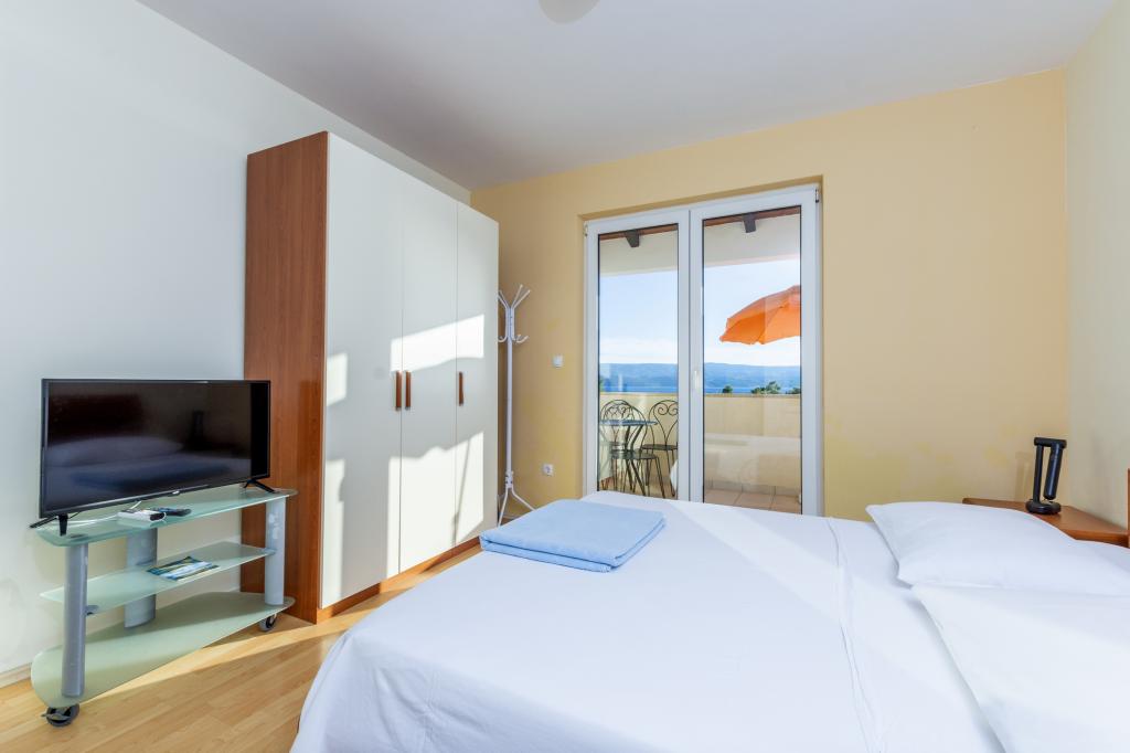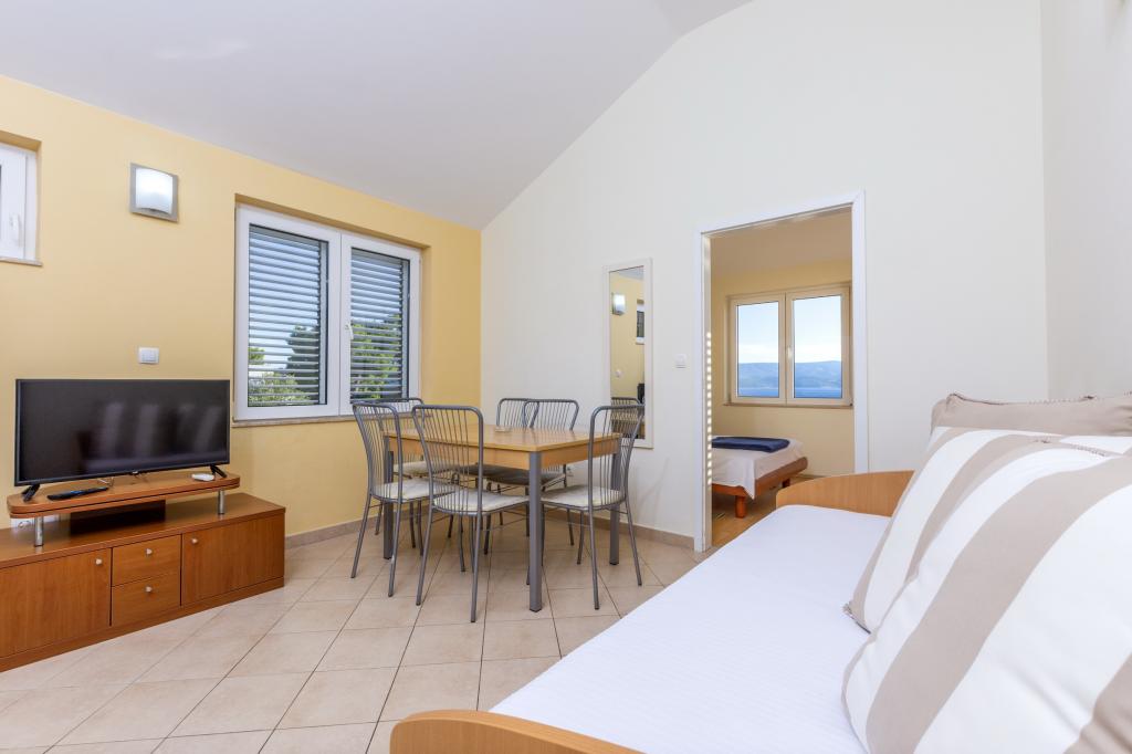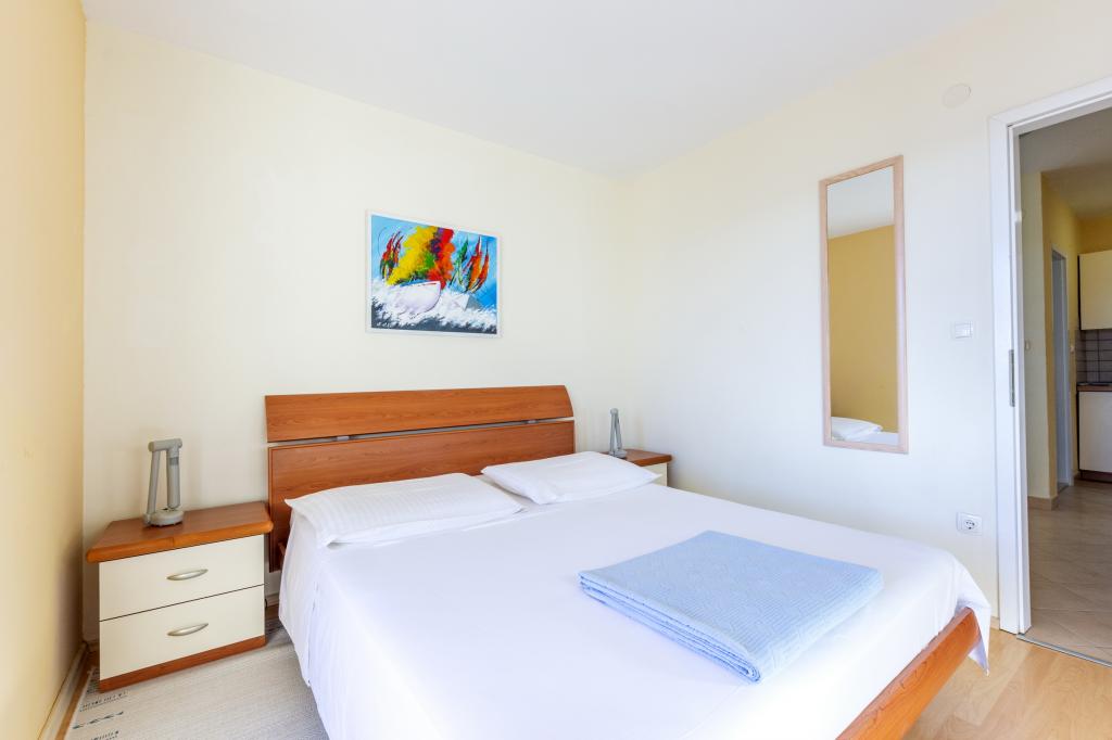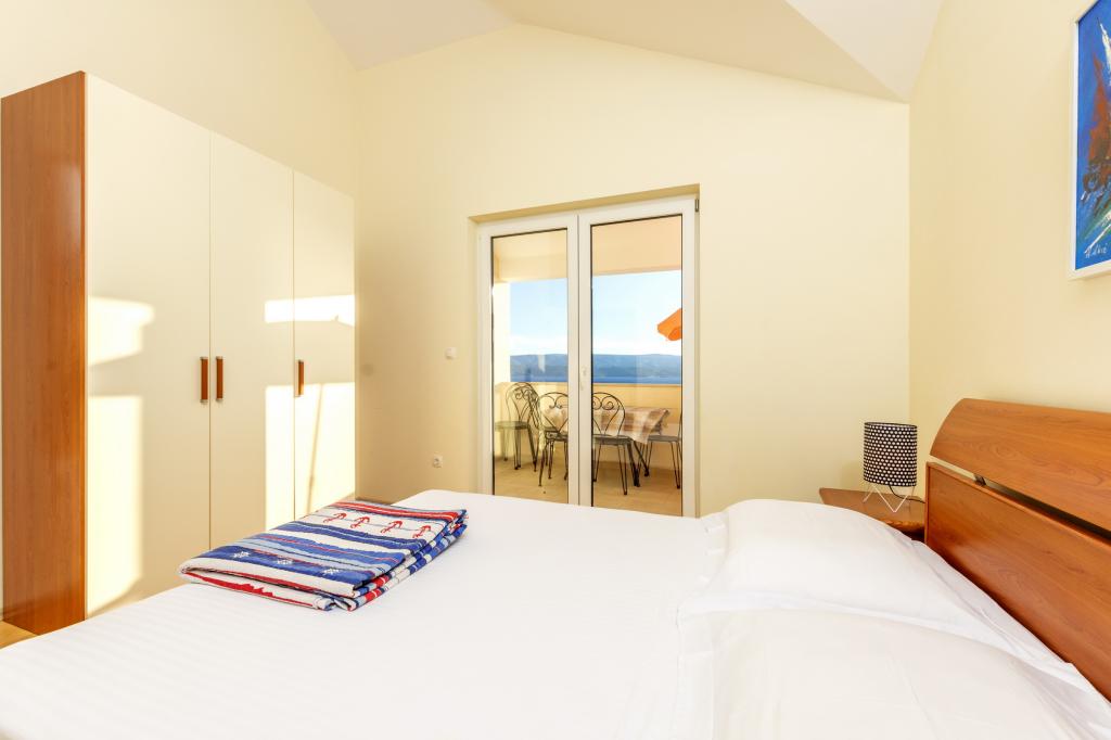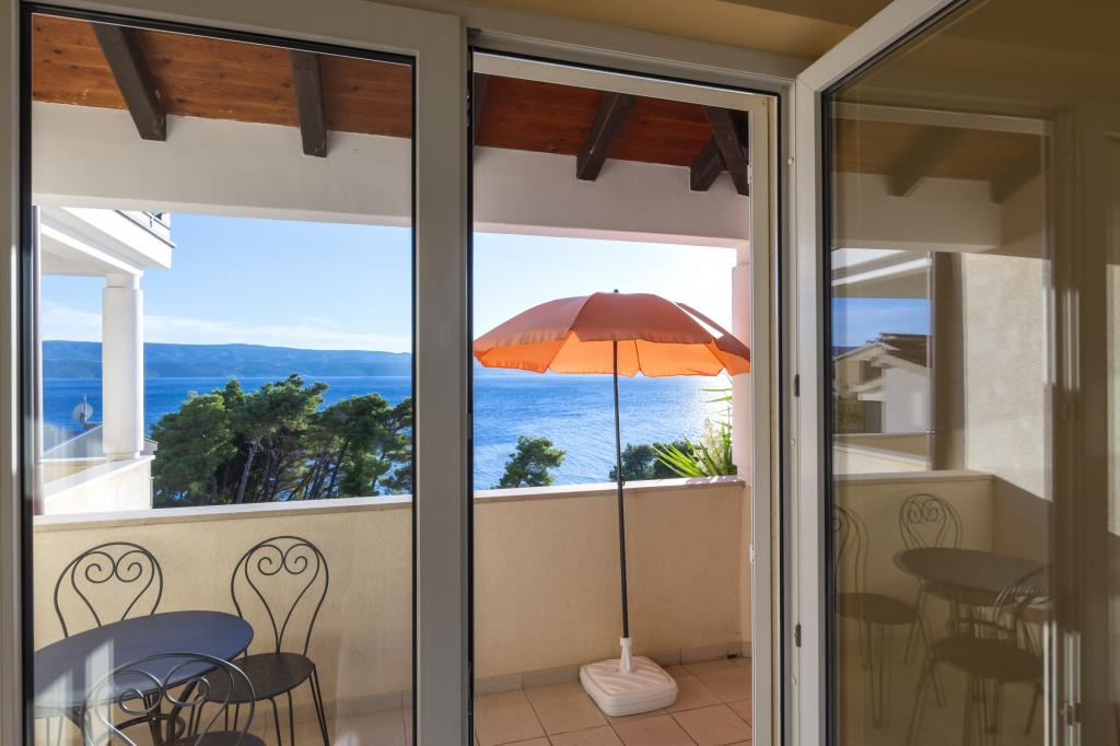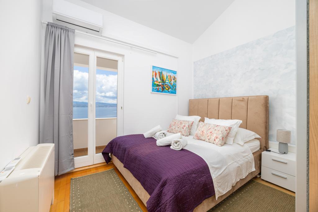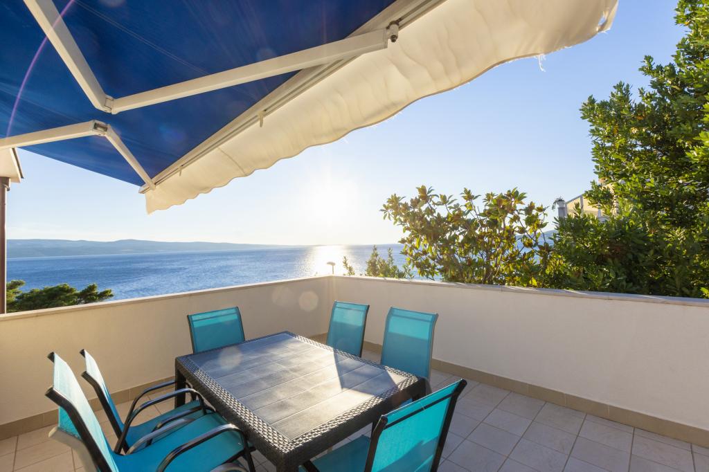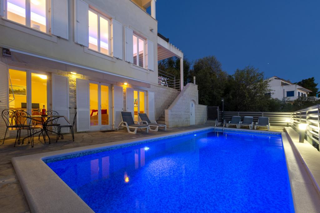 Zakwaterowanie w nowo wybudowanych, niezwykle komfortowych i doskonale wyposażonych apartamentach. Obiekt położony jest 3 km od centrum Omiša. W sumie osiem apartamentów, położonych w pierwszym rzędzie od morza. Wszystkie apartamenty posiadają duże tarasy z widokiem na morze i wyspę Brač. Miejsca parkingowe znajdują się tuż przy willi. Apartamenty znajdują się poniżej głównej drogi (300 metrów), tuż przy morzu i dużej, żwirowej plaży. Oferujemy cztery rodzaje apartamentów: typ 2+2 z oddzielną sypialnią dwuosobową i salonem z dwoma łóżkami, apartamenty typu 2+2 – duże studio, apartamenty typu lux, typ 4+2 z dwiema sypialniami dwuosobowymi i dużym salonem z dwoma rozkładanymi łóżkami oraz apartamenty typu de lux. Apartament typu 14+2 to w rzeczywistości willa na trzech piętrach o powierzchni 300 m², z basenem o wymiarach 9x4 metry z podgrzewaną wodą, siedmioma sypialniami dwuosobowymi, dwoma dużymi salonami z balkonami i tarasami, czterema łazienkami, osobną toaletą, grillem na świeżym powietrzu, sauną i siłownią itp. Basen jest dostępny wyłącznie dla apartamentu A 14+2. Pozostałe apartamenty nie.