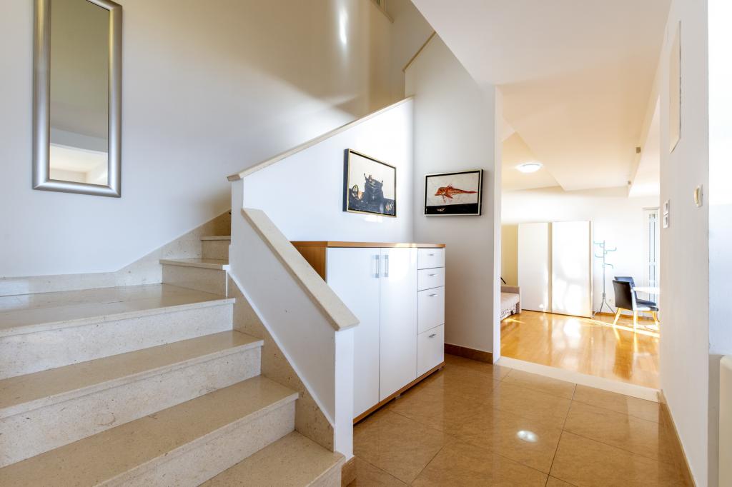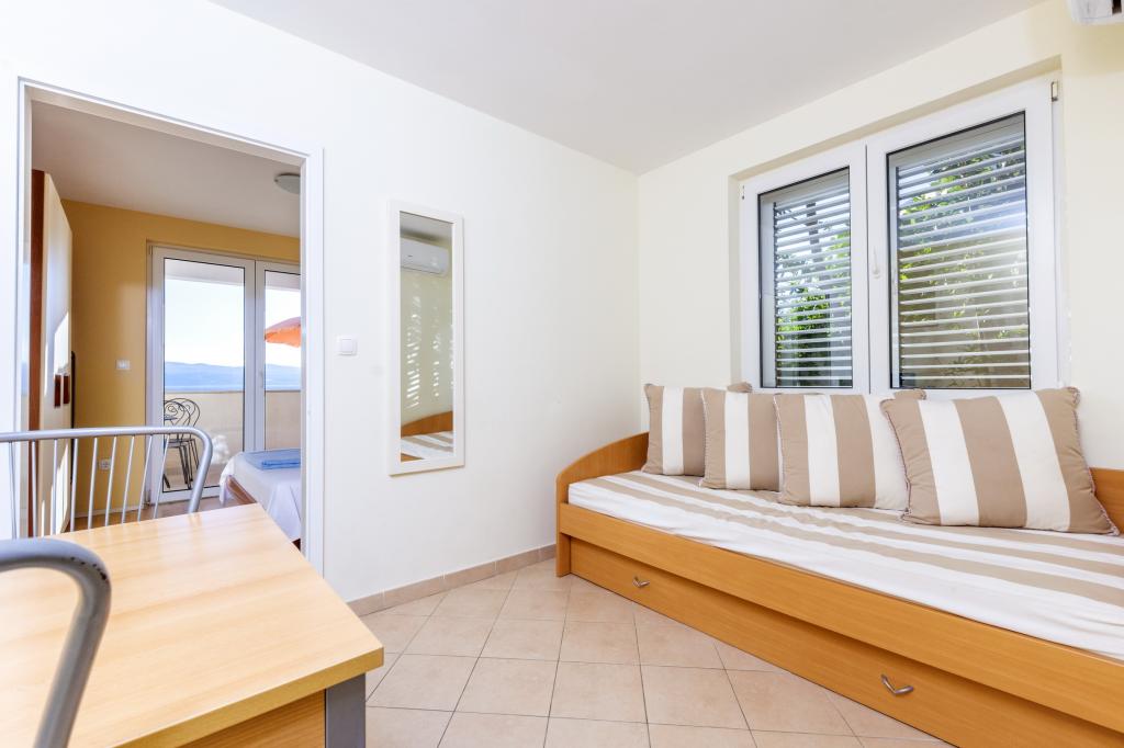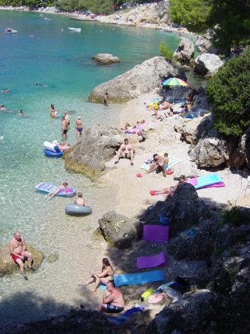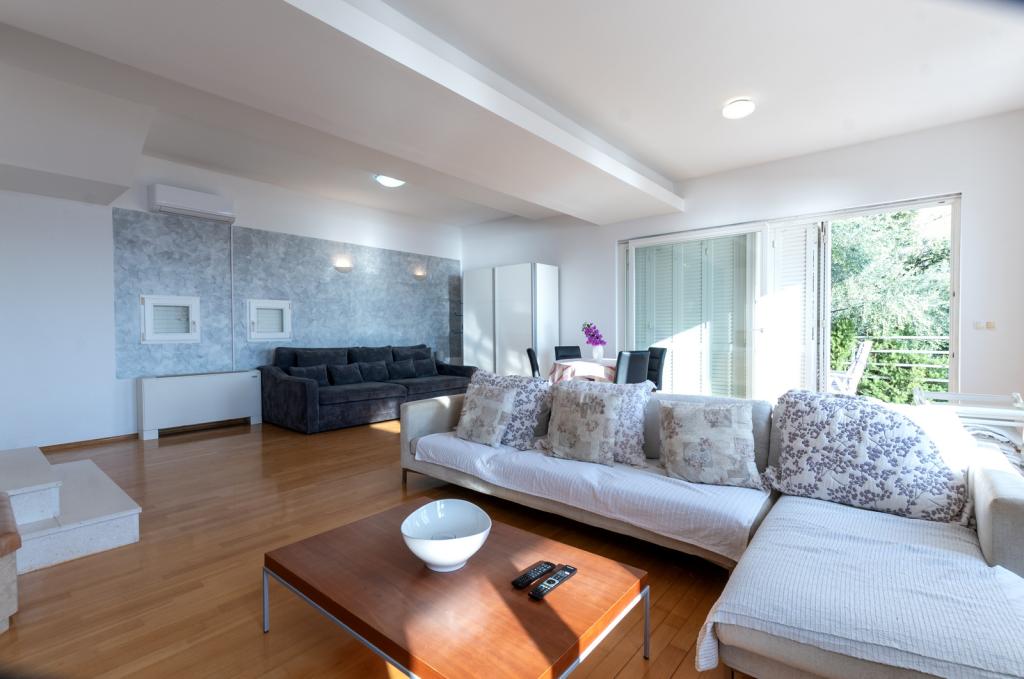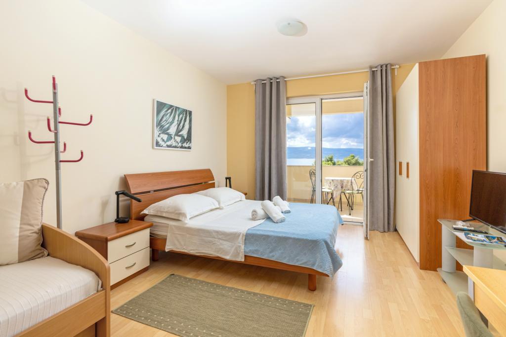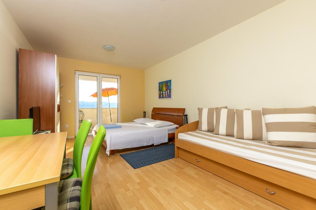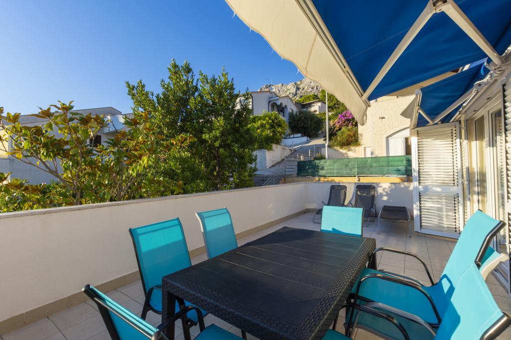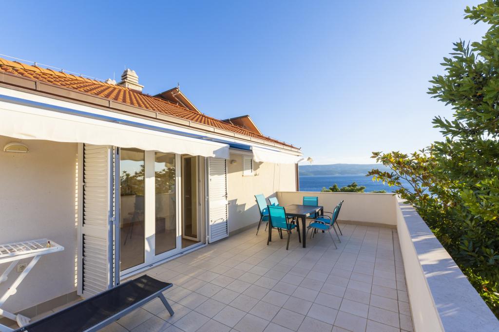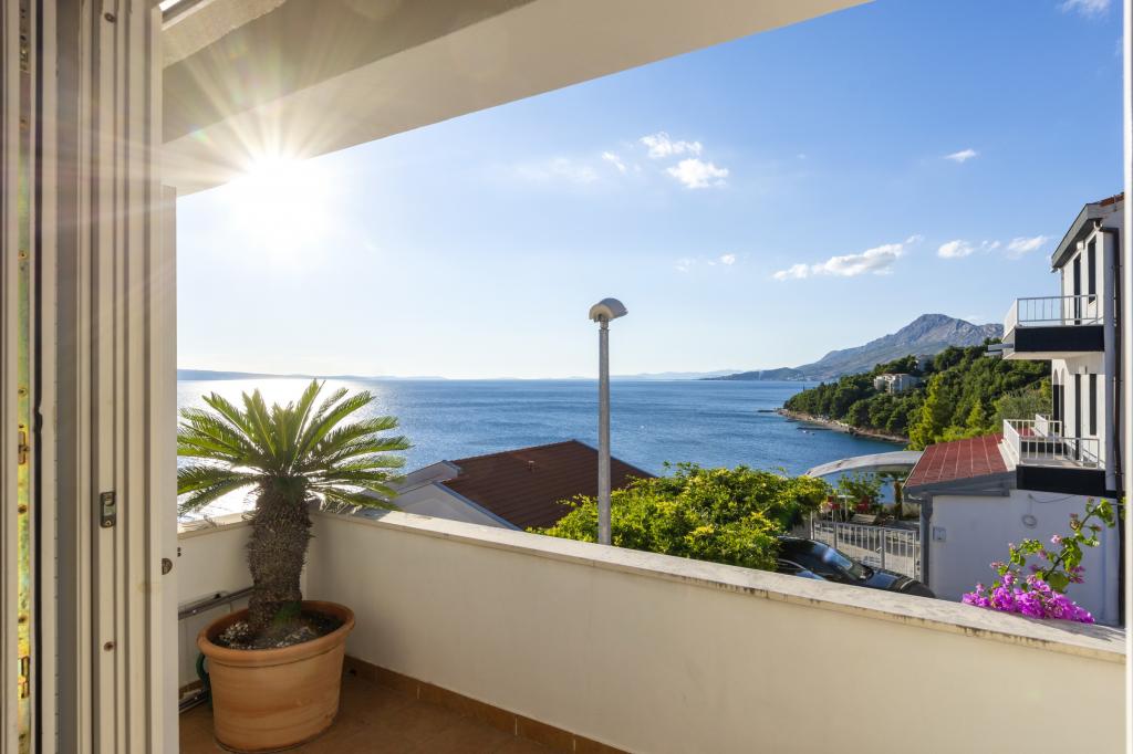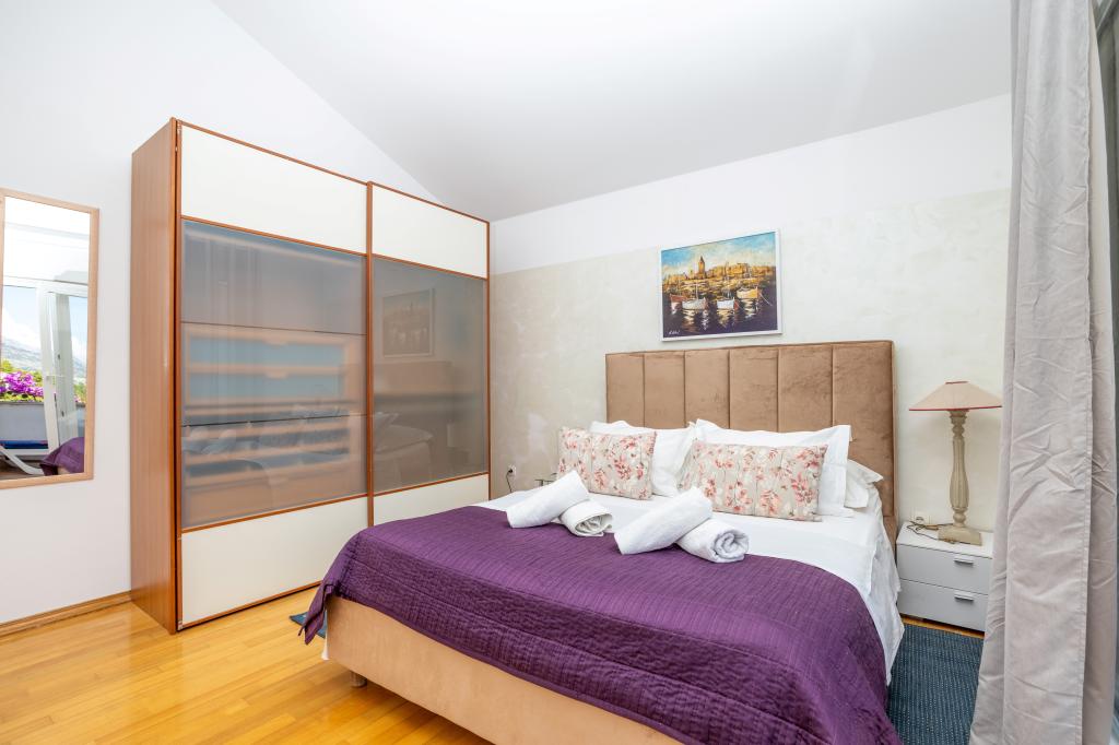 Zakwaterowanie w nowo wybudowanych, niezwykle komfortowych i doskonale wyposażonych apartamentach. Obiekt położony jest 3 km od centrum Omiša. W sumie osiem apartamentów, położonych w pierwszym rzędzie od morza. Wszystkie apartamenty posiadają duże tarasy z widokiem na morze i wyspę Brač. Miejsca parkingowe znajdują się tuż przy willi. Apartamenty znajdują się poniżej głównej drogi (300 metrów), tuż przy morzu i dużej, żwirowej plaży. Oferujemy cztery rodzaje apartamentów: typ 2+2 z oddzielną sypialnią dwuosobową i salonem z dwoma łóżkami, apartamenty typu 2+2 – duże studio, apartamenty typu lux, typ 4+2 z dwiema sypialniami dwuosobowymi i dużym salonem z dwoma rozkładanymi łóżkami oraz apartamenty typu de lux. Apartament typu 14+2 to w rzeczywistości willa na trzech piętrach o powierzchni 300 m², z basenem o wymiarach 9x4 metry z podgrzewaną wodą, siedmioma sypialniami dwuosobowymi, dwoma dużymi salonami z balkonami i tarasami, czterema łazienkami, osobną toaletą, grillem na świeżym powietrzu, sauną i siłownią itp. Basen jest dostępny wyłącznie dla apartamentu A 14+2. Pozostałe apartamenty nie.