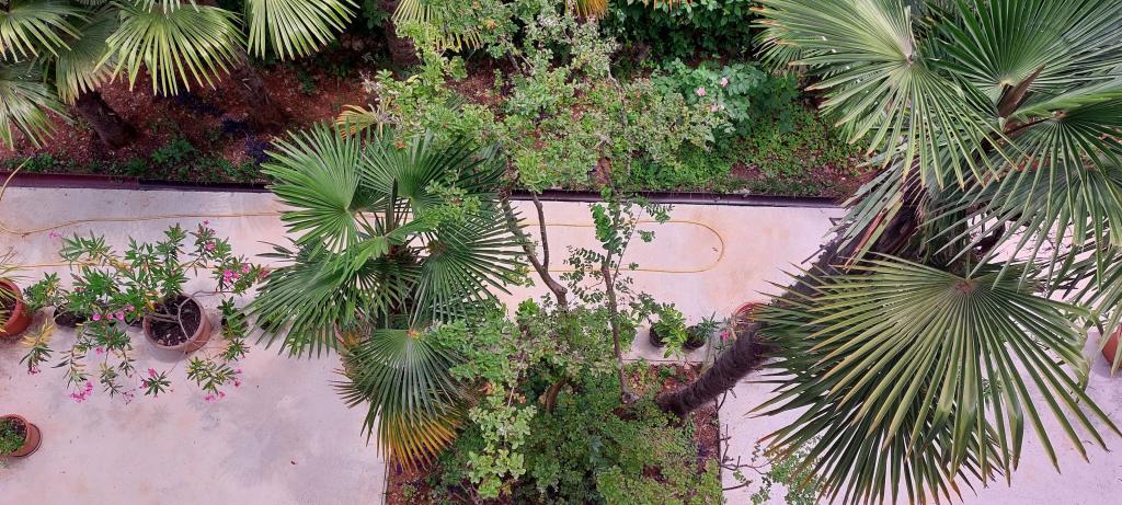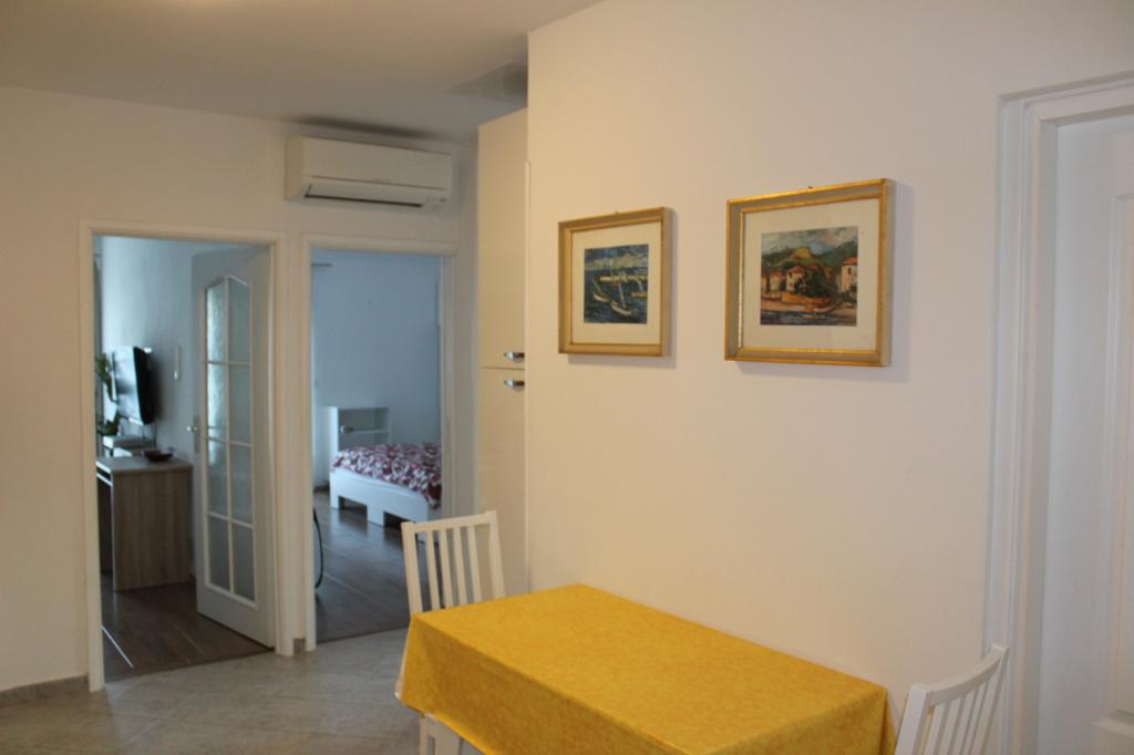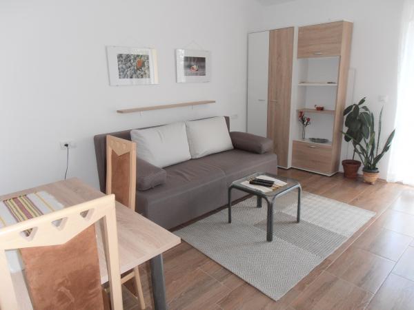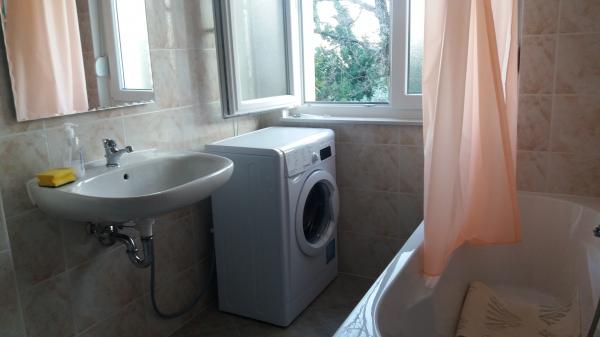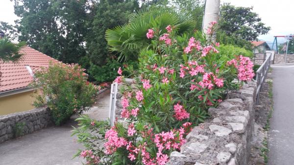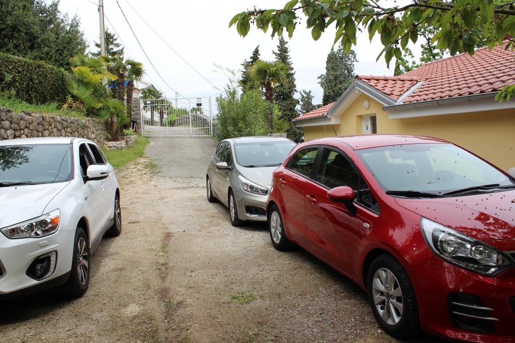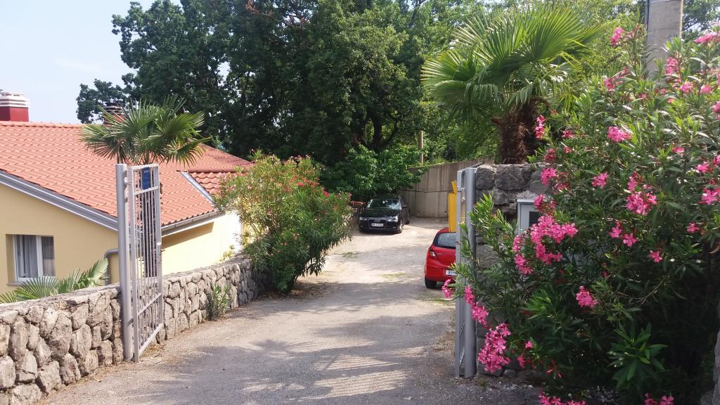 Miejsca parkingowe znajdują się na podwórzu, kilka metrów od wejścia. Do drzwi wejściowych prowadzą tylko 3 stopnie. Pozycja: od strony wejścia - parter od strony morza - 2 piętro Na piętrze znajdują się 2 apartamenty, pozostała część domu jest użytkowana prywatnie. Sąsiednie domy nie są zbyt blisko. Jest dużo zieleni.