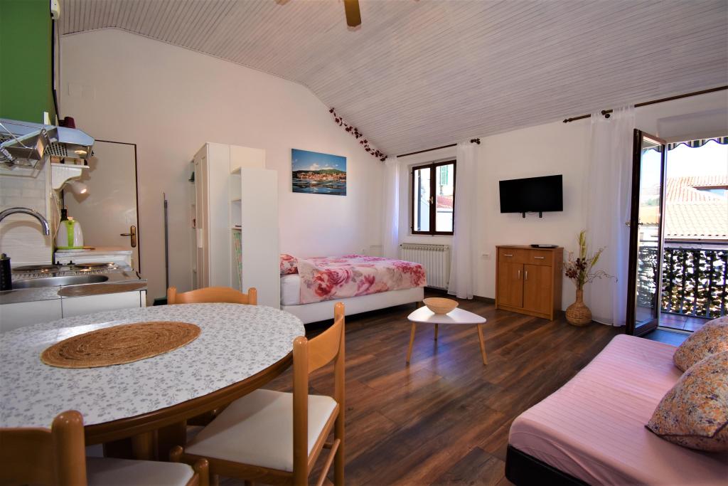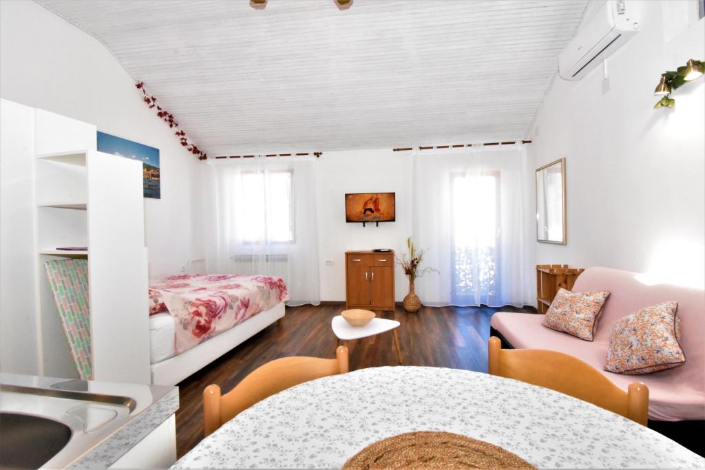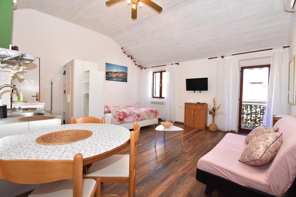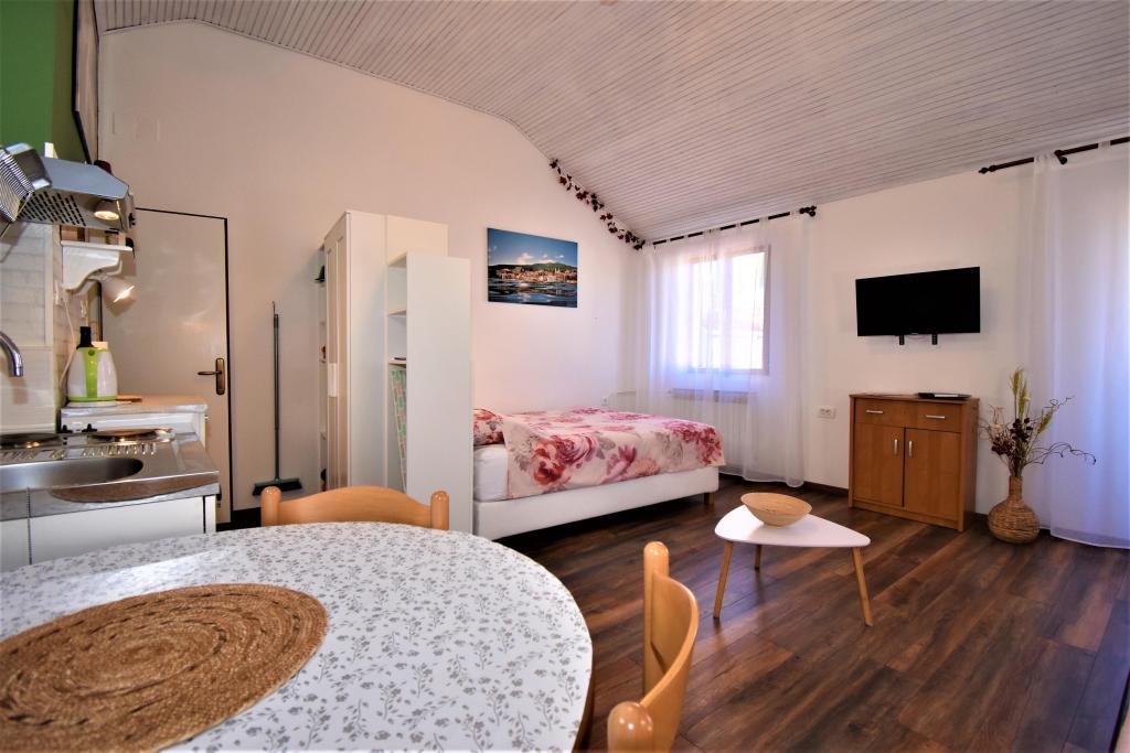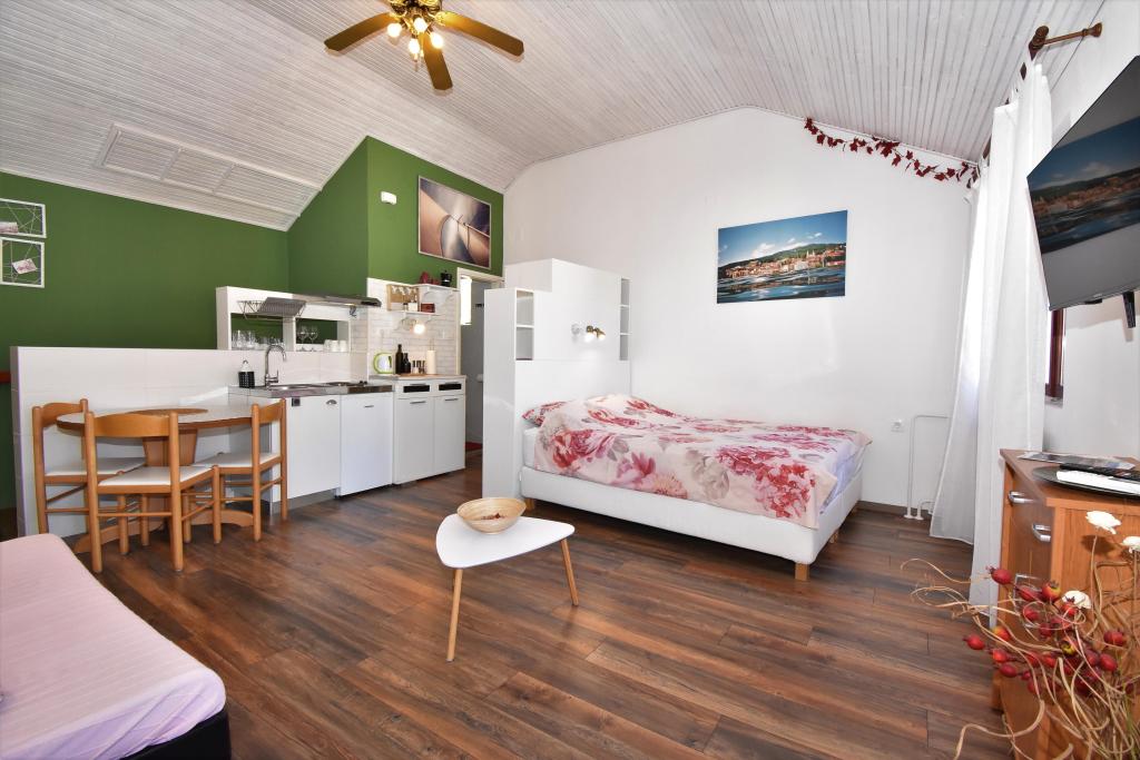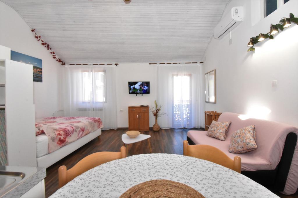 Dwa apartamenty typu studio, każdy z jednym łóżkiem podwójnym i jednym łóżkiem dodatkowym, znajdują się w Volosko, spokojnej części Opatiji, dawnej wioski rybackiej. Do morza oddalone są zaledwie 50 m. W ich bezpośrednim sąsiedztwie znajdują się sklepy spożywcze i kilka najlepszych restauracji na Riwierze Opatija! Studio+1 ID:2710 składa się z pokoju z łóżkiem małżeńskim i dostawką (rozkładana sofa), aneksu kuchennego będącego częścią pokoju, łazienki (prysznic/WC) oraz balkonu z widokiem na morze. Studio+1 ID:2711 ma wszystko, co ma Studio+1 ID:2710 z wyjątkiem balkonu i widoku na morze. Zamiast balkonu, Apartament Studio 2 posiada wyjście na taras (bez widoku na morze).