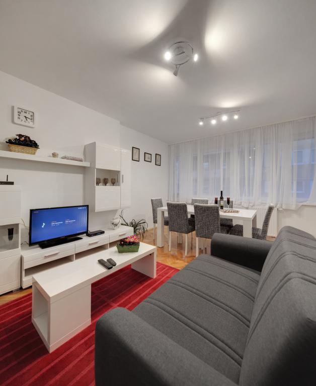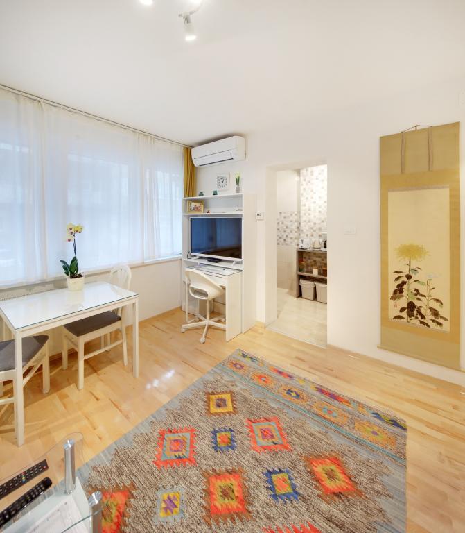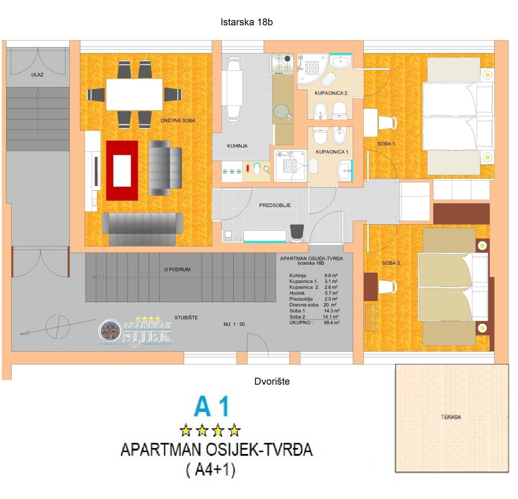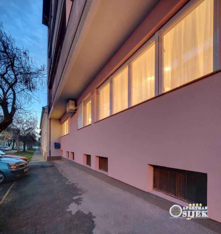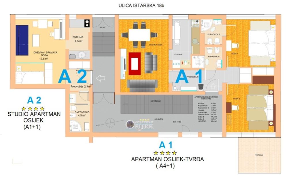 Apartament Tvrđa i Studio apartament Osijek znajdują się na wysokim parterze budynku przy ulicy Istarskiej, w pobliżu Eurodomu, gdzie przewidziano miejsca parkingowe. Apartamenty znajdują się blisko głównych ulic i dróg łączących Osijek z okolicznymi miejscowościami oraz autostradą A5. W bezpośrednim sąsiedztwie apartamentu znajduje się stadion piłkarski i hala sportowa „Ogród Miejski”, „Baseny Miejskie”, restauracje oraz historyczne centrum Osijeku – Barokowa Twierdza. Apartament Tvrđa to trzypokojowe mieszkanie o powierzchni 68 m². Do Państwa dyspozycji oddajemy dwie dwuosobowe sypialnie oraz salon z rozkładaną sofą, dwie łazienki, kuchnię oraz taras. Apartament typu studio w Osijek ma powierzchnię 30 m². Składa się z przedpokoju, salonu, sypialni, kuchni i łazienki. Sypialnia, w której znajduje się łóżko, oddzielona jest od salonu przesuwnymi drzwiami pokrytymi lustrami. W salonie znajduje się rozkładana sofa. Jedno miejsce postojowe przewidziano w garażu podziemnym Eurodomu, w bezpośrednim sąsiedztwie budynku.