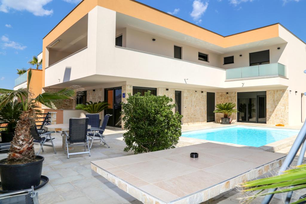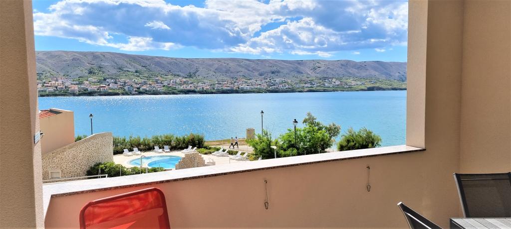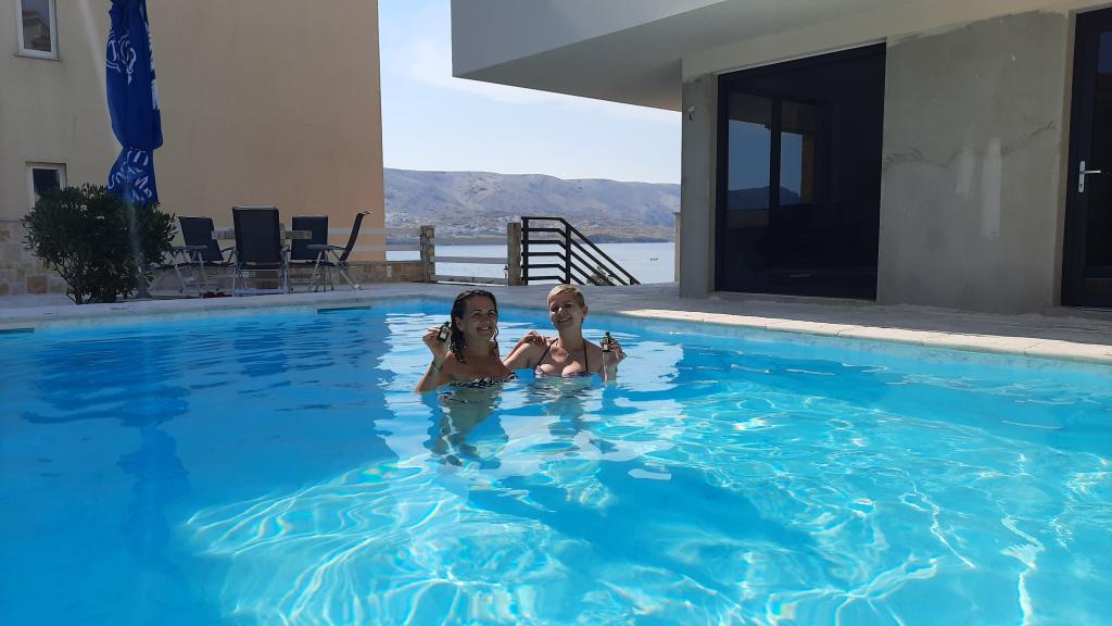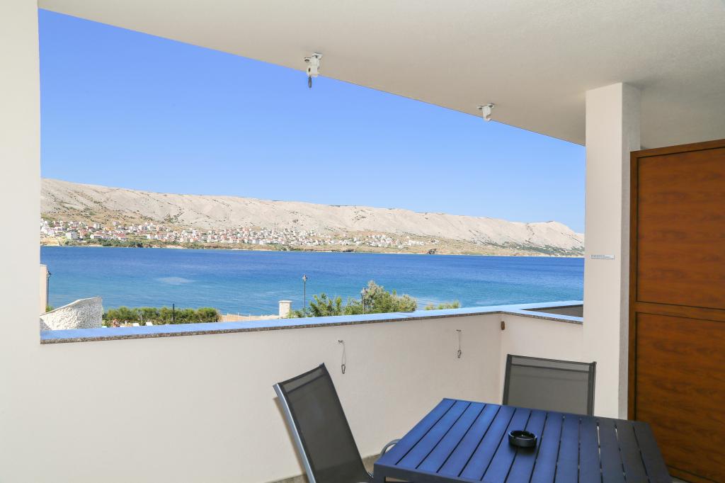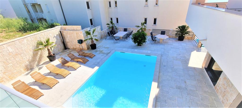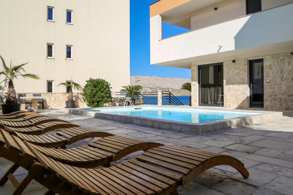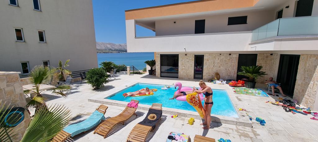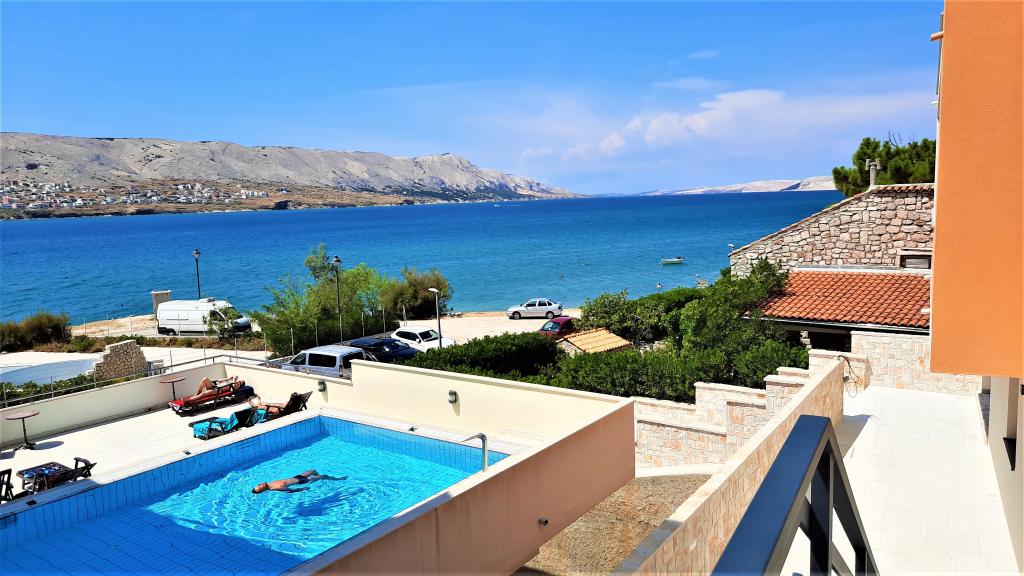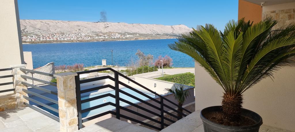 Nowoczesna willa apartamentowa z basenem w pierwszym rzędzie do morza, 400 m od centrum Pag - spacer nad morzem. Pojemność zakwaterowania to 6 apartamentów o różnej wielkości i wnętrzu. Apartamenty są klimatyzowane i nowocześnie wyposażone, z przestronnymi tarasami i widokiem na morze.