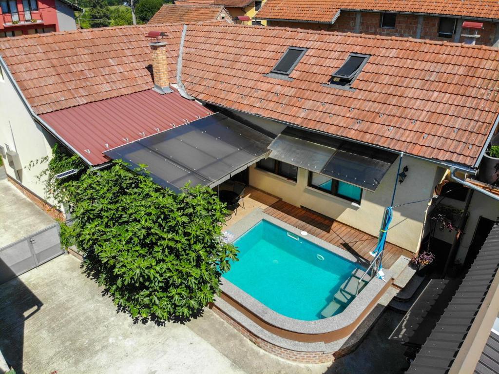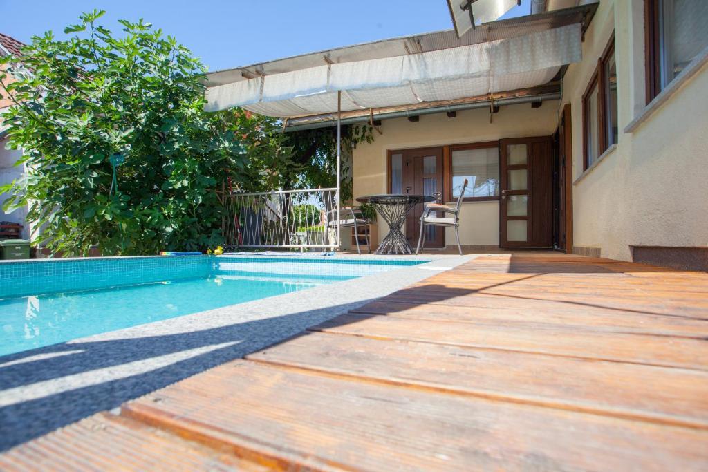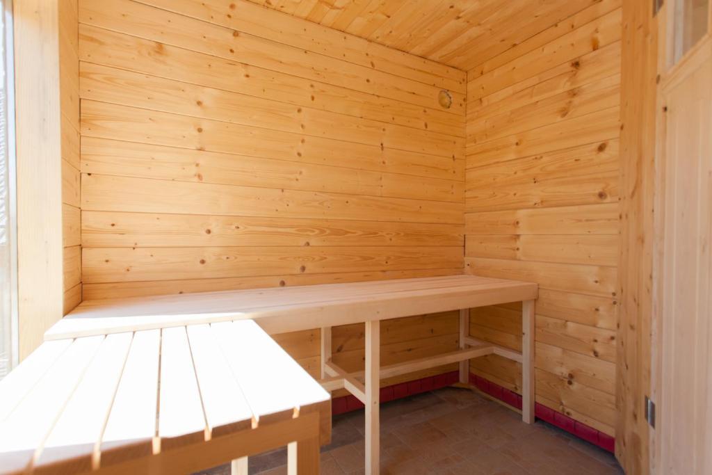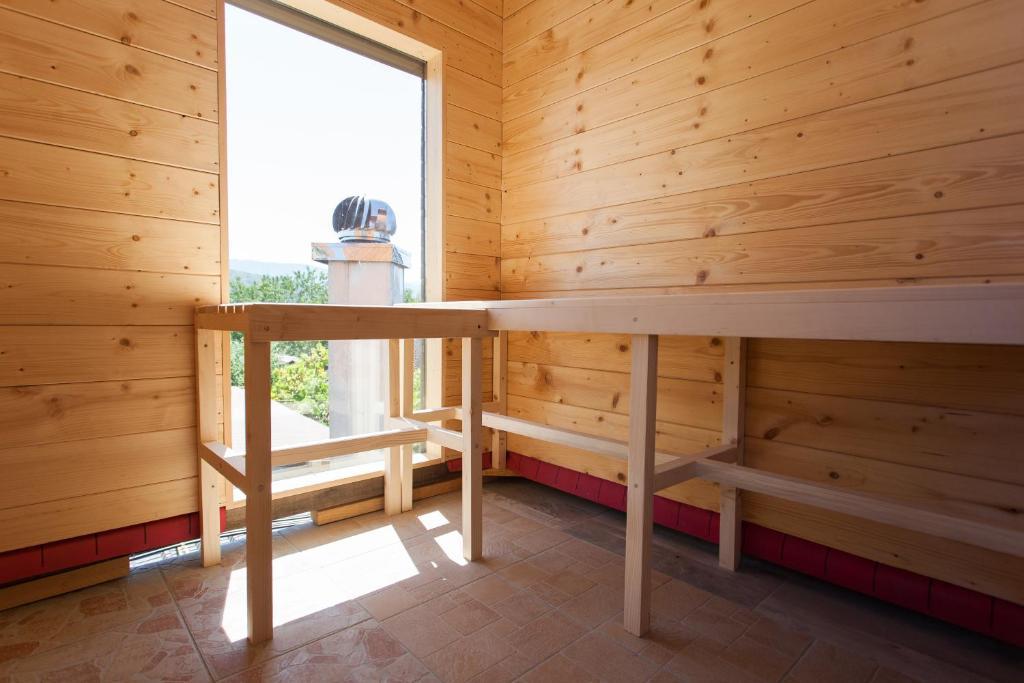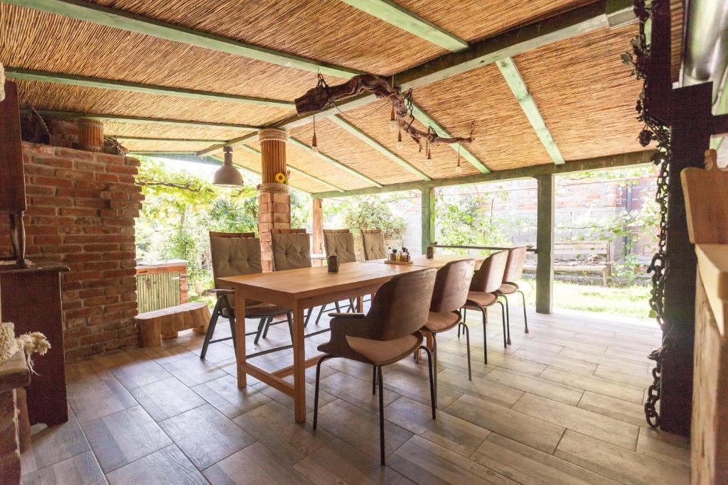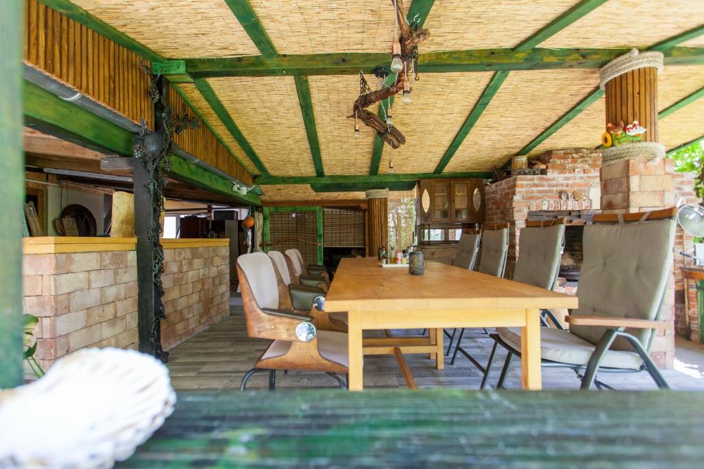 Dom wakacyjny składa się z dwóch pokoi i antresoli z łóżkiem małżeńskim, pokoju dwuosobowego z dwoma oddzielnymi łóżkami i dostawką dla dwóch osób. Posiada dwie łazienki, kuchnię i przestronny salon. Możliwość korzystania z basenu zewnętrznego, sauny i jacuzzi, wi-fi, max-tv, parking. W otoczeniu zieleni znajduje się zadaszony taras zewnętrzny z grillem, piekarnikiem, czajnikiem, szaszłykami. Dostępne są gry planszowe, karciane, człowieku nie złość się, badminton z siatką, łuk i strzały, rzutki, trampolina i huśtawki dla dzieci.