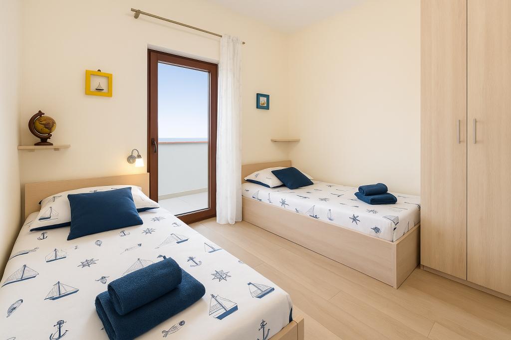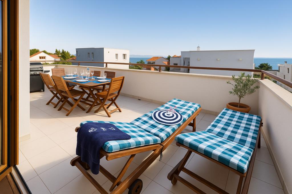 - Widok na morze - Parking - 3 sypialnie - 1 łazienka - Klimatyzacja - Duży taras - Grill - Zmywarka - Pralka - Rozkładana sofa - Wyposażona kuchnia - Internet - Telewizja (satelita)