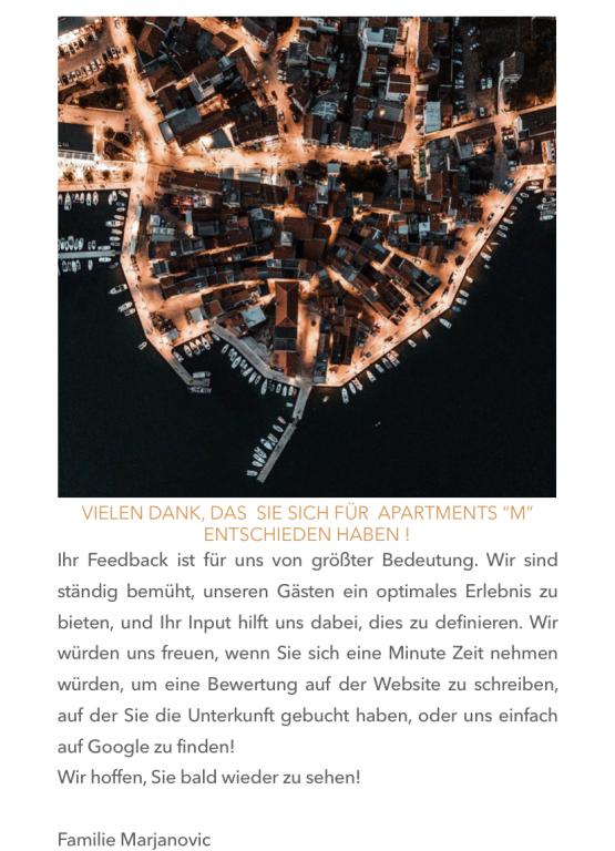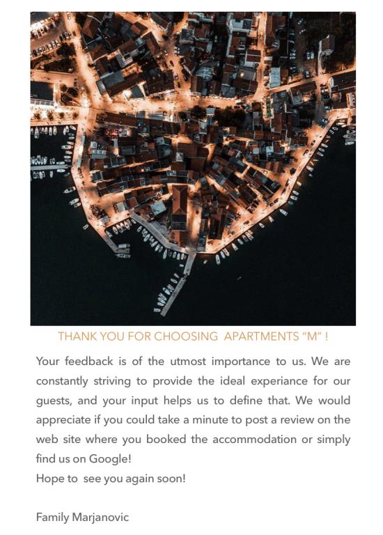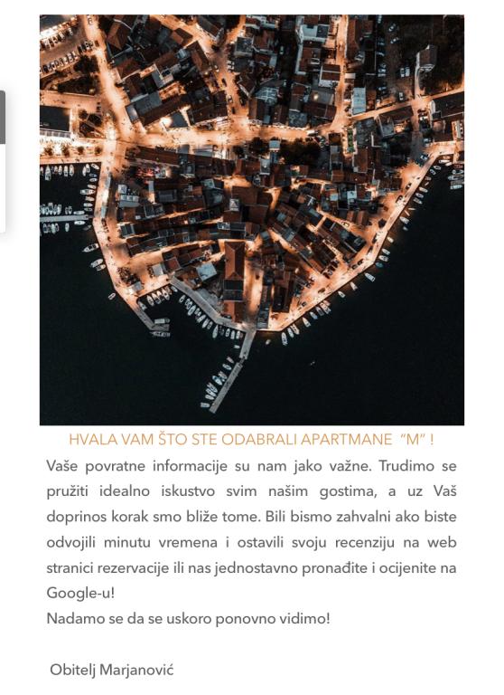 Droga Danijela, zawsze nas zachwyci, gdy goście są szczęśliwi i zadowoleni. Zrobimy to w przyszłym roku. Do zobaczenia! W lipcu, Apartamenty M