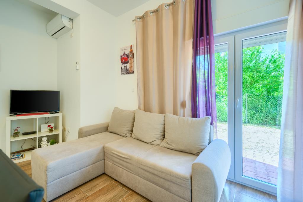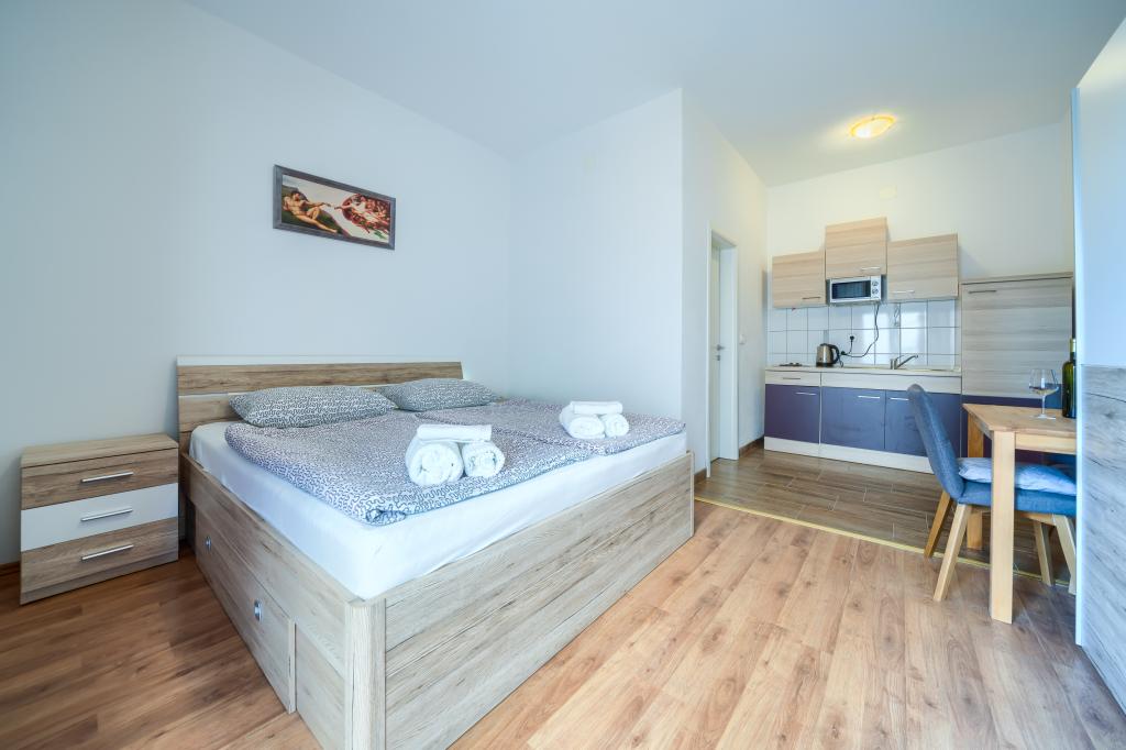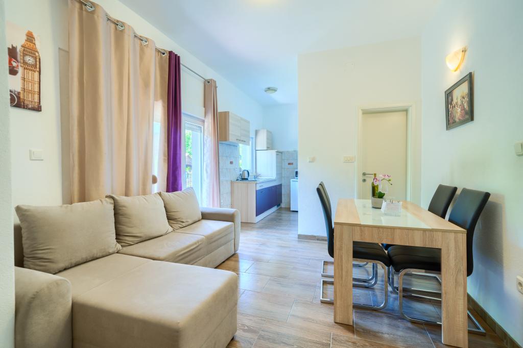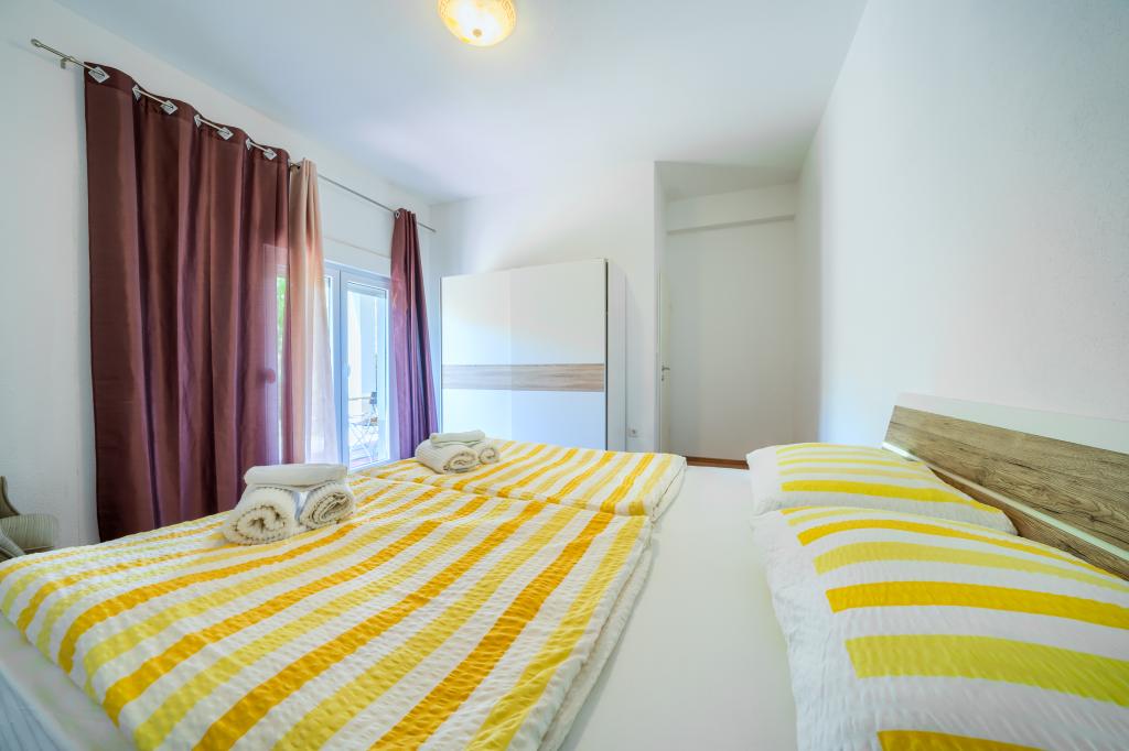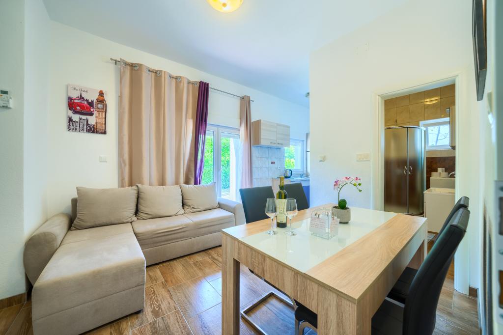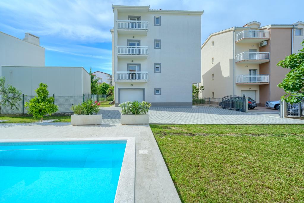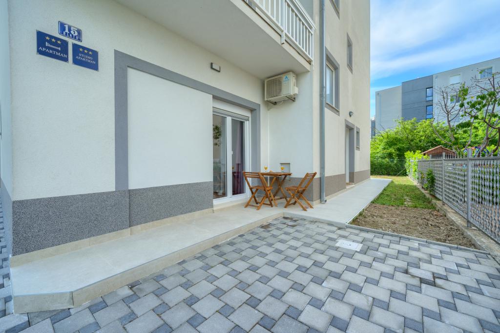 Nowe i nowocześnie wyposażone apartamenty w spokojnej okolicy, położone 200m od morza. Obiekt położony jest 5 minut spacerem od 3 kamienistych plaż, kawiarni, sklepów, restauracji, drogerii, gabinetów lekarskich i aptek. Wszystkie jednostki wyposażone są w klimatyzację, TV, jadalnię, łazienkę i taras. Nowy basen o wymiarach 8x4m jest dostępny wyłącznie dla gości apartamentów.