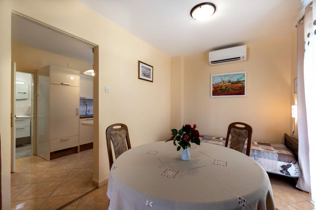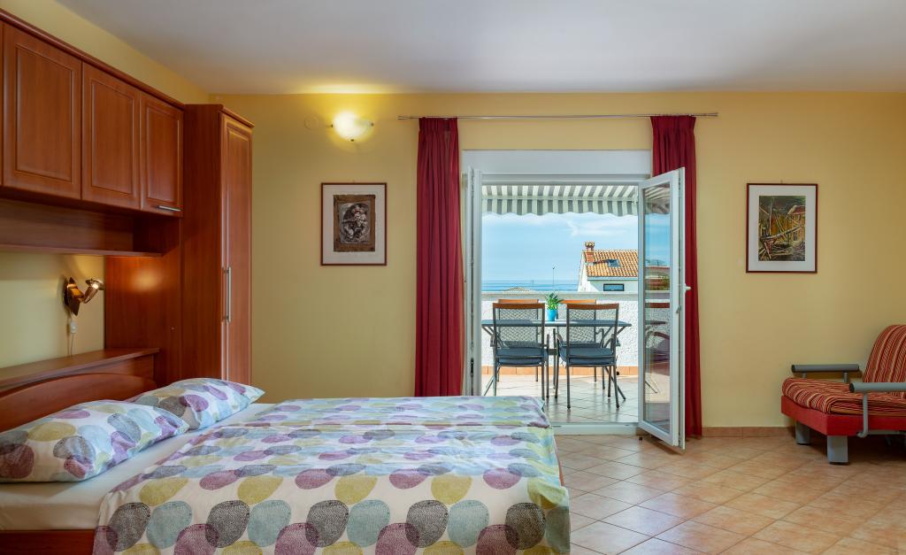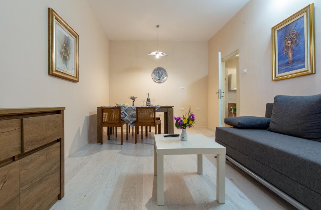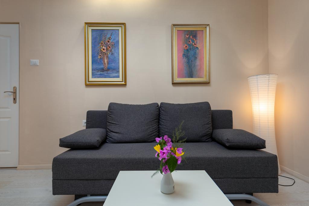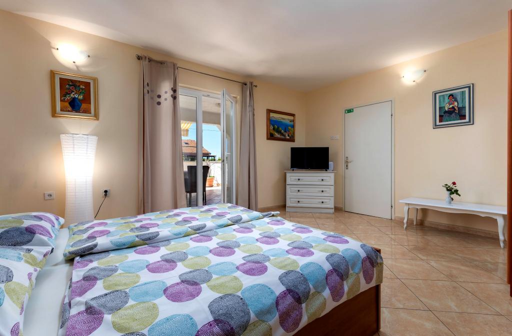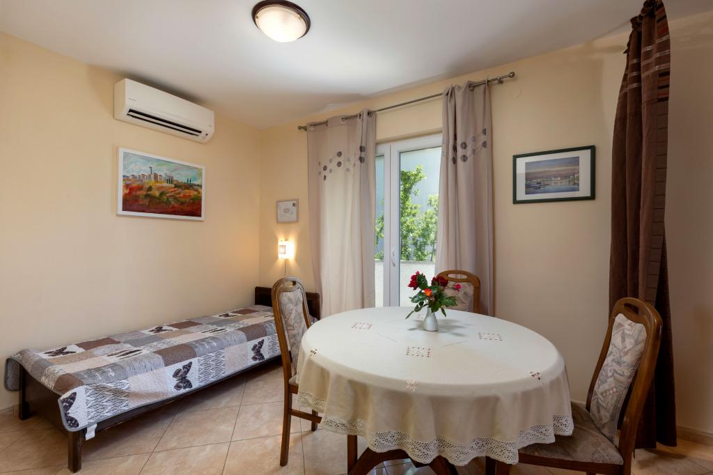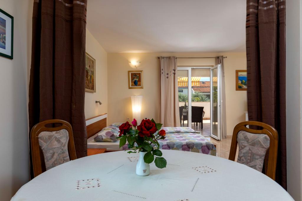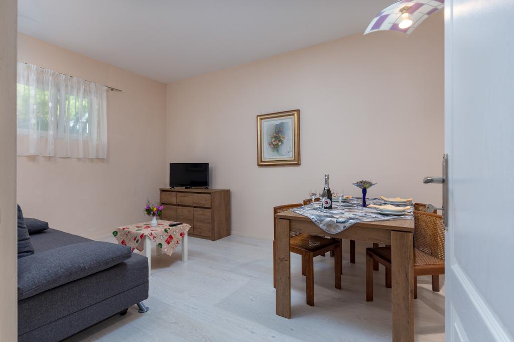 Apartamenty są ładnie urządzone i znajdują się 2 minuty jazdy samochodem od morza i miasta. Wszystkie apartamenty posiadają duży taras, niektóre z widokiem na morze. Parking dla samochodów znajduje się na ogrodzonym podwórzu.