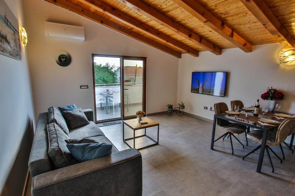 Mieszkanie znajduje się na pierwszym piętrze z pięknym widokiem na morze Już samo wejście do mieszkania zapiera dech w piersiach, ponieważ widok już ucieka na taras i widok Mieszkanie jest nowocześnie wyposażone w sypialnię z podwójnym łóżkiem 180 x 200, telewizję satelitarną, sejf, łazienkę z prysznicem, pralkę, kuchnię z balkonem, pralkę, telewizję satelitarną i piękny widok W apartamencie znajduje się ekspres do kawy, czajnik, suszarka do włosów, żelazko i parking