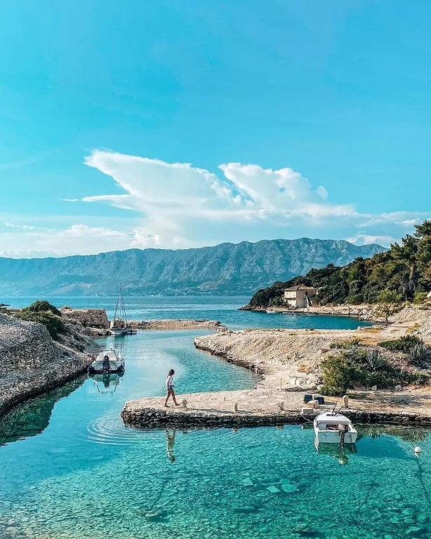 Dom oddalony jest ok. 50 m od morza, najbliższa restauracja ok. 50 m, najbliższy sklep spożywczy ok. 50 m Dom w starym stylu dalmatyńskim, w centrum, z pięknym widokiem na morze , w cichym i spokojnym miejscu, blisko plaży (5-10 minut spacerkiem), na podwórku domu znajduje się sad, podwórko jest w cieniu zieleni, dom posiada własny parking. Darmowe Wi-Fi, klimatyzacja. Dodatkowe usługi: pranie można wyprać u gospodarza po uzgodnieniu, gospodarz prowadzi sprzedaż produktów spożywczych własnej produkcji. (oliwa z oliwek, brandy)