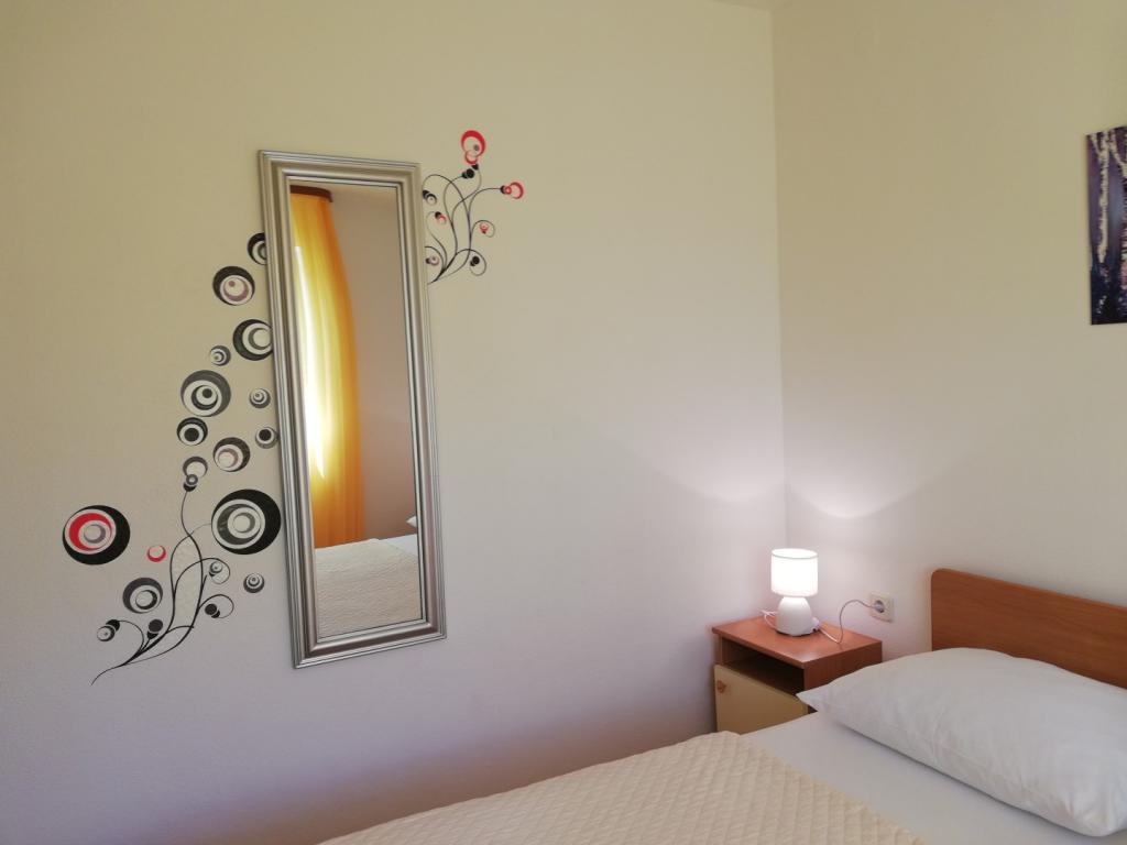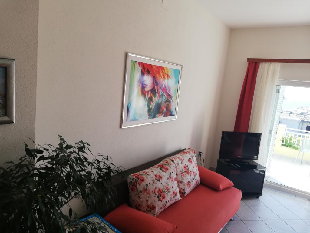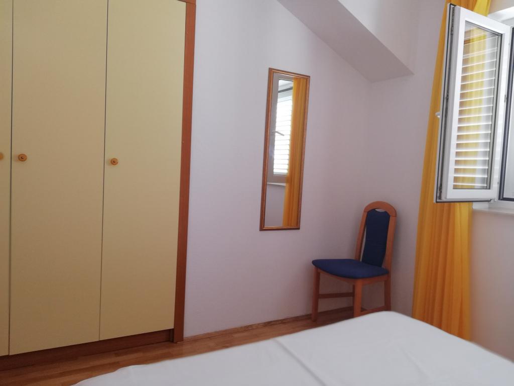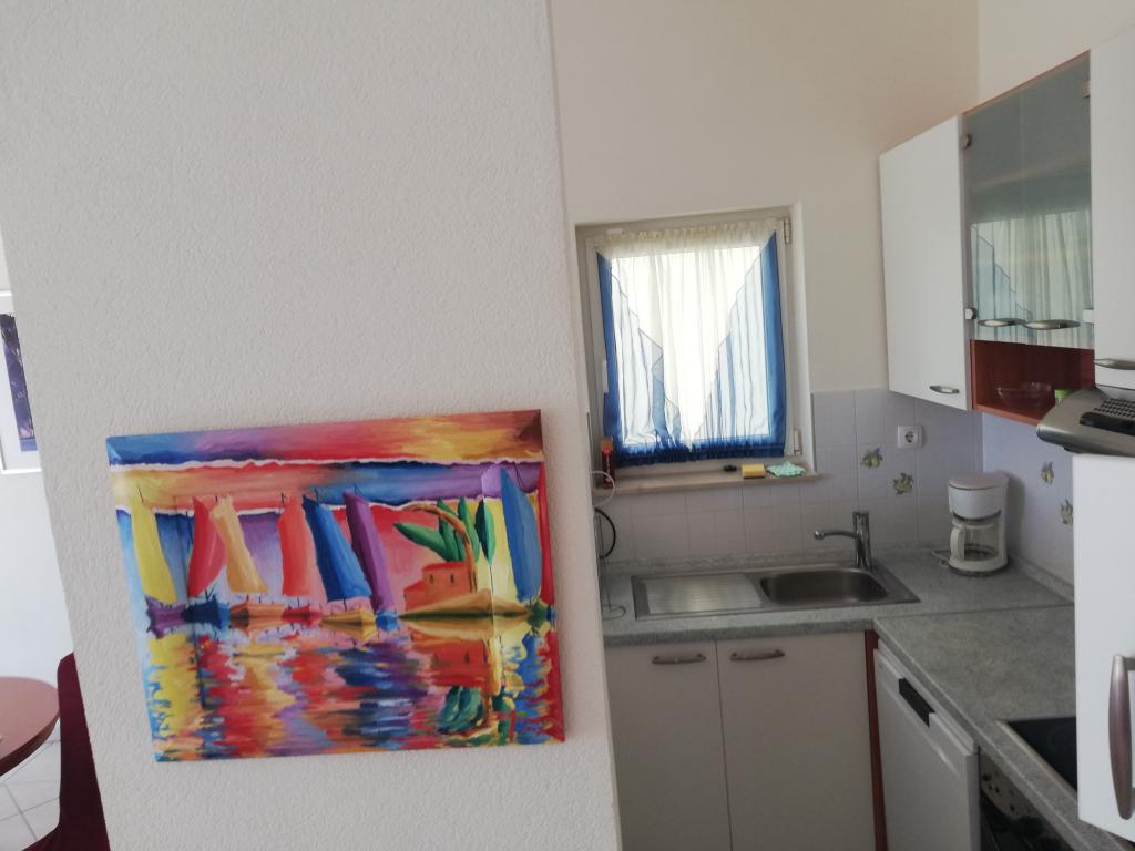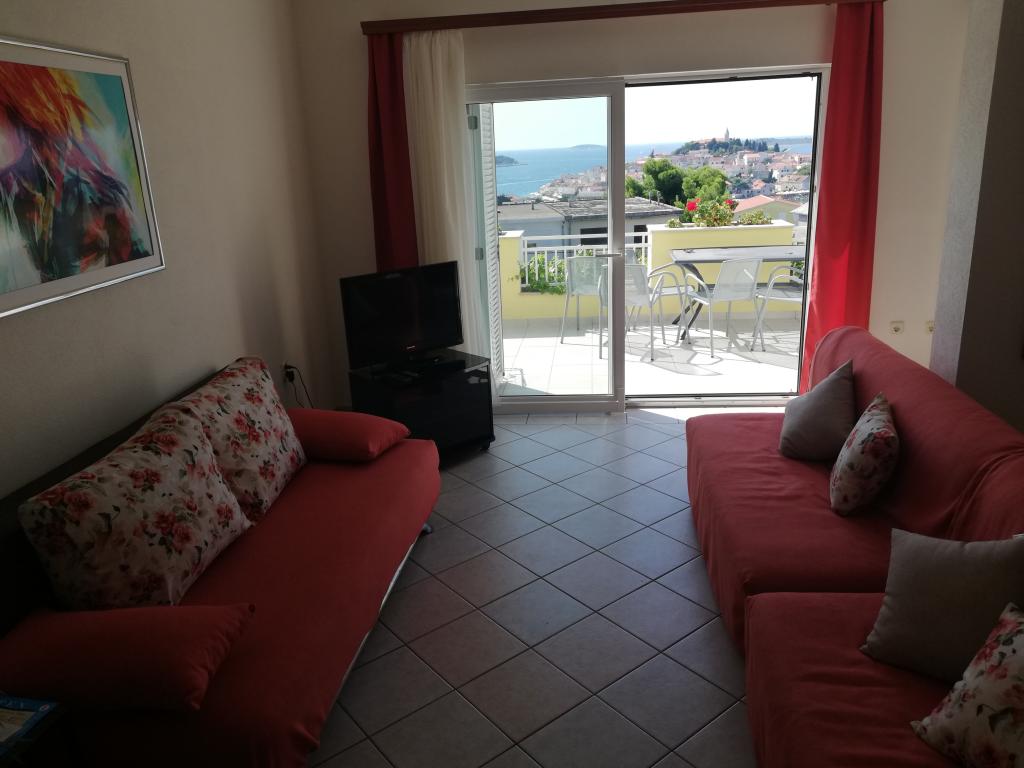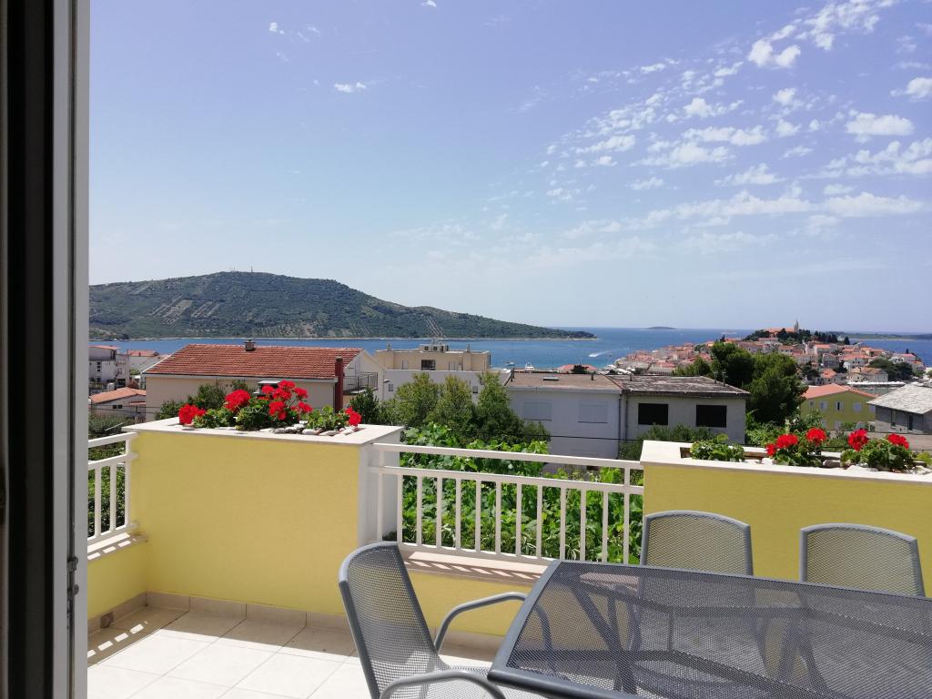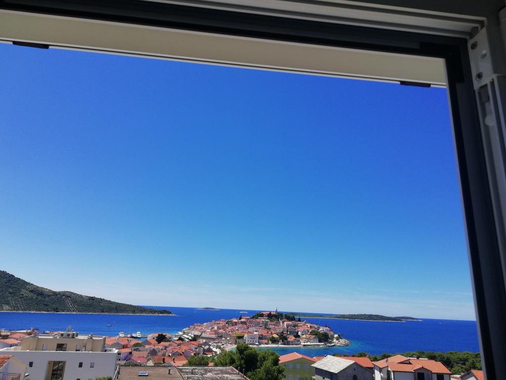 Wygodne i ładnie urządzone mieszkanie, położone na niewielkim wzniesieniu nad drogą u szczeniaka Primo. Z apartamentu i tarasu roztacza się piękny widok na morze i Stare Miasto. To tylko 8 minut spacerem od plaży, również od centrum miasta. Mieszkanie składa się z sypialni dla dwóch osób, kuchni z salonem, łazienki i tarasu. W salonie znajduje się rozkładana sofa dla dwóch osób. Odpowiedni dla małżeństwa z małymi dziećmi. Mieszkanie znajduje się na 1. piętrze.
