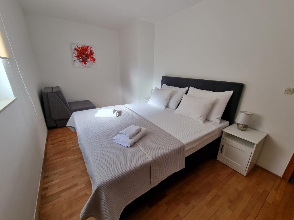 Przeżyj niezapomniane letnie wakacje w sercu miasta Rab na wyspie Rab w naszych komfortowych apartamentach położonych w spokojnej okolicy starych murów miejskich. Emocji nie ominie Cię podziwianie przepięknej panoramy z tarasu na dachu większego apartamentu, skąd będziesz mógł podziwiać niesamowite widoki na cztery słynne dzwonnice miasta. Nie przegap okazji, aby cieszyć się bliskością miejskiej plaży, zaledwie 2 minuty spacerem od apartamentu, lub odkrywać ulice i sklepy przy głównej ulicy, zaledwie 30 metrów od nieruchomości. A jeśli chcesz spróbować lokalnych potraw, restauracja znajduje się zaledwie 10 metrów od apartamentu! Dzięki bezpłatnemu parkingowi dla wszystkich gości na miejskim parkingu, który znajduje się tuż przy nabrzeżu, zaledwie kilka minut spacerem od apartamentu, nie musisz się o nic martwić. Zarezerwuj teraz i przeżyj niezapomniane letnie wakacje w sercu miasta Rab na wyspie Rab!