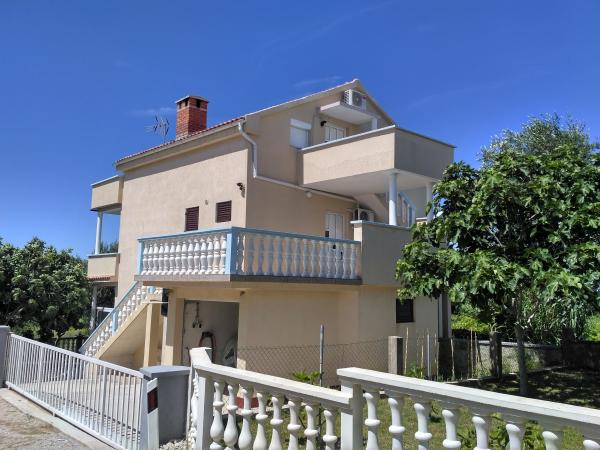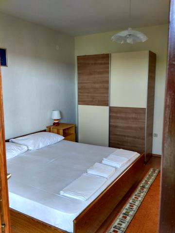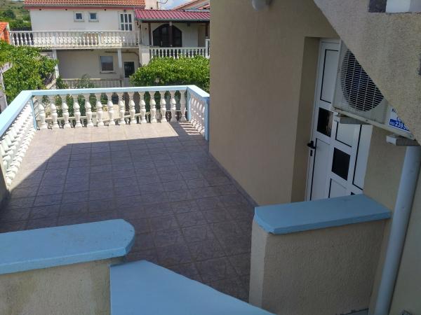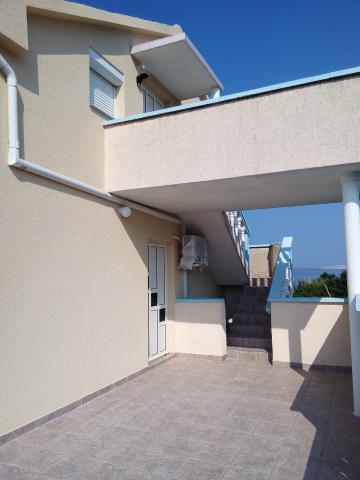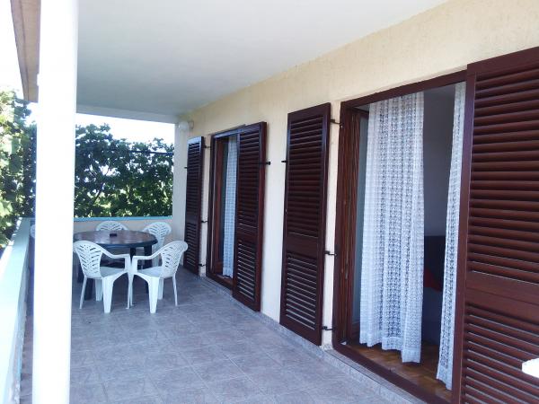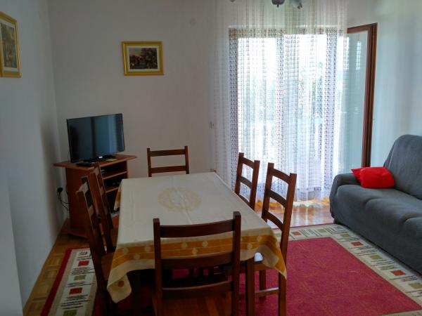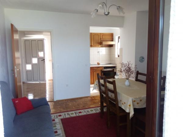Mieszkanie znajduje się w kamienicy na pierwszym piętrze. Apartamenty posiadają dwie sypialnie. W jednej sypialni są dwa pojedyncze łóżka. W drugiej sypialni znajduje się podwójne łóżko i inne łóżko na boku. Z tego pokoju i wyjściem na duży balkon z widokiem na morze i centrum Miocic Rtina. W salonie znajduje się komplet kanapa (sofa), stół z 6 krzesłami i TV. Jest też balkon. Kuchnia jest połączona z salonem i jest wyposażony w naczynia i sztućce dla 6 osób. Kuchnia wyposażona jest el.pločom gotowania, piekarnik, lodówkę i czajnik. Łazienka wyposażona jest w standardowym prysznicem i el.bojlerom. Klimatyzacja została zainstalowana w korytarzu. Wejście do mieszkania z dużym tarasem, który może być również używany jako prysznic na świeżym powietrzu i grilla. Do plaży trzeba iść tylko 10 sekund. Odległość do piekarni i restauracji jest 400m, natomiast sklep (mini market) i inne restauracje 800m.