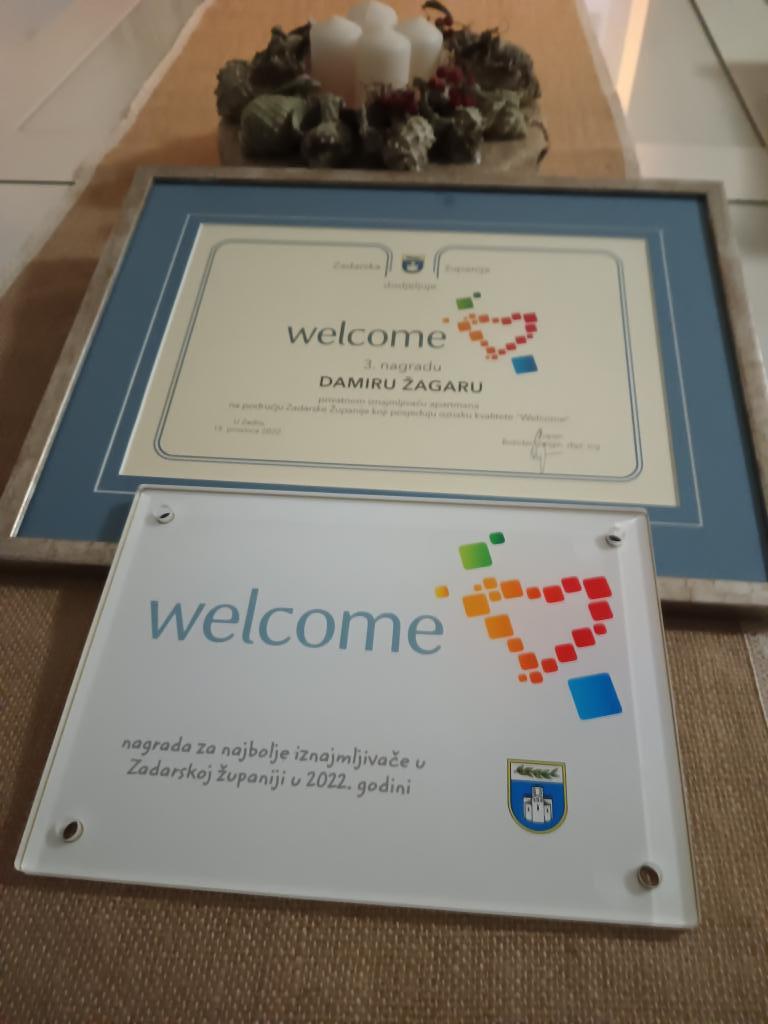 Drodzy goście, czekam na wasz przyjazd. Otrzymaliśmy naklejkę Welcome dla najlepszych wynajmujących w Zadarze. Zajęliśmy trzecie miejsce w kategorii apartamentów.