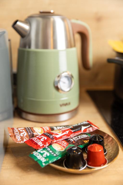 Ekspres do kawy Kuchenka mikrofalowa Lodówka Zmywarka Telewizor z Netflix i EON TV Wygodna rozkładana sofa dla 2 osób Klimatyzator do ogrzewania/chłodzenia Nowocześnie urządzona sypialnia z podwójnym łóżkiem. Łazienka z prysznicem i WC z pralką.