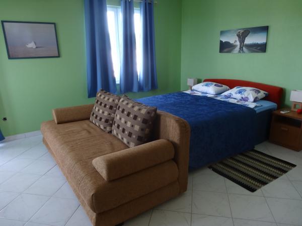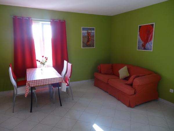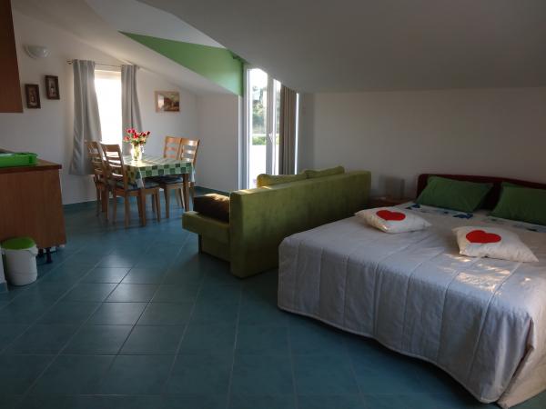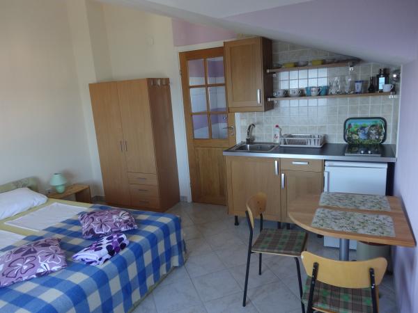 Apartamenty bardzo czyste ,zgodne z opisem. Plaża kamienista, z zejściem po drabince, ale w centrum jest fajna plaża z łagodnym zejściem. Na plaży można są bary.Miejscowość polecam dla ludzi lubiących spokój. Idealna dla rodzin z dziećmi. Jedyną wadą pokoji jest to że nie posiadają telewizora, ale ogólnie polecam.
