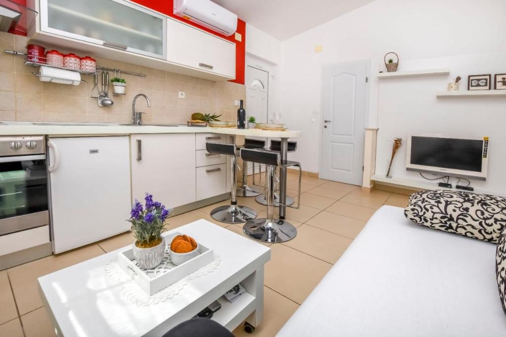 Oferujemy 2 apartamenty z jedną sypialnią, dwa apartamenty z dwiema sypialniami i 1 sypialnię z trzema sypialniami w nowej i luksusowej pozycji, zaaranżowane zgodnie z wymaganiami gwiazdkowymi, w pełni umeblowane i wyposażone. W sypialniach i łóżkach 160200 dla dwóch osób, w salonie 180200 rozkładanych sof z wbudowanym anatomicznym materacem i dodatkowym łóżkiem na życzenie. Ultra nowoczesna kuchnia ze wszystkimi wbudowanymi i innymi urządzeniami. Apartamenty wyposażone są również w sejf, klimatyzację, telewizor LCD, łącze internetowe USB, pralkę w apartamencie właściciela. Łóżeczko dziecięce na życzenie. Zabezpieczone miejsce parkingowe i kotwicowisko dla łodzi. Mamy nadzieję, że poczujesz się komfortowo w naszych apartamentach, zauważając, że wszystkie meble są anatomiczne i wykonane na zamówienie.