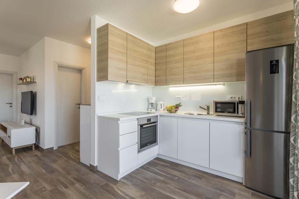Wszystko jest jak na zdjęciu, nowe i jasne. Łóżka są wyjątkowo wysokiej jakości i wygodne. Inne meble i wyposażenie są połączone w jakość i smak. Klimatyzator milczy, a brzęczenie jednostek zewnętrznych nie jest słyszalne, dzięki czemu można cieszyć się tarasem i spać w otwartym oknie. Kuchnia jest w pełni wyposażona, jeśli chcesz gotować. Morze i betonowa plaża znajdują się w odległości 1-minutowego spaceru, a plaża żwirowa - 3-4 minuty spacerem wzdłuż morza. Mieszkanie jest idealne na spokojne rodzinne wakacje. Byliśmy 4, spędziliśmy 9 dni w mieszkaniu i wszyscy czuliśmy się w apartamencie i byliśmy więcej niż szczęśliwi! Pan Damir i jego żona są bardzo mili.