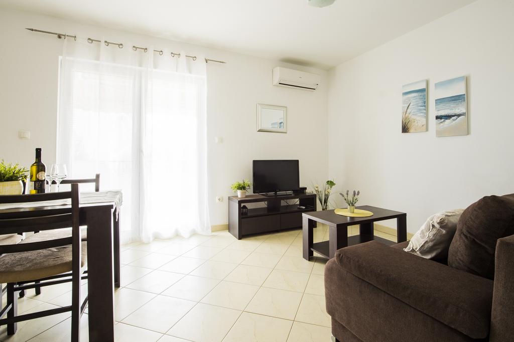 Polecam szczerze te apartamenty, dom niedaleko plaży, o godz. 7.30 w uliczce, która kończy się przed posesją staje pan z pieczywem, parking przy budynku duży, z miejscem do grilowania. Sam apartament przestronny, dobrze wyposażony, w kuchni połączonej z salonem, nie brakuje niczego do przyrządzania posiłków, w dwóch sypialniach łóżka małżeńskie z wygodnymi materacami, w oknach okiennice oraz moskitiery. Balkon duży z widokiem na morze. Gospodarze bardzo mili i pomocni, przywitali nas półmiskiem własnych wędlin oraz winem, w dniu wyjazdu także otrzymaliśmy robione przez nich trunki. Niedaleko domu, kilka zróżnicowanych plaż do wyboru.
