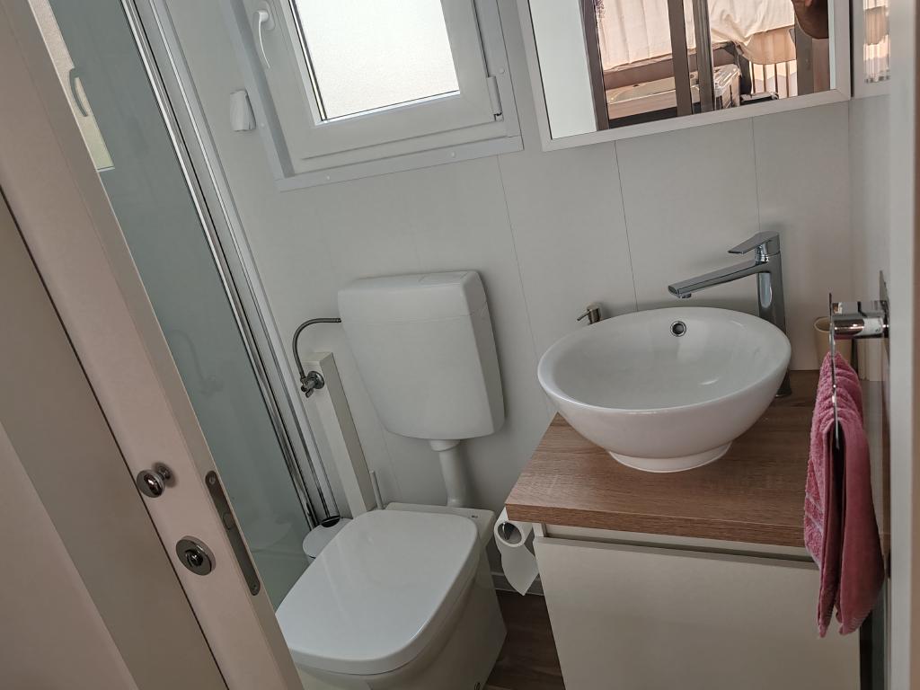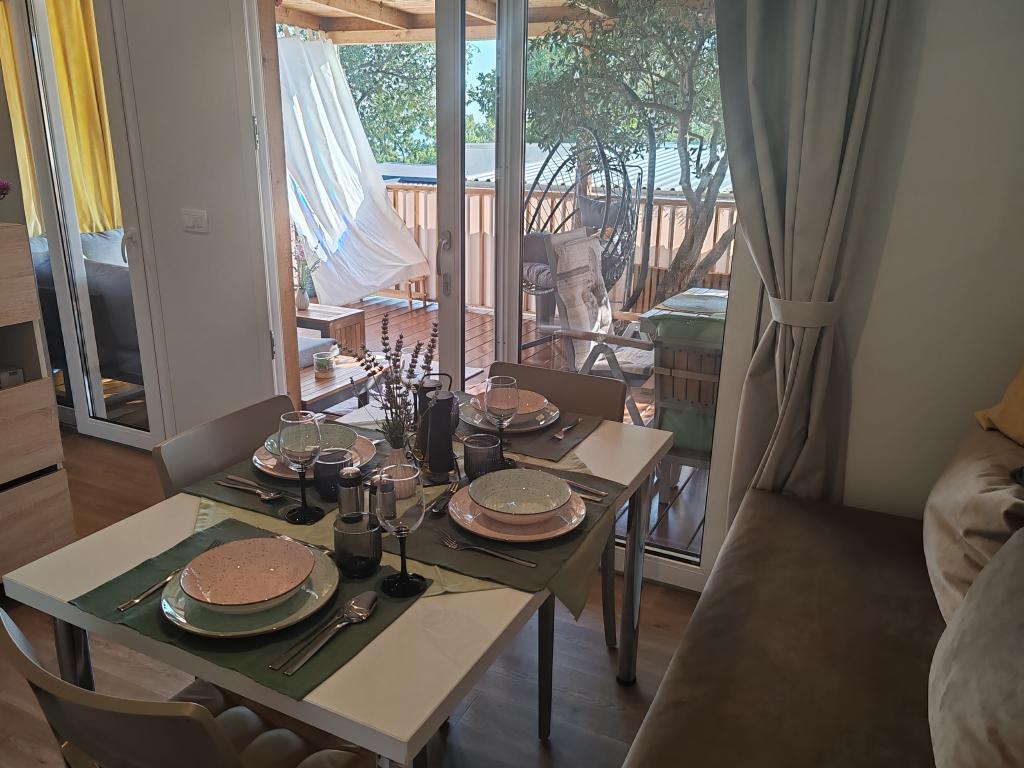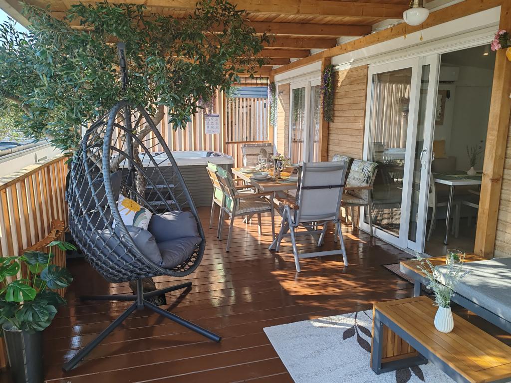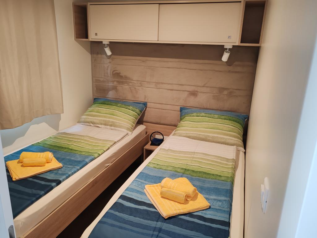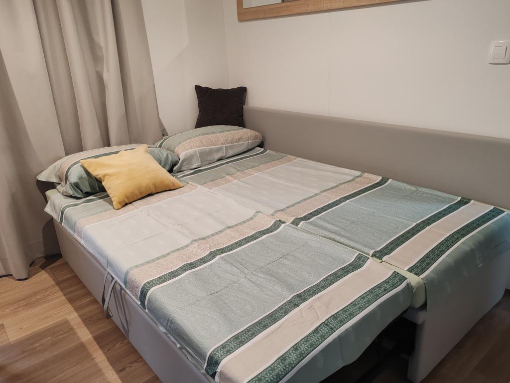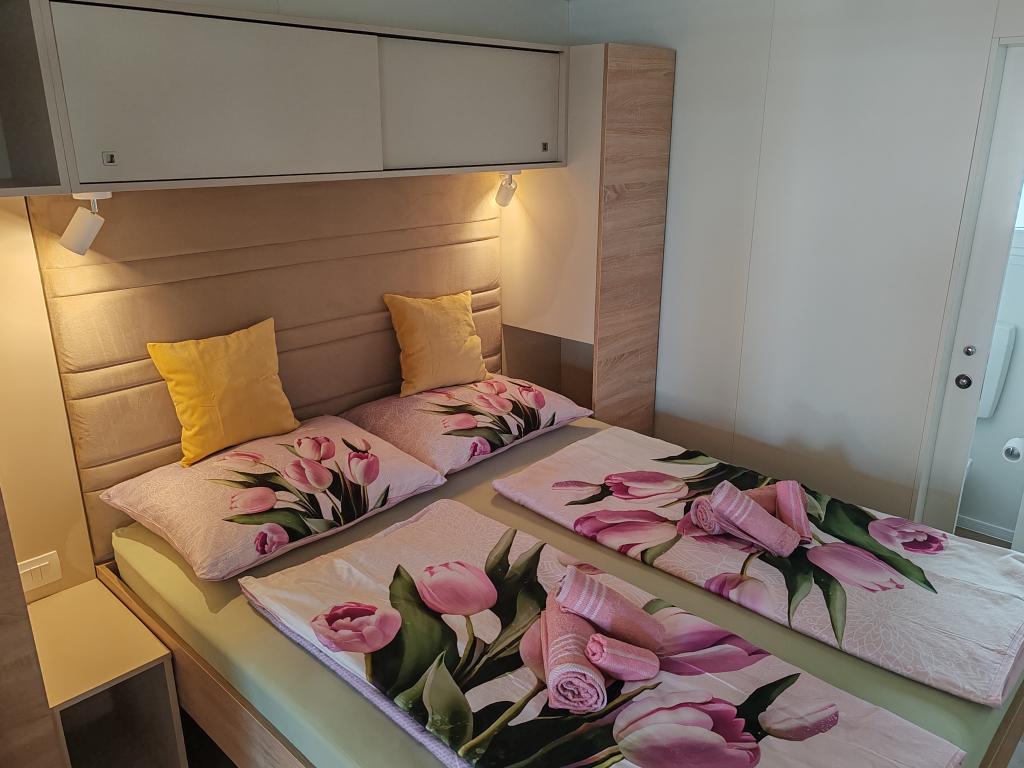 W pełni wyposażony i nowoczesny dom mobilny w doskonałej lokalizacji na znanym i dobrze wyposażonym kempingu, który oferuje wiele udogodnień, szczególnie dla rodzin z dziećmi. Dom o powierzchni 32 m² składa się z 2 sypialni, salonu oraz w pełni wyposażonej kuchni ze wszystkim, czego potrzebujesz, zmywarką, kuchenką mikrofalową, tosterem, ekspresem do kawy Dolce Gusto i czajnikiem. Do dyspozycji Gości są również dwie toalety z prysznicami. Jeden pokój wyposażony jest w łóżko podwójne o wymiarach 160 × 200 cm i własną łazienkę. Drugi pokój wyposażony jest w 2 łóżka pojedyncze o wymiarach 80 × 200 cm. W salonie znajduje się rozkładana sofa dla dwóch osób. Taras o powierzchni 29 m² wyposażony jest w podgrzewane jacuzzi z masażem i miejsca do siedzenia. Dom jest w pełni wyposażony we wszystko, czego potrzebujesz (pościel, ręczniki, kosmetyki itp.). Do dyspozycji Gości jest zewnętrzny grill gazowy. Kompleks basenowy znajduje się zaledwie 100 m dalej, a plaża oddalona jest o ok. 250 m. Do centrum Selc można dojść pieszo w zaledwie 13 minut. Bezpłatny parking prywatny i internet z telewizorem Smart TV (Netflix, YouTube itp.).