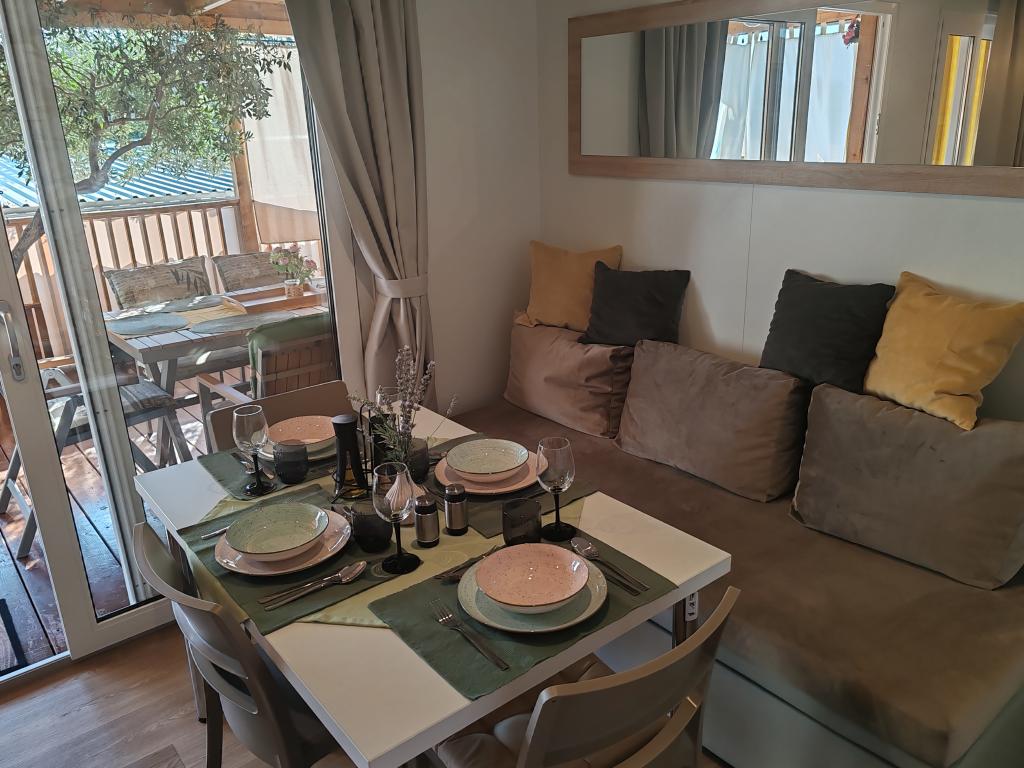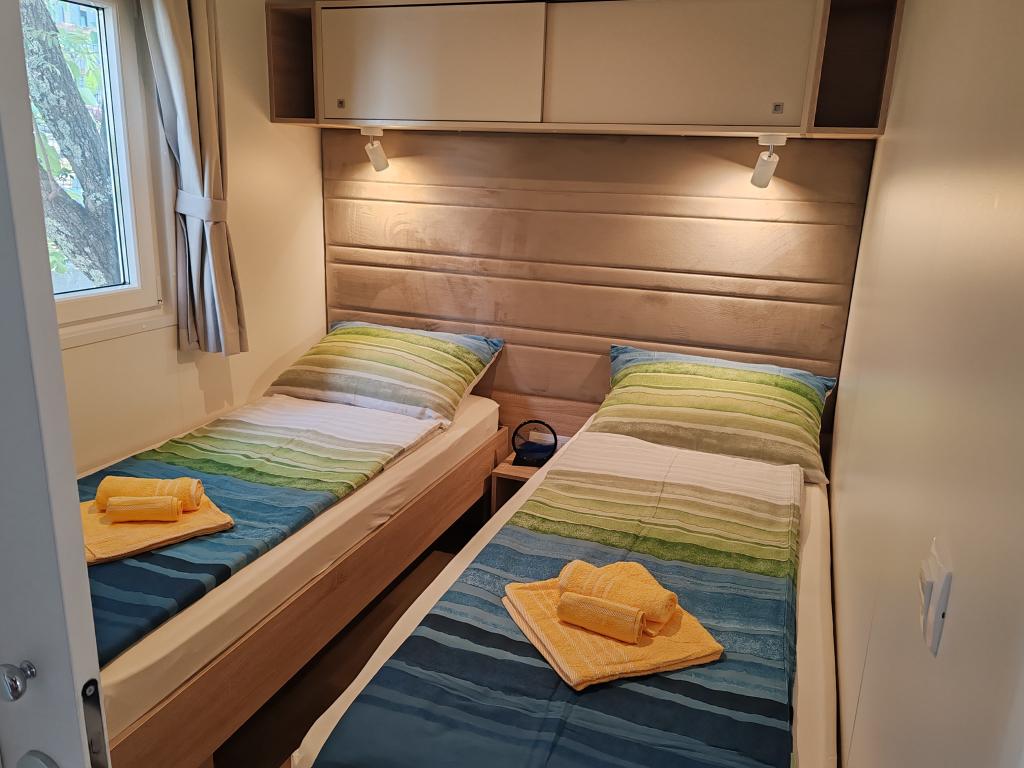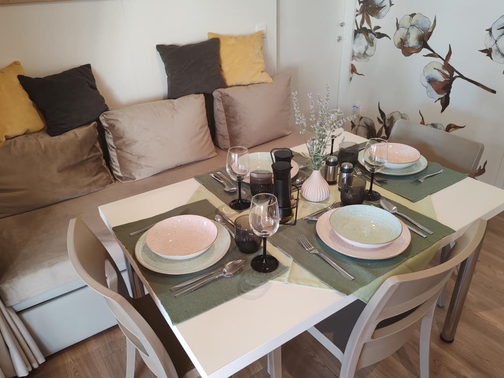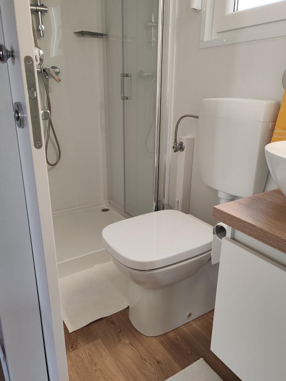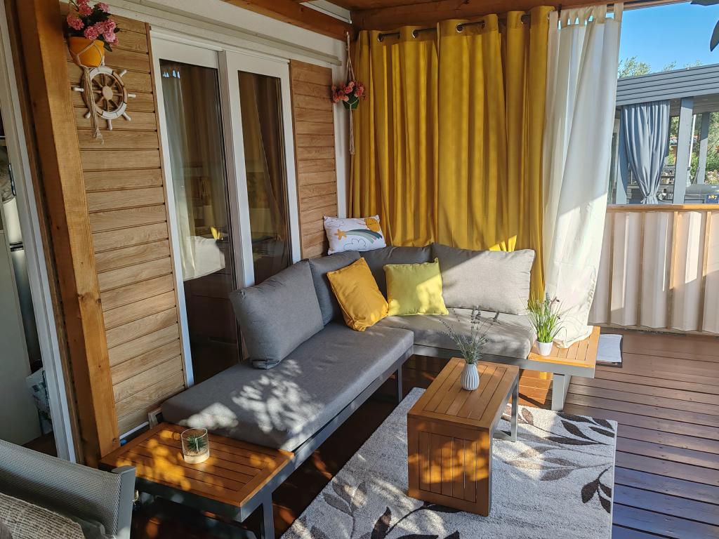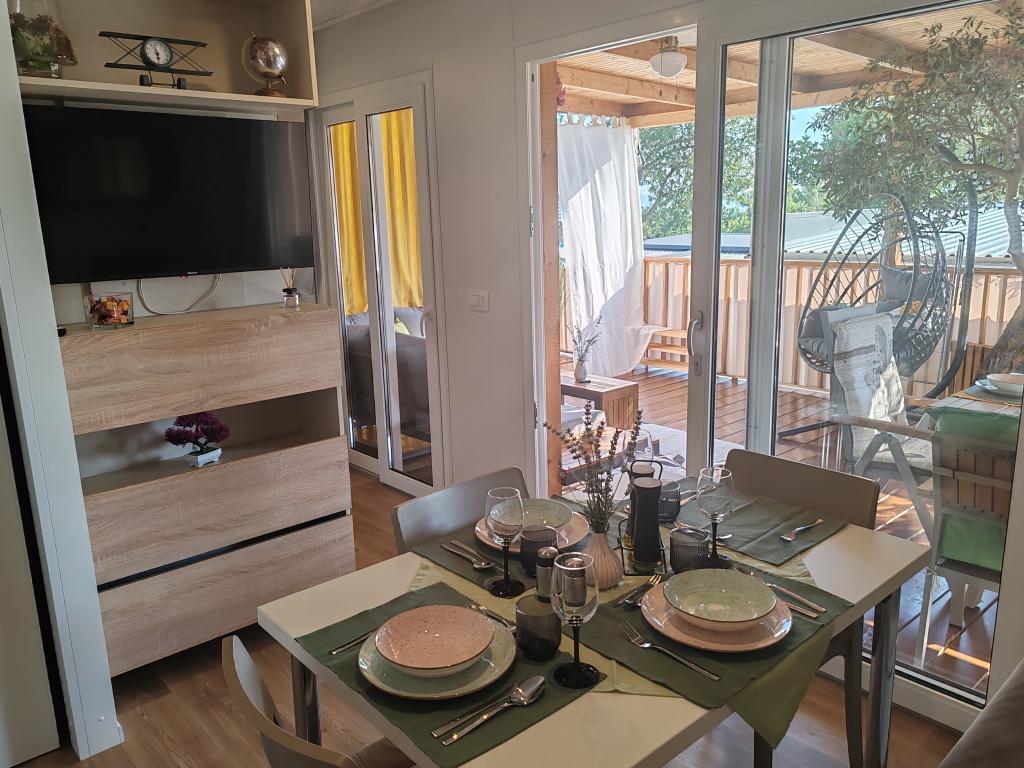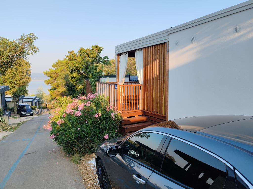 W pełni wyposażony i nowoczesny dom mobilny w doskonałej lokalizacji na znanym i dobrze wyposażonym kempingu, który oferuje wiele udogodnień, szczególnie dla rodzin z dziećmi. Dom o powierzchni 32 m² składa się z 2 sypialni, salonu oraz w pełni wyposażonej kuchni ze wszystkim, czego potrzebujesz, zmywarką, kuchenką mikrofalową, tosterem, ekspresem do kawy Dolce Gusto i czajnikiem. Do dyspozycji Gości są również dwie toalety z prysznicami. Jeden pokój wyposażony jest w łóżko podwójne o wymiarach 160 × 200 cm i własną łazienkę. Drugi pokój wyposażony jest w 2 łóżka pojedyncze o wymiarach 80 × 200 cm. W salonie znajduje się rozkładana sofa dla dwóch osób. Taras o powierzchni 29 m² wyposażony jest w podgrzewane jacuzzi z masażem i miejsca do siedzenia. Dom jest w pełni wyposażony we wszystko, czego potrzebujesz (pościel, ręczniki, kosmetyki itp.). Do dyspozycji Gości jest zewnętrzny grill gazowy. Kompleks basenowy znajduje się zaledwie 100 m dalej, a plaża oddalona jest o ok. 250 m. Do centrum Selc można dojść pieszo w zaledwie 13 minut. Bezpłatny parking prywatny i internet z telewizorem Smart TV (Netflix, YouTube itp.).