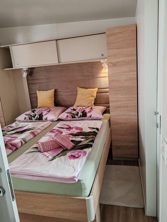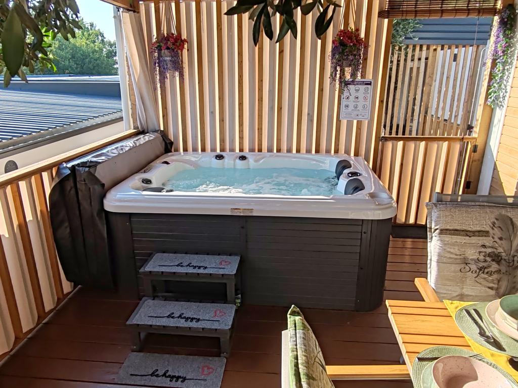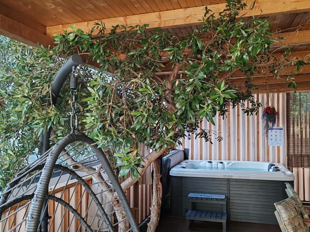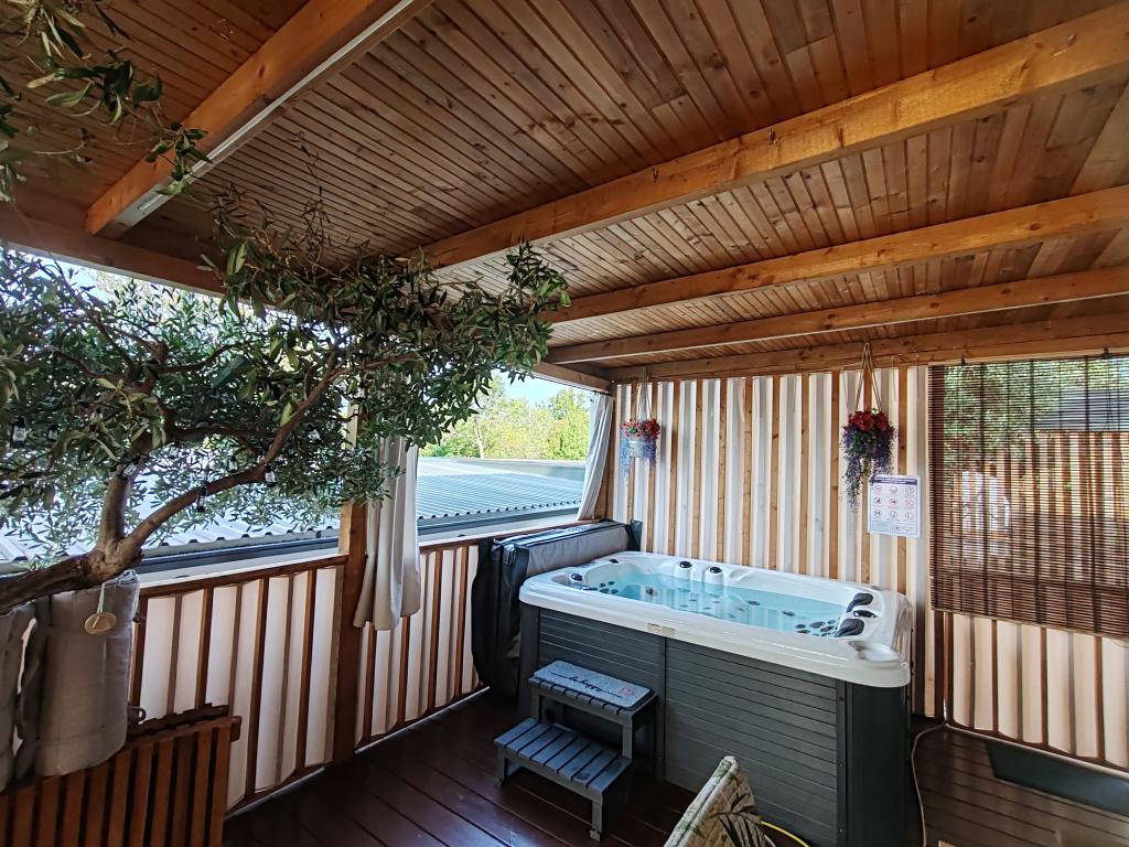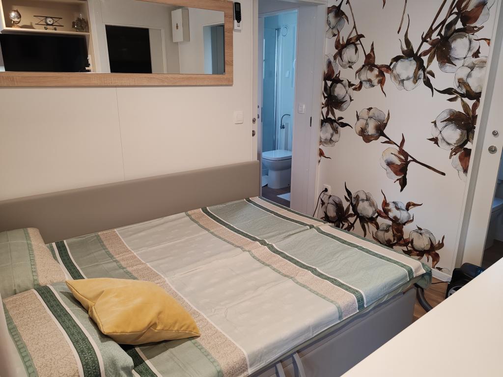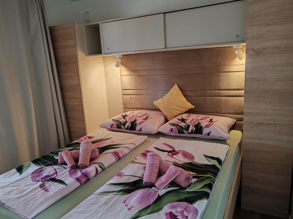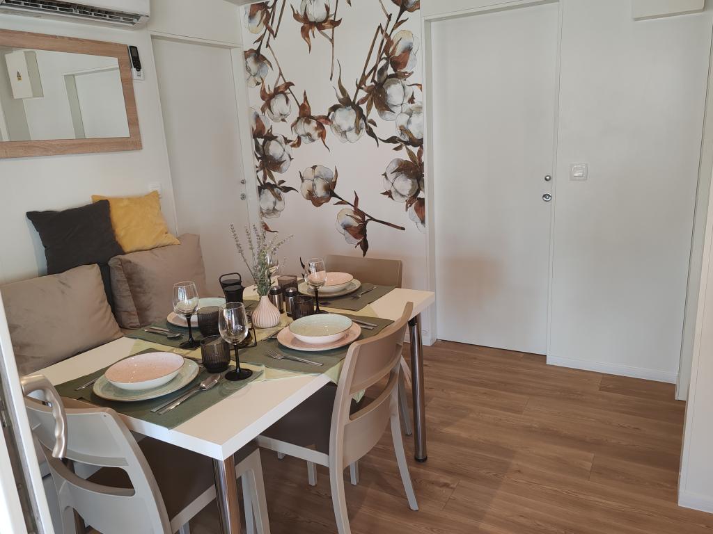 W pełni wyposażony i nowoczesny dom mobilny w doskonałej lokalizacji na znanym i dobrze wyposażonym kempingu, który oferuje wiele udogodnień, szczególnie dla rodzin z dziećmi. Dom o powierzchni 32 m² składa się z 2 sypialni, salonu oraz w pełni wyposażonej kuchni ze wszystkim, czego potrzebujesz, zmywarką, kuchenką mikrofalową, tosterem, ekspresem do kawy Dolce Gusto i czajnikiem. Do dyspozycji Gości są również dwie toalety z prysznicami. Jeden pokój wyposażony jest w łóżko podwójne o wymiarach 160 × 200 cm i własną łazienkę. Drugi pokój wyposażony jest w 2 łóżka pojedyncze o wymiarach 80 × 200 cm. W salonie znajduje się rozkładana sofa dla dwóch osób. Taras o powierzchni 29 m² wyposażony jest w podgrzewane jacuzzi z masażem i miejsca do siedzenia. Dom jest w pełni wyposażony we wszystko, czego potrzebujesz (pościel, ręczniki, kosmetyki itp.). Do dyspozycji Gości jest zewnętrzny grill gazowy. Kompleks basenowy znajduje się zaledwie 100 m dalej, a plaża oddalona jest o ok. 250 m. Do centrum Selc można dojść pieszo w zaledwie 13 minut. Bezpłatny parking prywatny i internet z telewizorem Smart TV (Netflix, YouTube itp.).