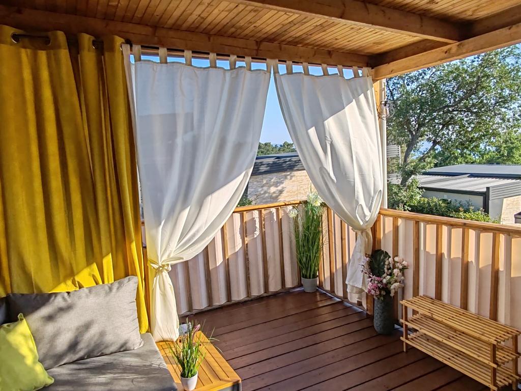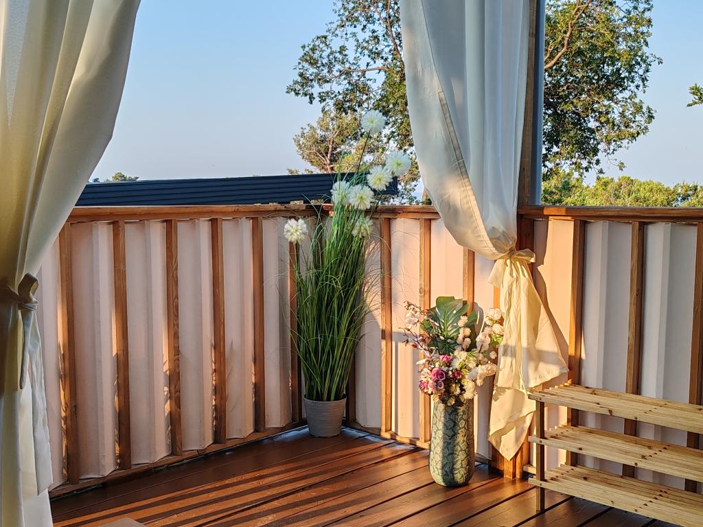 Piękny domek mobilny, w którym poczujesz się jak w domu, ponieważ posiada wysokiej jakości wyposażenie, od łóżek po kuchnię i piękny taras, co zapewnia pełną anonimowość. Sympatyczni właściciele również zapewnili miłe powitanie.