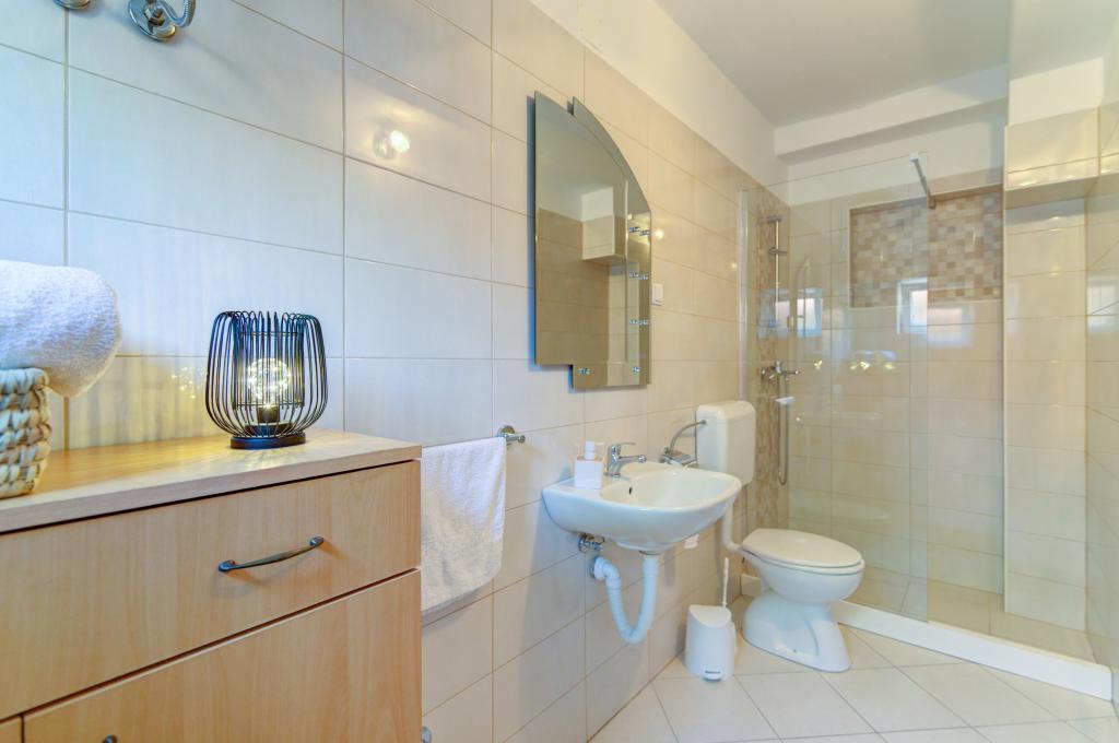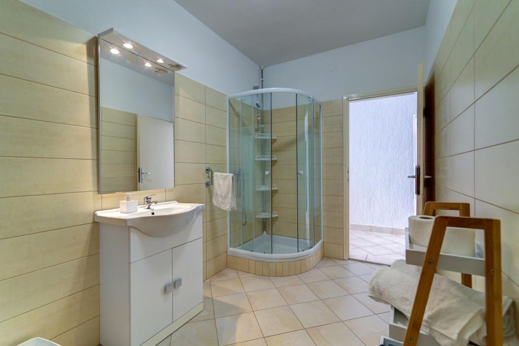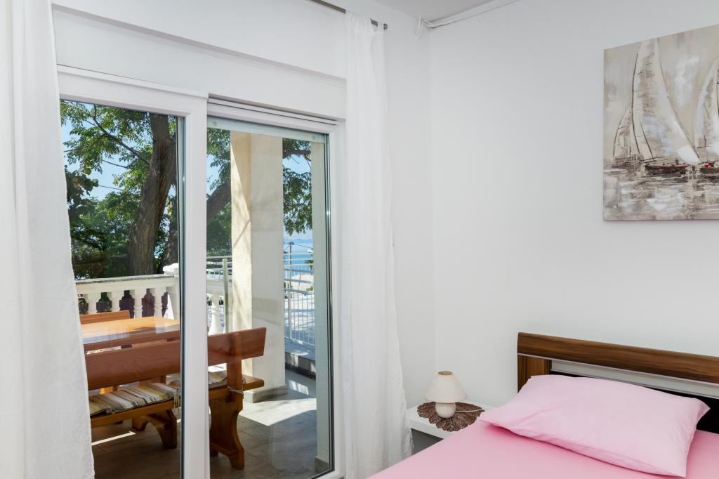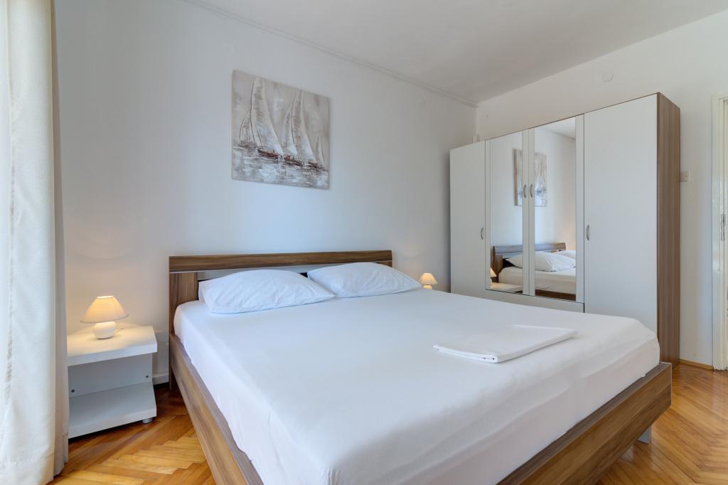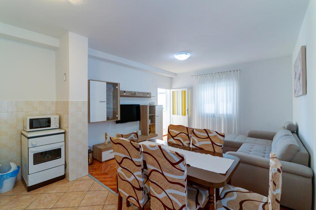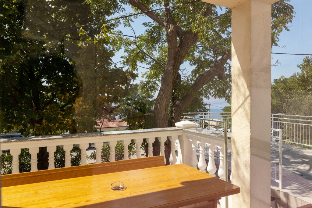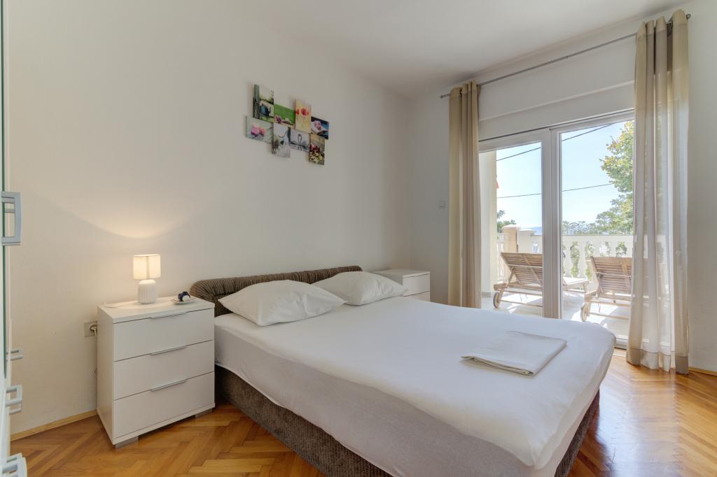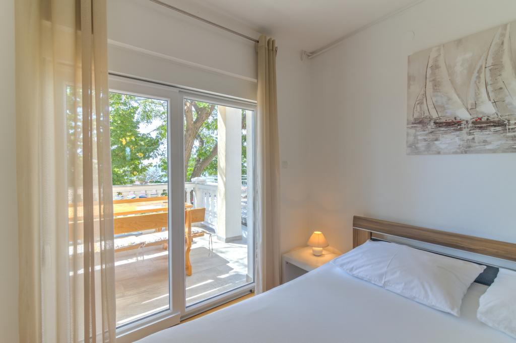 Nowocześnie wyposażony Apartament Marta (pow. 100 m2) dla 7 osób znajduje się na parterze rodzinnego domu otoczonego zielenią i posiada dwa duże pokoje z podwójnymi łóżkami z pięknym widokiem na morze, jeden przestronny pokój z trzema łóżkami, dwa łazienki z prysznicem i WC, przestronny salon z dostawką, jadalnia i kuchnia połączona z zadaszoną altaną i grillem. Tylko dla gości tego apartamentu przeznaczona jest duża zadaszona altana (pow. 40 m2) z grillem i miejscami do siedzenia dla 8 osób oraz dwa tarasy (pow. 50 m2) z widokiem na morze, wyposażone w miejsca do siedzenia i dwa leżaki. Przed apartamentem znajduje się zagospodarowany ogród z dwoma dużymi drzewami, trawą i kwiatami oraz trzy bezpłatne miejsca parkingowe. Obiekt położony jest w spokojnej części miasta, 10 minut spacerem do pierwszej plaży i centrum miasta.