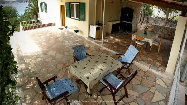 MIESZKANIE W DOMU NA WYBRZEŻU, Z FANTASTYCZNYM WIDOKIEM, Z DALEKO OD TŁUMU! Apartament Merara znajduje się tuż nad brzegiem morza, w zatoce Stari Trogir między Marina i Rogoznica, Trogir i Primošten. Jest daleko od osady, co zapewnia spokój i radość w naturalnym środowisku sosen. Dostęp jest możliwy samochodem i łodzią. Dostępny jest parking na dwa samochody i miejsce do cumowania łodzi, a także dodatkowe miejsce do kotwiczenia w pobliżu domu. W dwóch sypialniach i salonie może zamieszkać do 6 osób. Łazienka z WC, kuchnia z jadalnią, kominek z grillem na dużym tarasie ze wspaniałym widokiem. Ogród z roślinnością śródziemnomorską to jedyna rzecz, która oddziela dom od morza. Chociaż jest odizolowany, dzięki systemowi energii słonecznej i generatorowi prądu, jest tam cały komfort, do którego jesteś przyzwyczajony: ciepła woda, telewizja / SAT, prąd, WiFi itp.