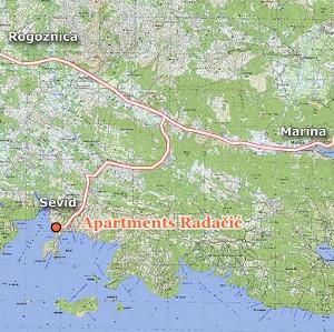 Radačić Apartamenty położone są w małej miejscowości Sevid. Z dala od zgiełku codziennych obszarach miejskich, to małe miasto oferuje nieskażonej przyrody, krystalicznie czystej wody i cichej okolicy. W najbliższej wpisanego na listę UNESCO miasta z bogatej historii i ciekawych zabytków, Split, Trogir, Sibenik i parków narodowych Kornati i Krka. Oferujemy zakwaterowanie w dwóch apartamentach. Apartament A4 wyposażona jest w dwa podwójne sypialnie, łazienka (prysznic / WC) oraz kuchnia / pokój dzienny z rozkładaną sofą dla jednej osoby. Apartament A4 +2 obejmuje dwie sypialnie, kuchnia / pokój dzienny z rozkładaną sofą dla dwóch osób, oraz dwie łazienki (prysznic / WC). Wszystkie apartamenty posiadają TV / Sat, oddzielny taras, dostęp do ogrodu z grillem oraz bezpłatny parking. Plaża jest mniej niż 20 metrów od domu, a sam dom jest w pierwszym rzędzie do morza. W bezpośrednim sąsiedztwie restauracji, kawiarni i sklepów. Goście mogą korzystać z małej łódki, w porozumieniu z właścicielem (za opłatą).